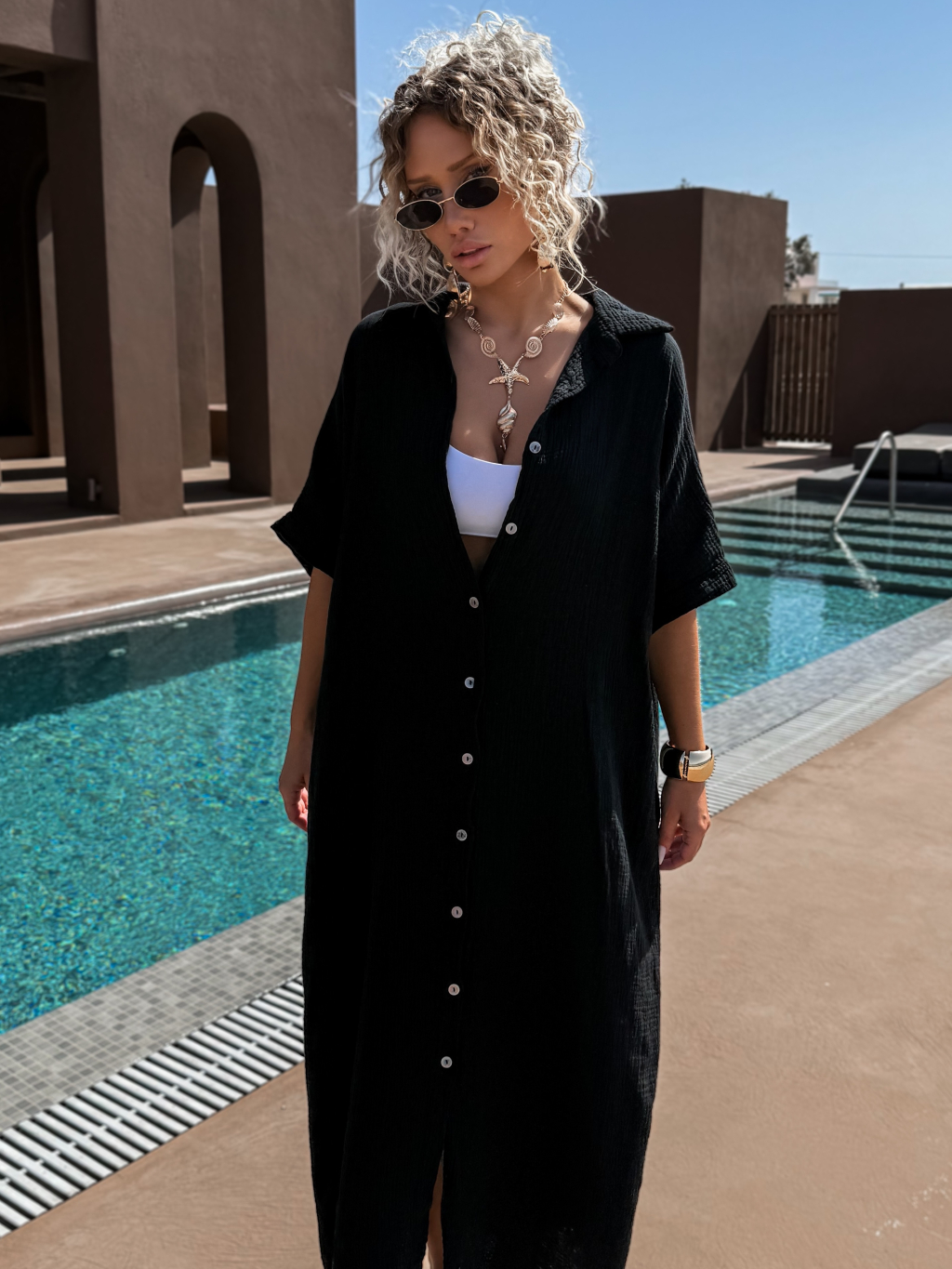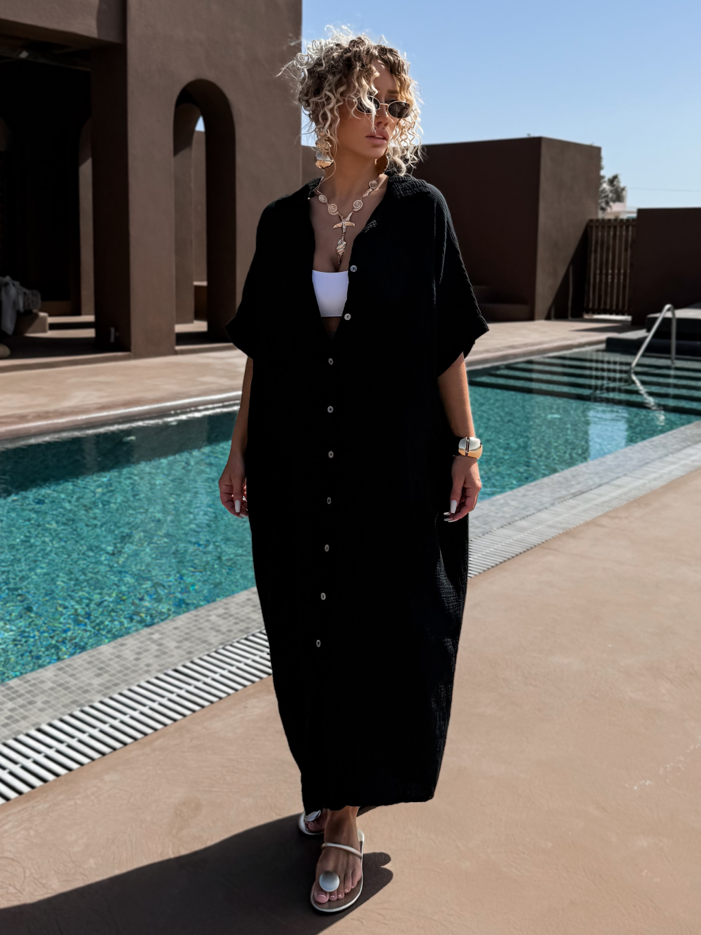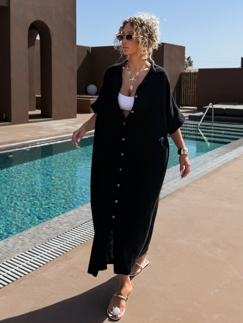 Čierne dlhé mušelínové košeľové maxi šaty NUKET