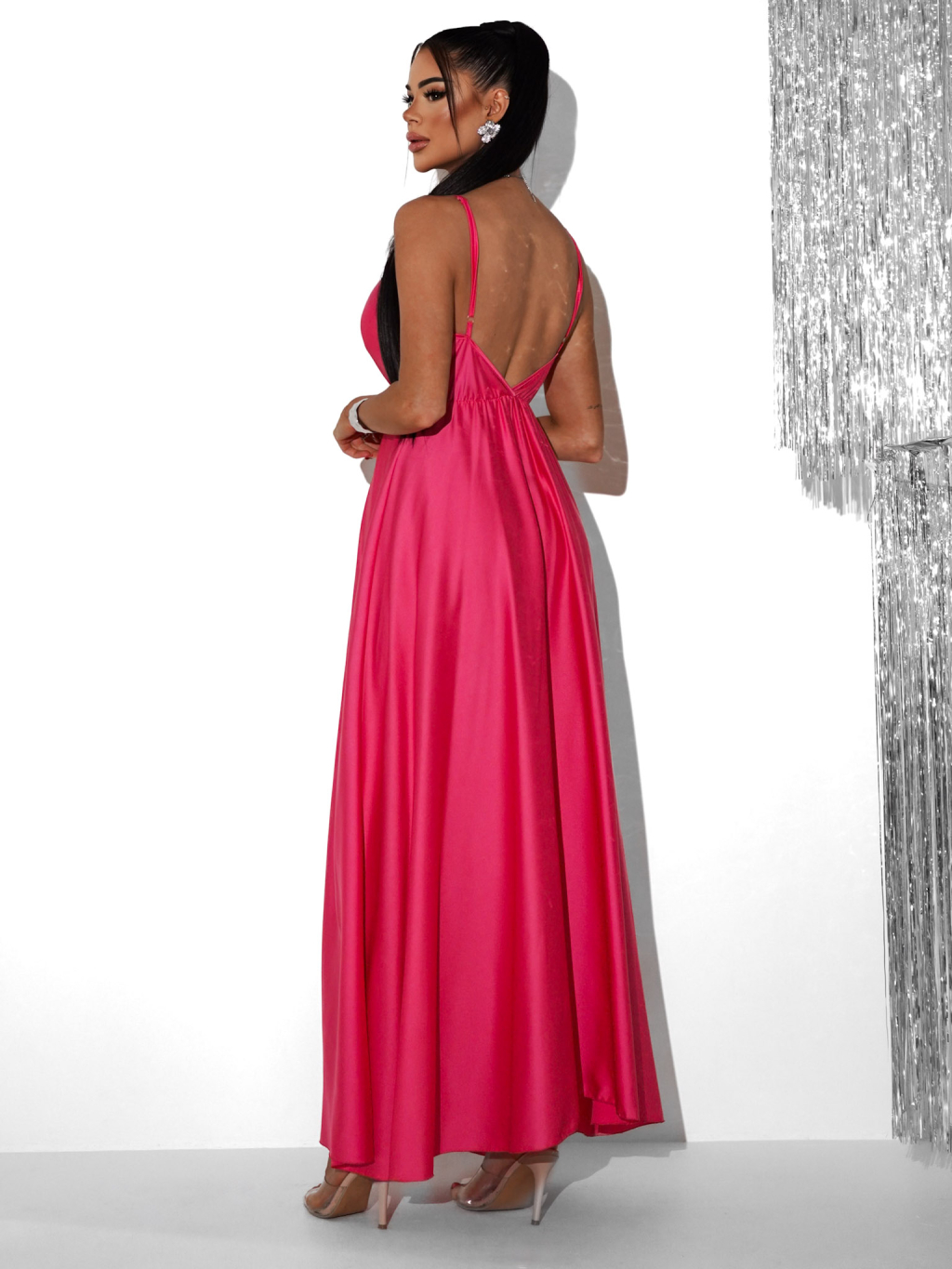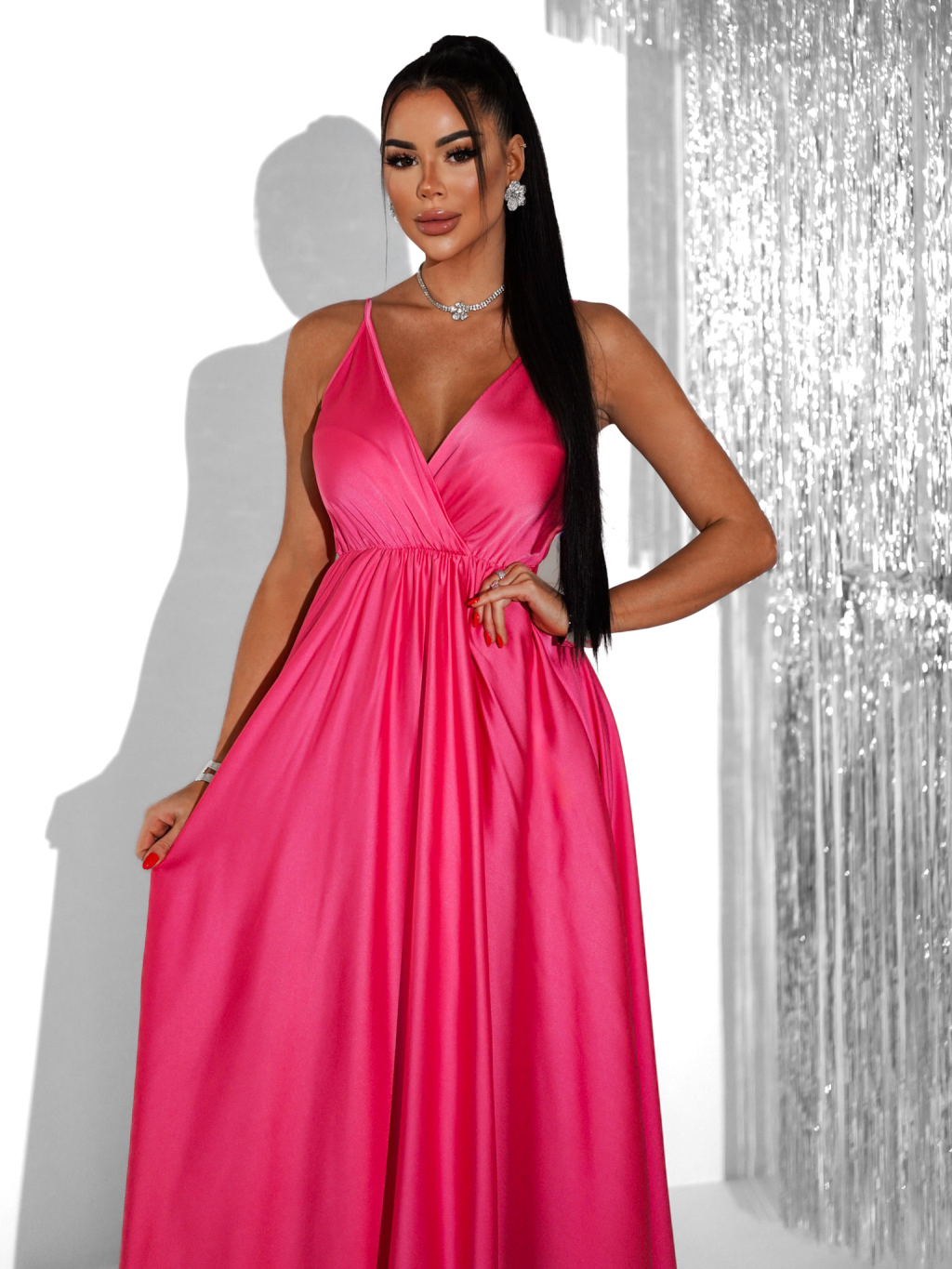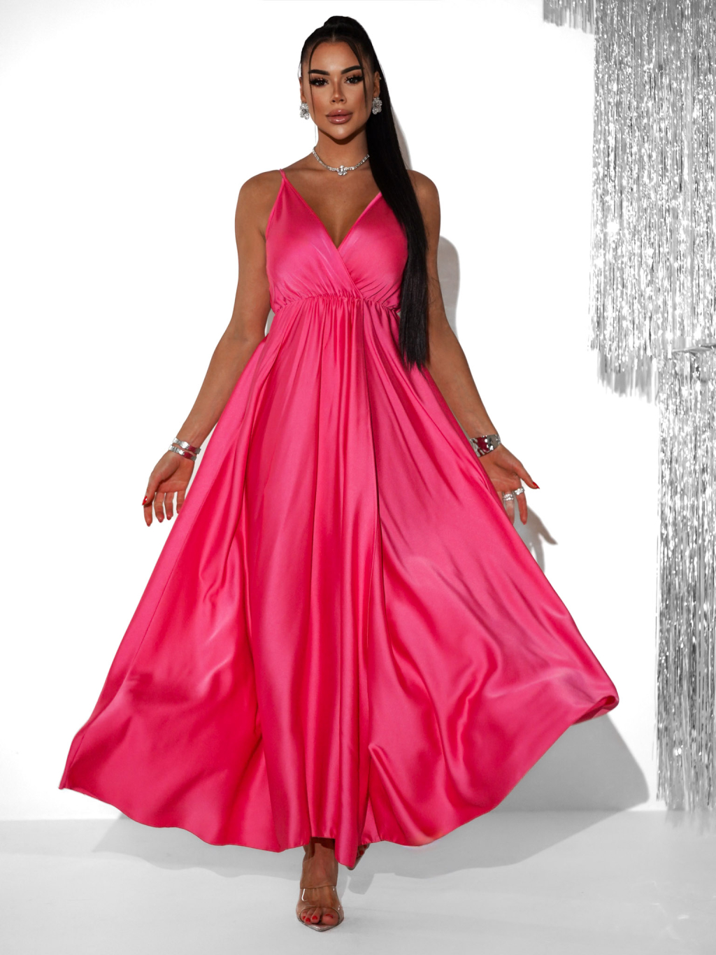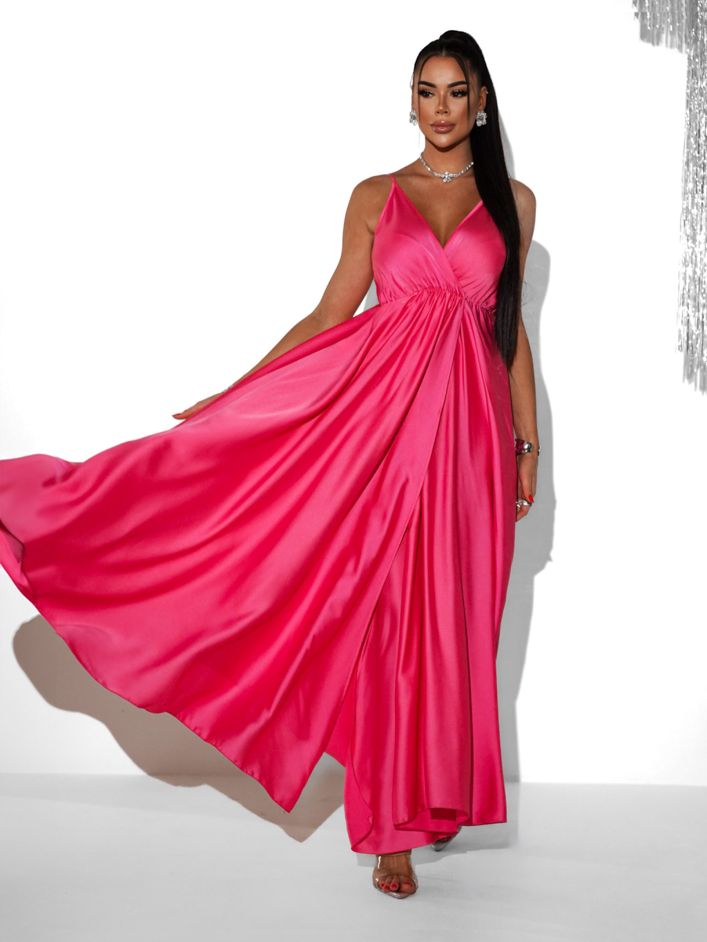 Ružové dlhé saténové šaty PERFECTLY s výstrihom