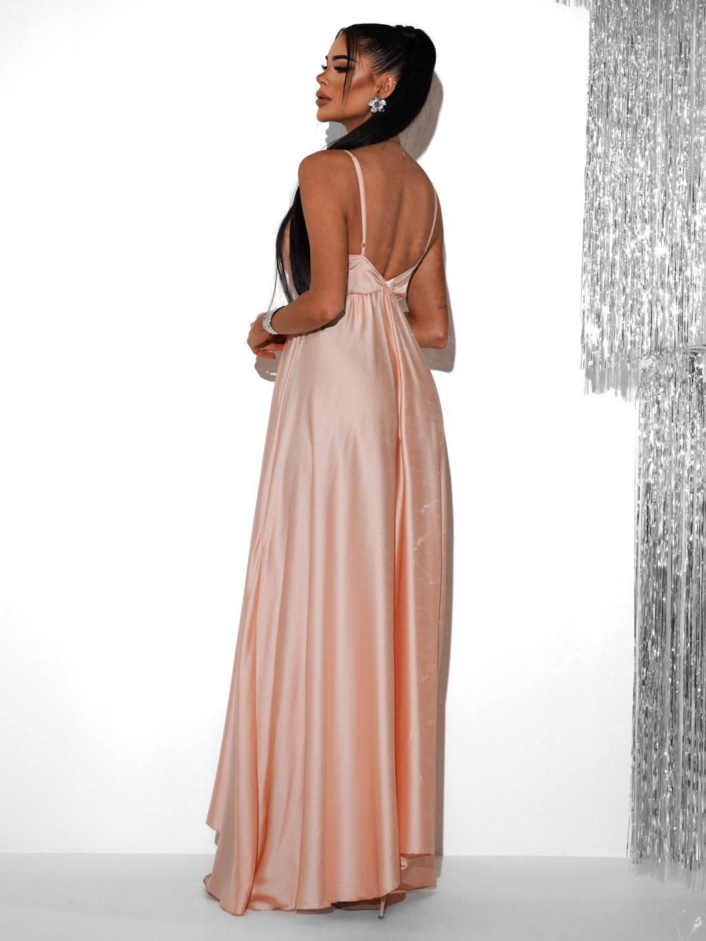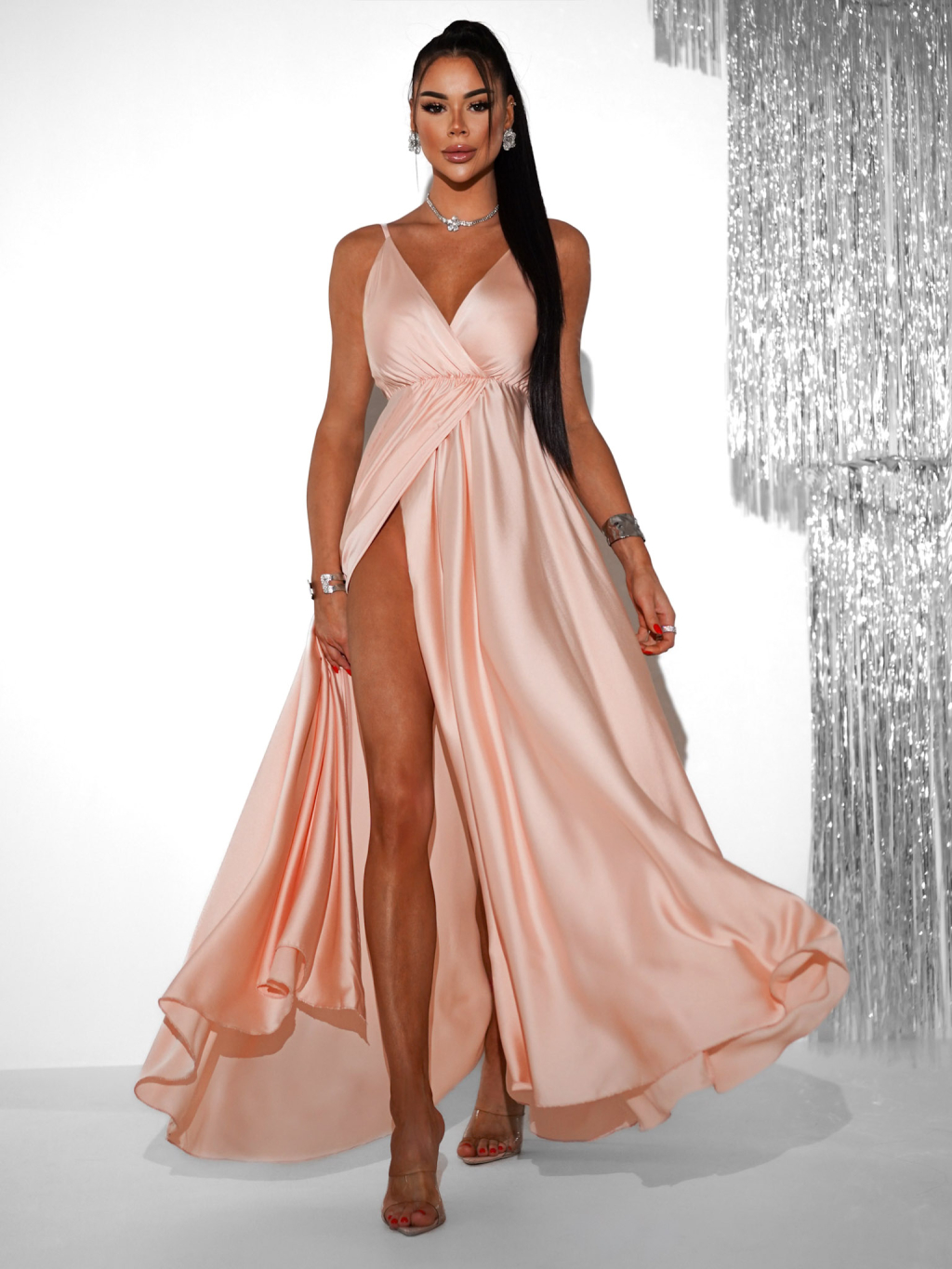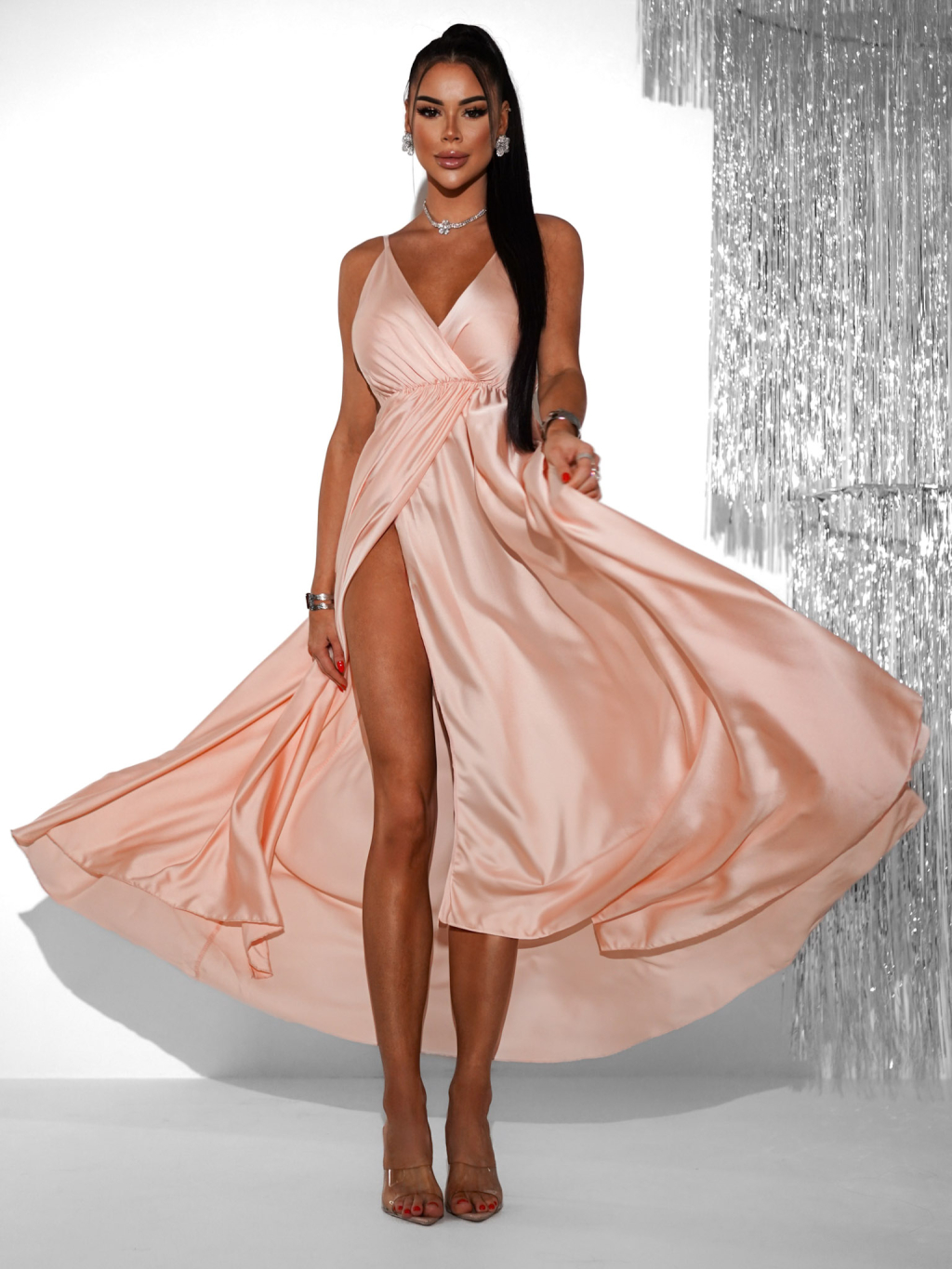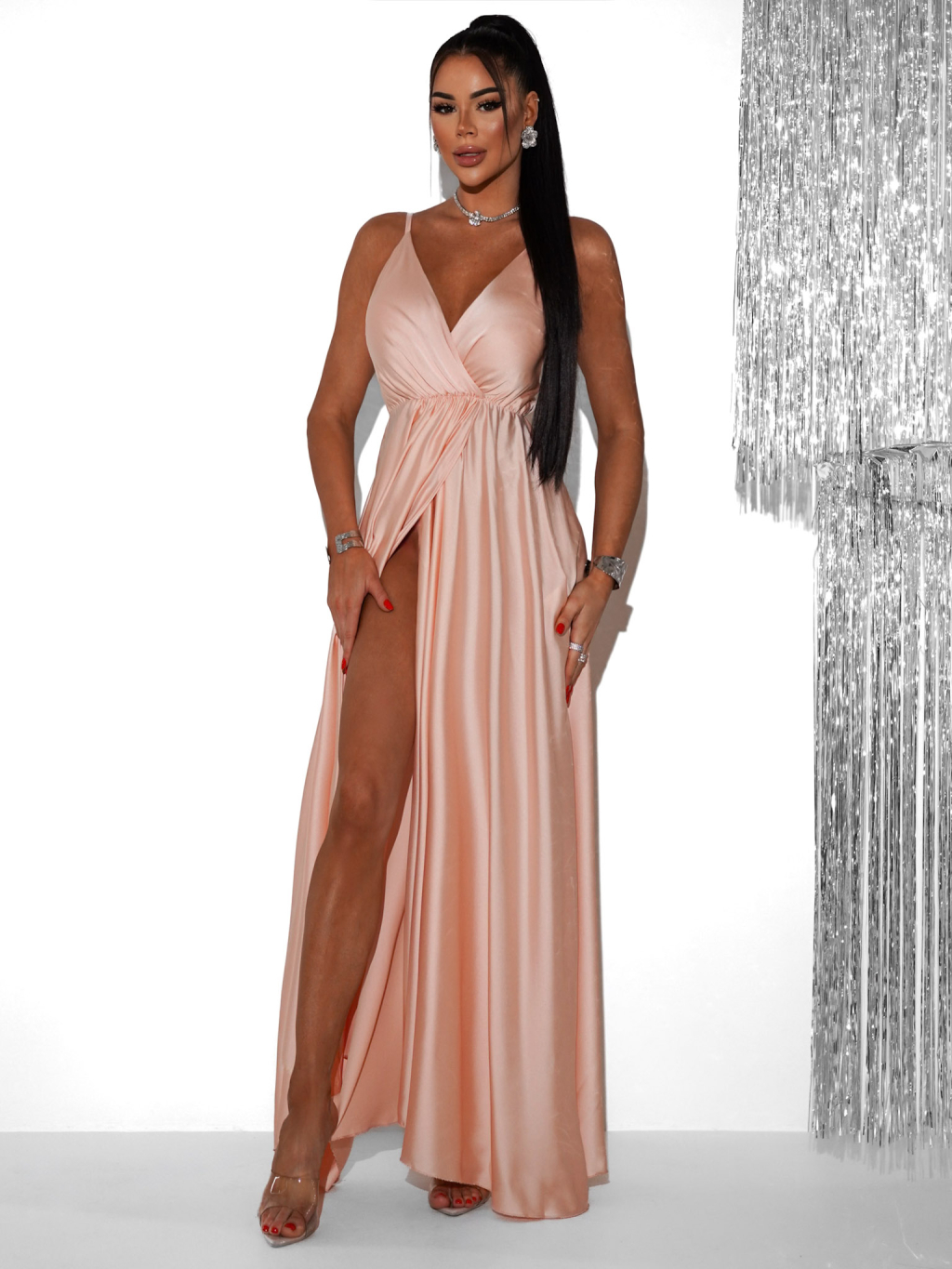 Svetloružové dlhé lesklé šaty PERFECTLY s výstrihom