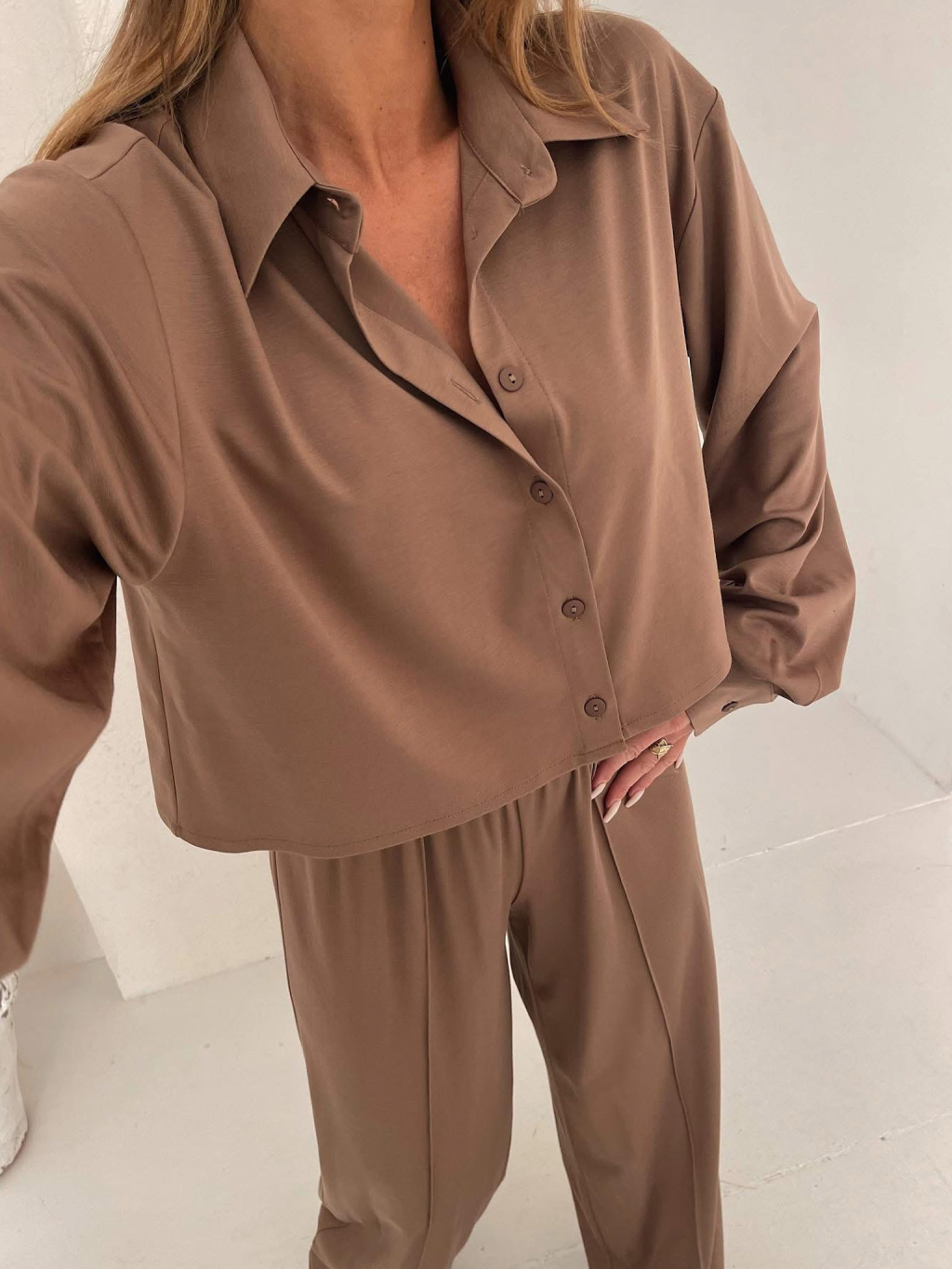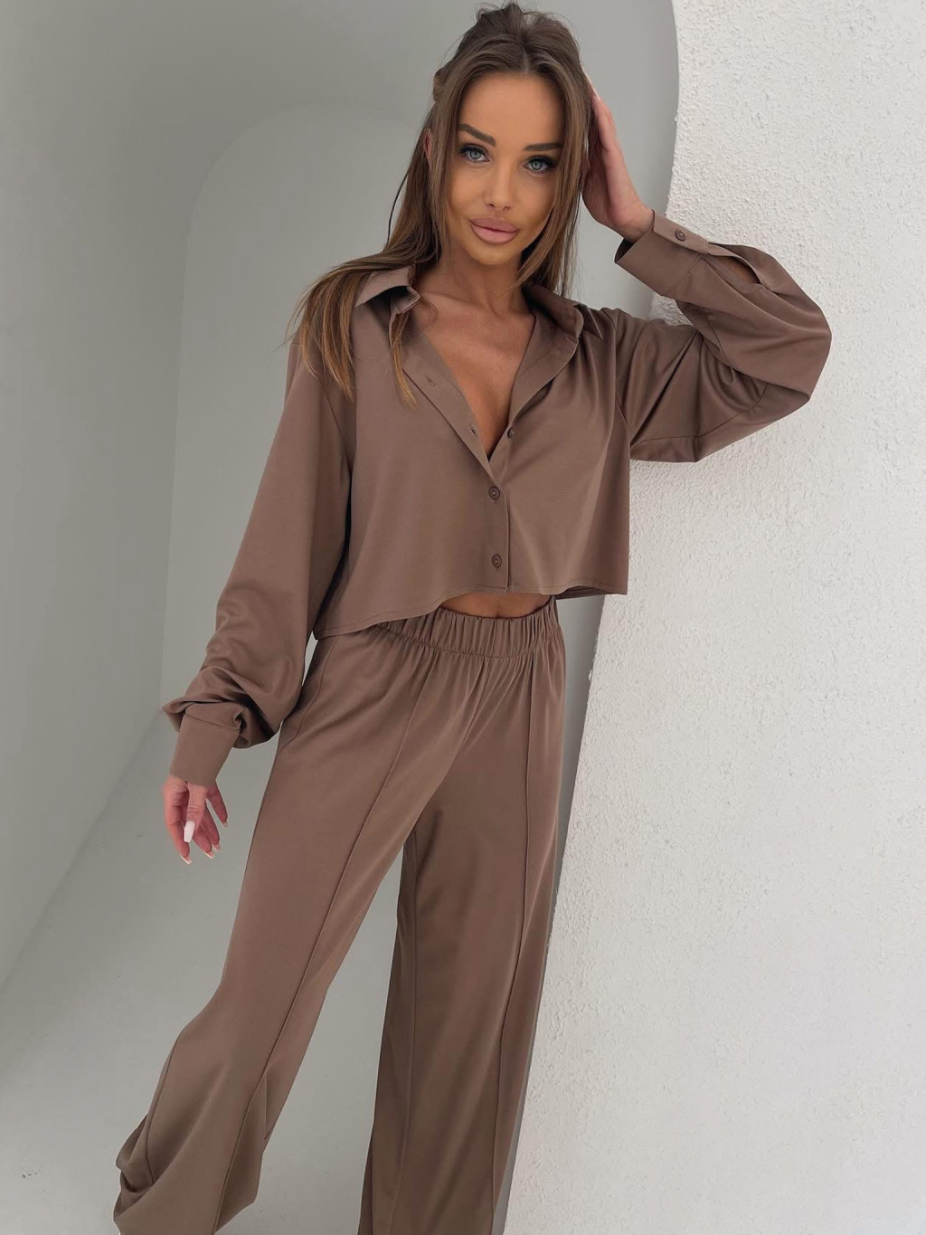 Hnedý nohavicový elegantný komplet COLEMYA