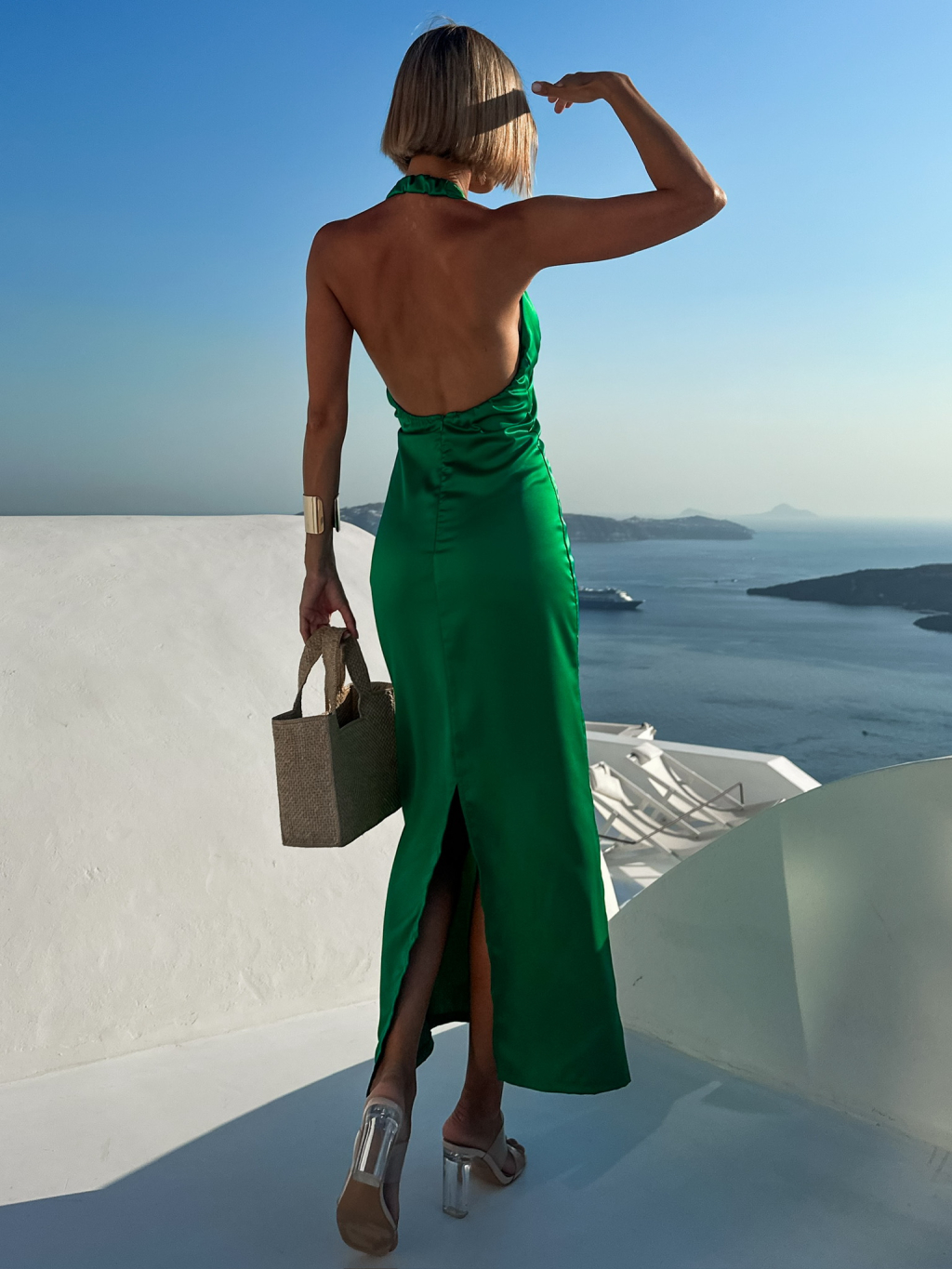 Zelené dlhé saténové šaty THILDE s holým chrbtom