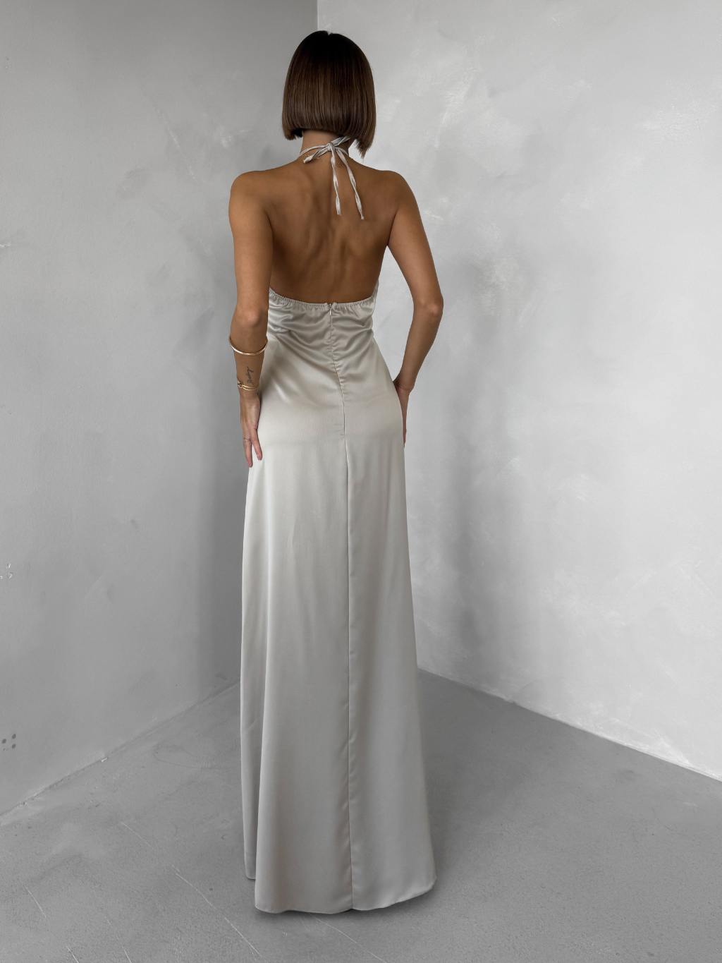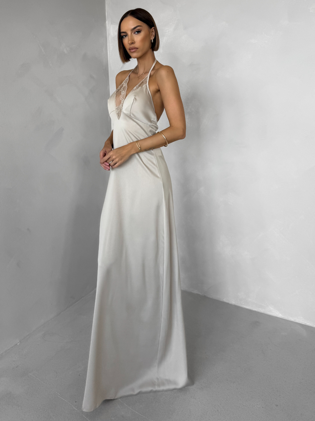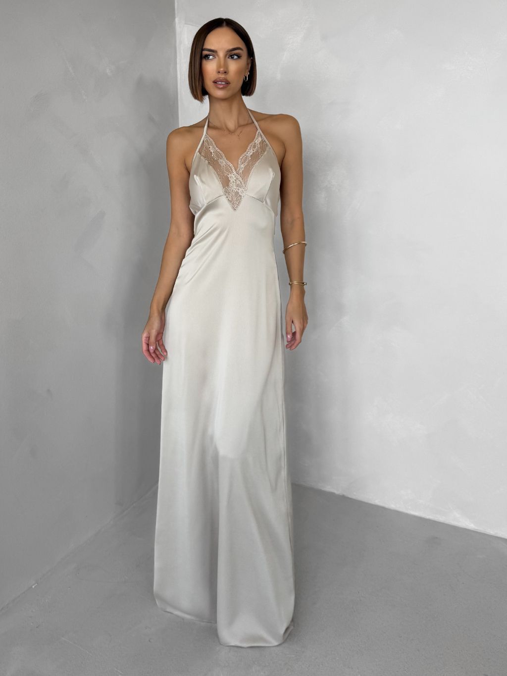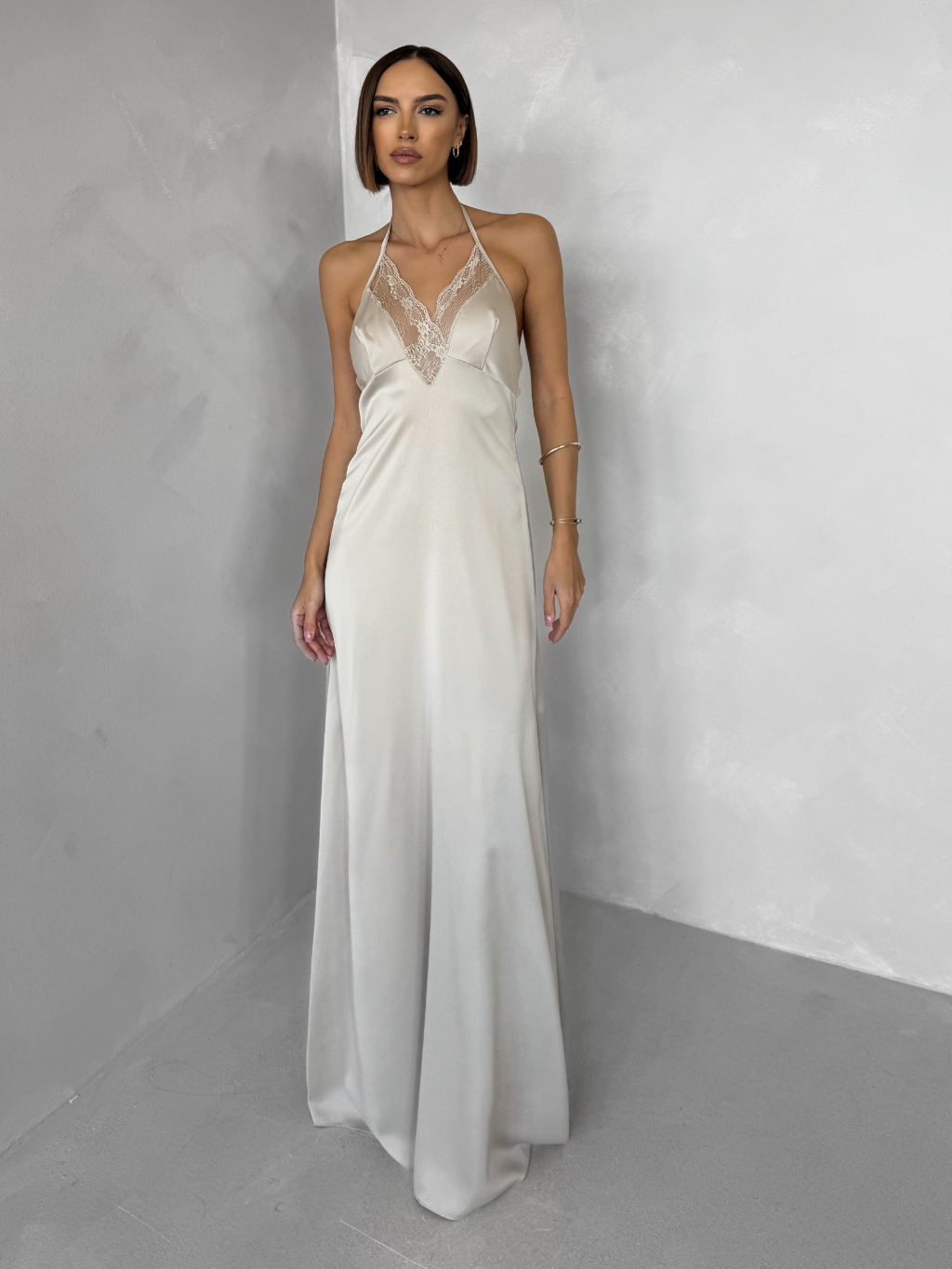 Béžové dlhé saténové šaty FORTYK s čipkou