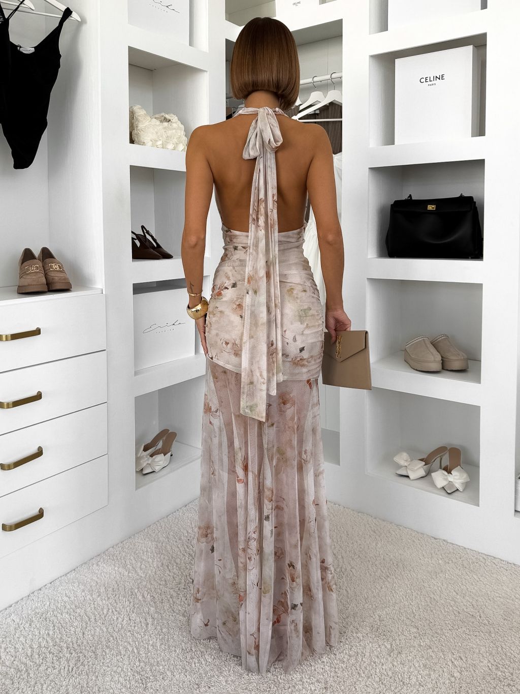 Béžové elegantné dlhé kvetinové šaty FENAY