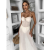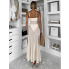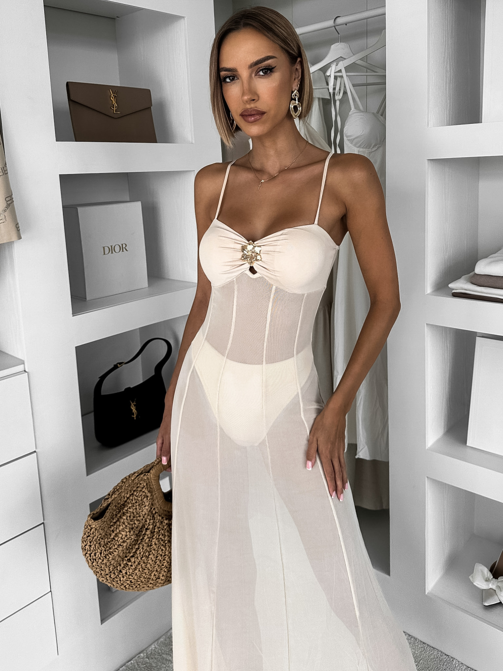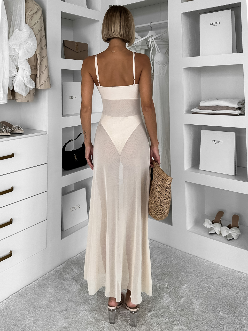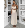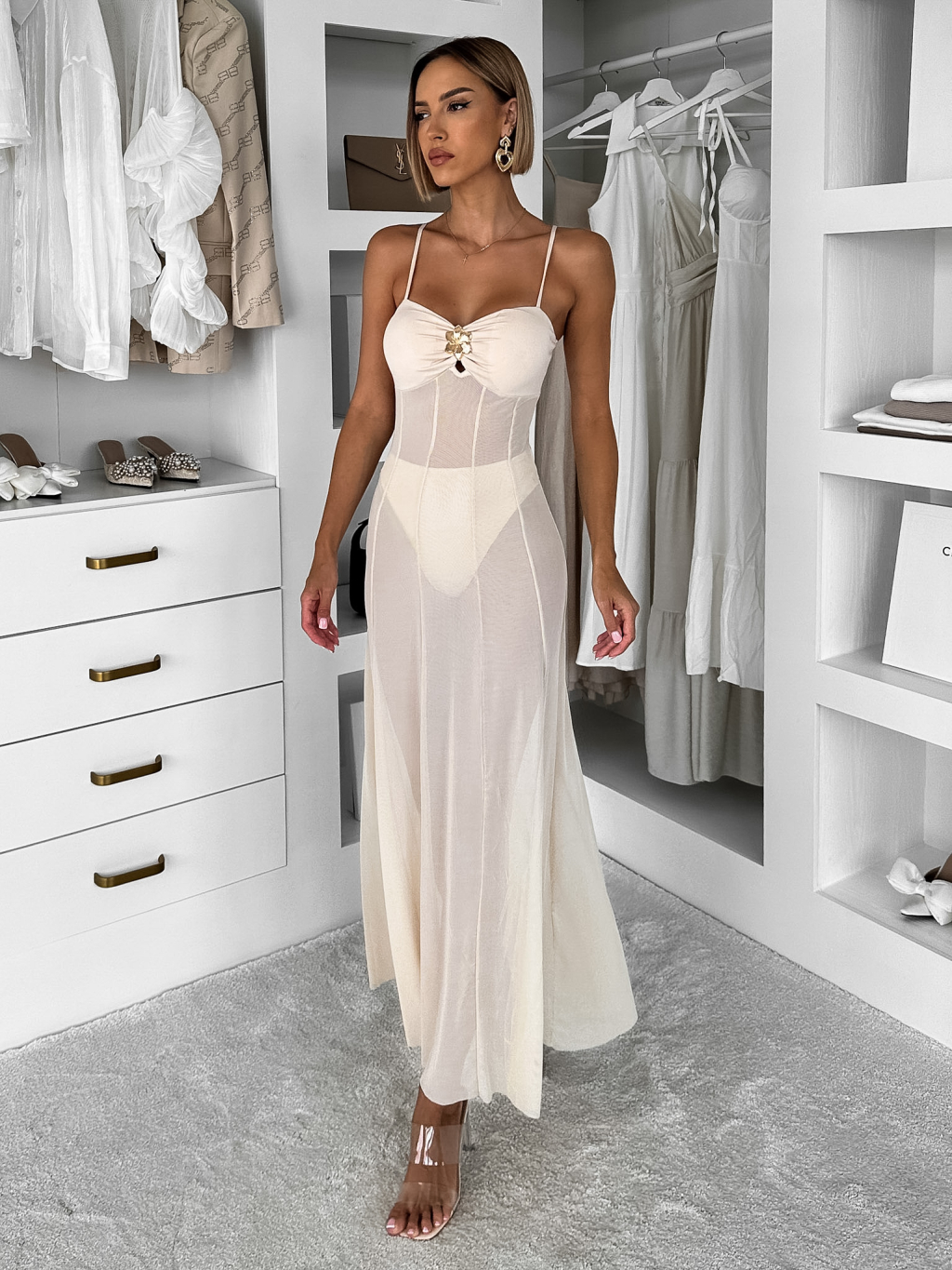 Béžové elegantné priehľadné dlhé šaty EMVARK