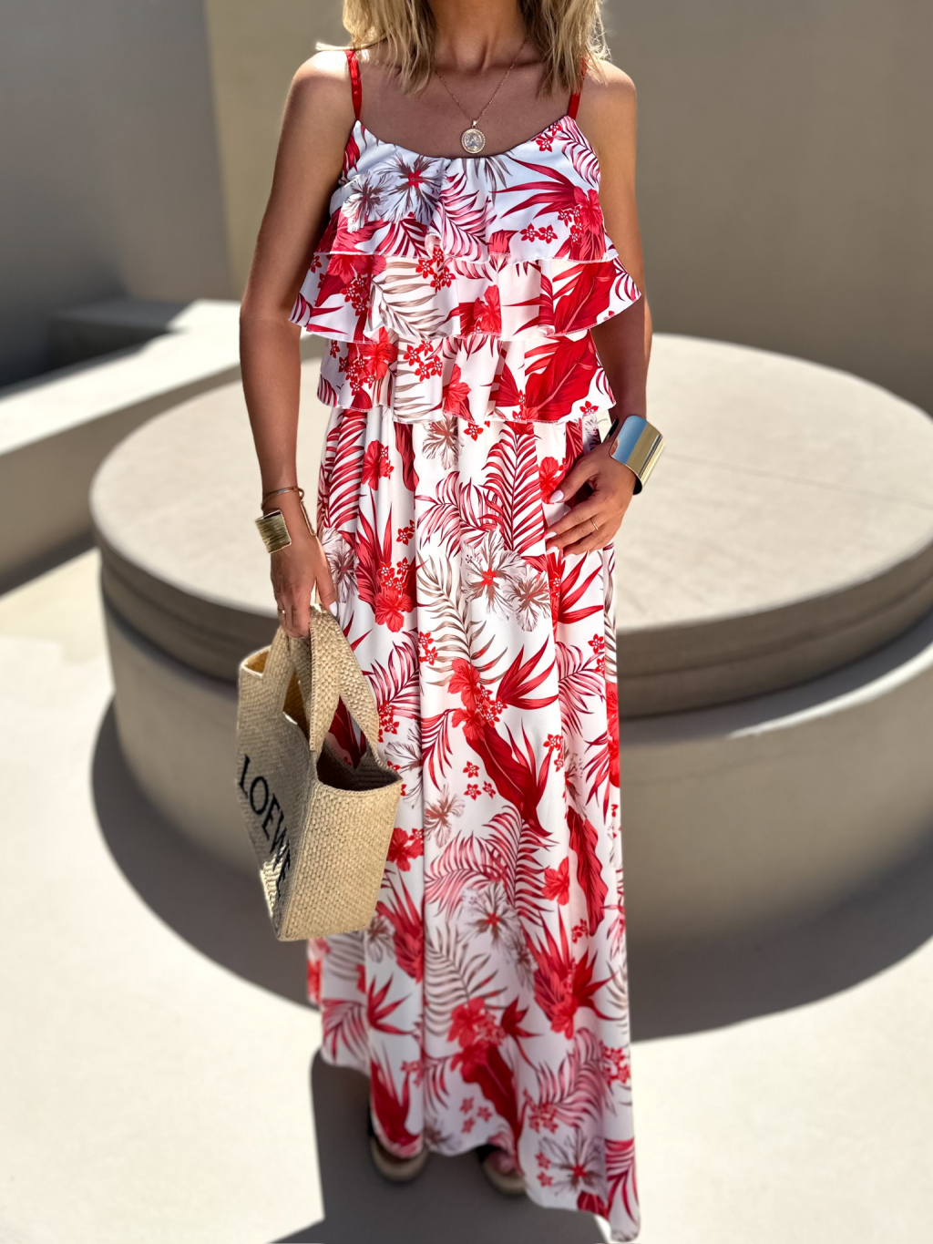 Červené dlhé elegantné šaty EFRAIM s volánikmi