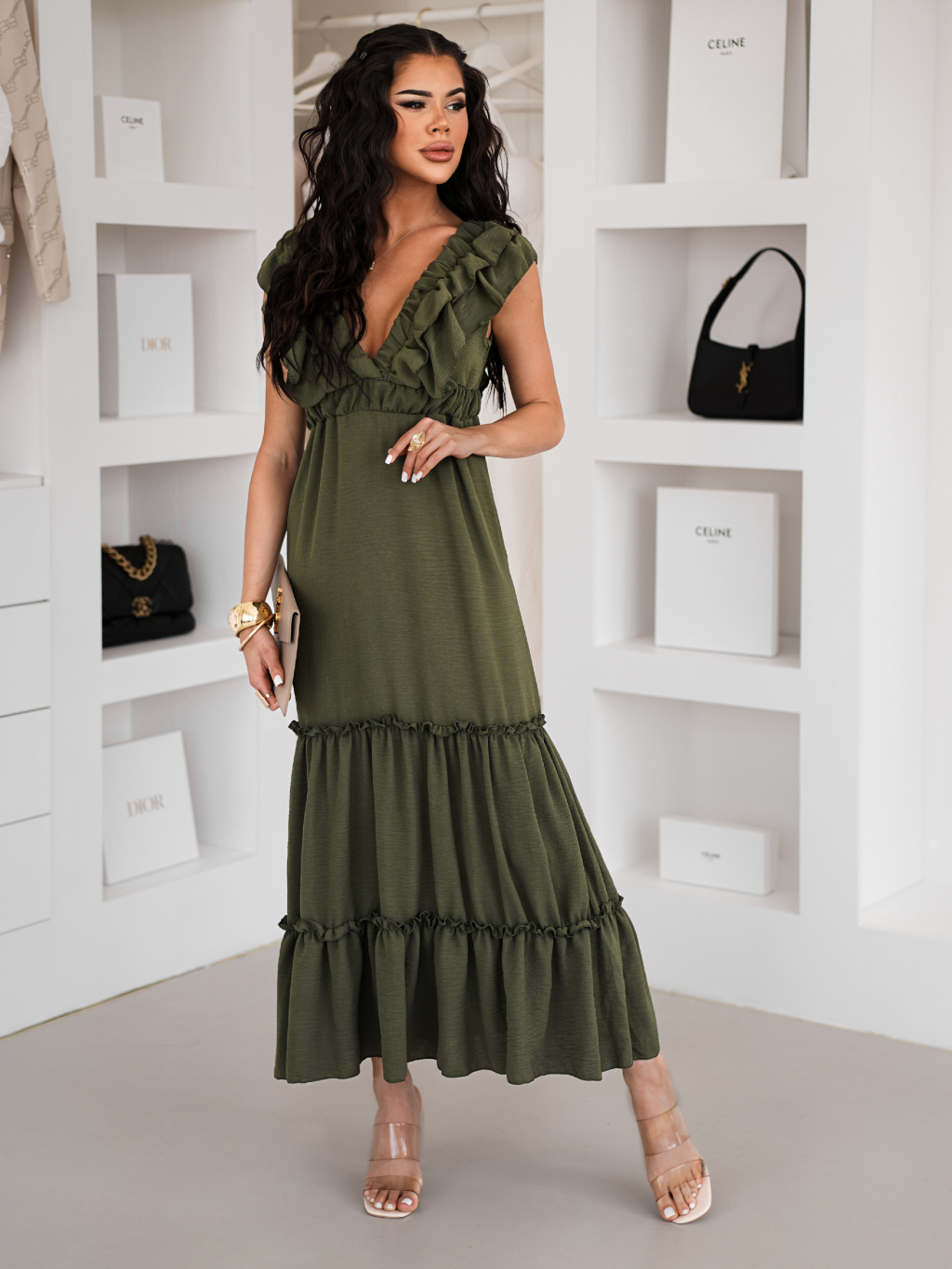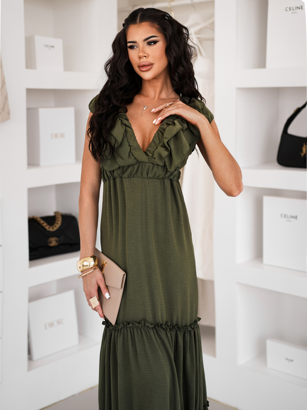 Kaki dlhé letné šaty BLANQE s volánikmi
