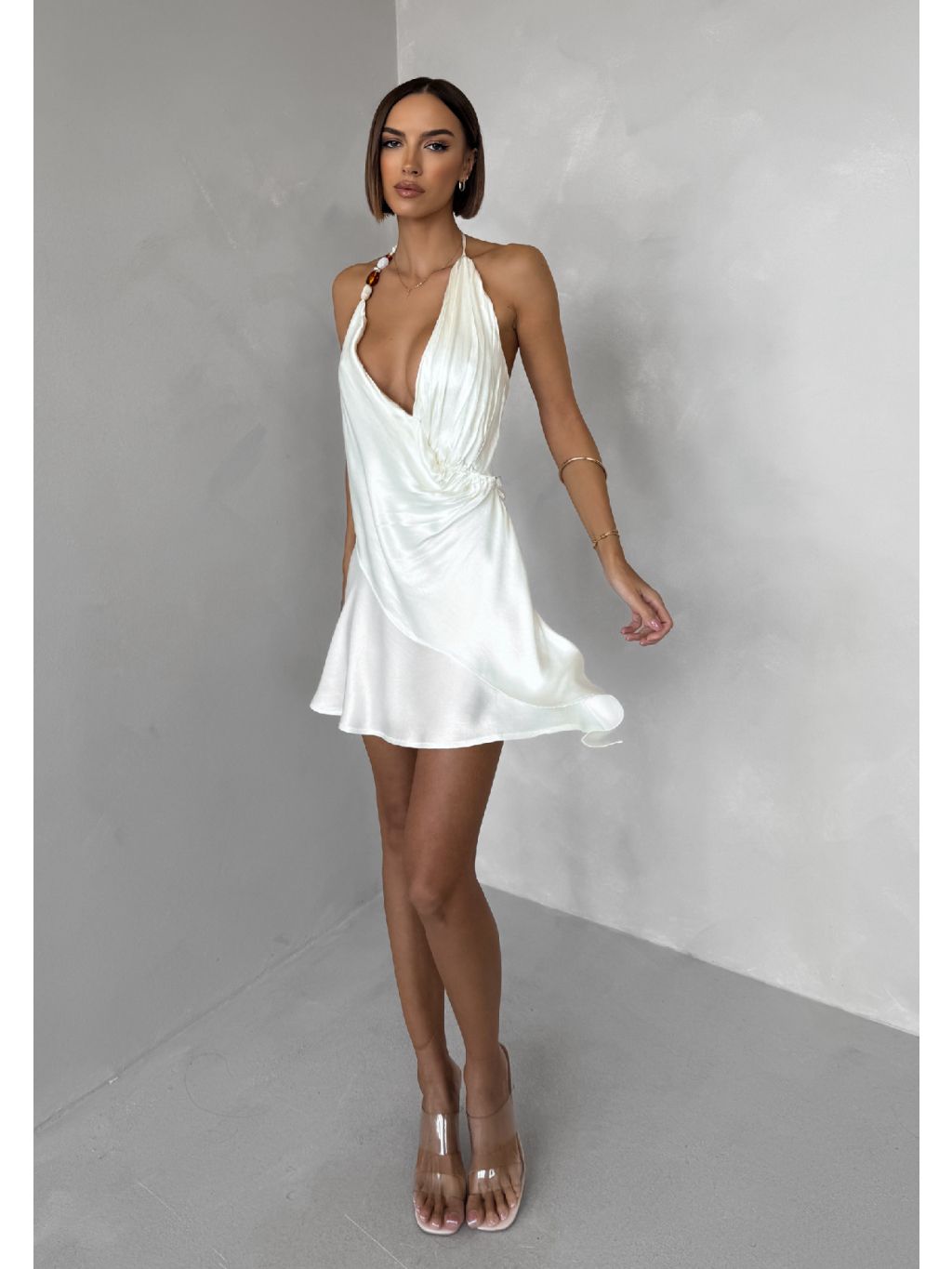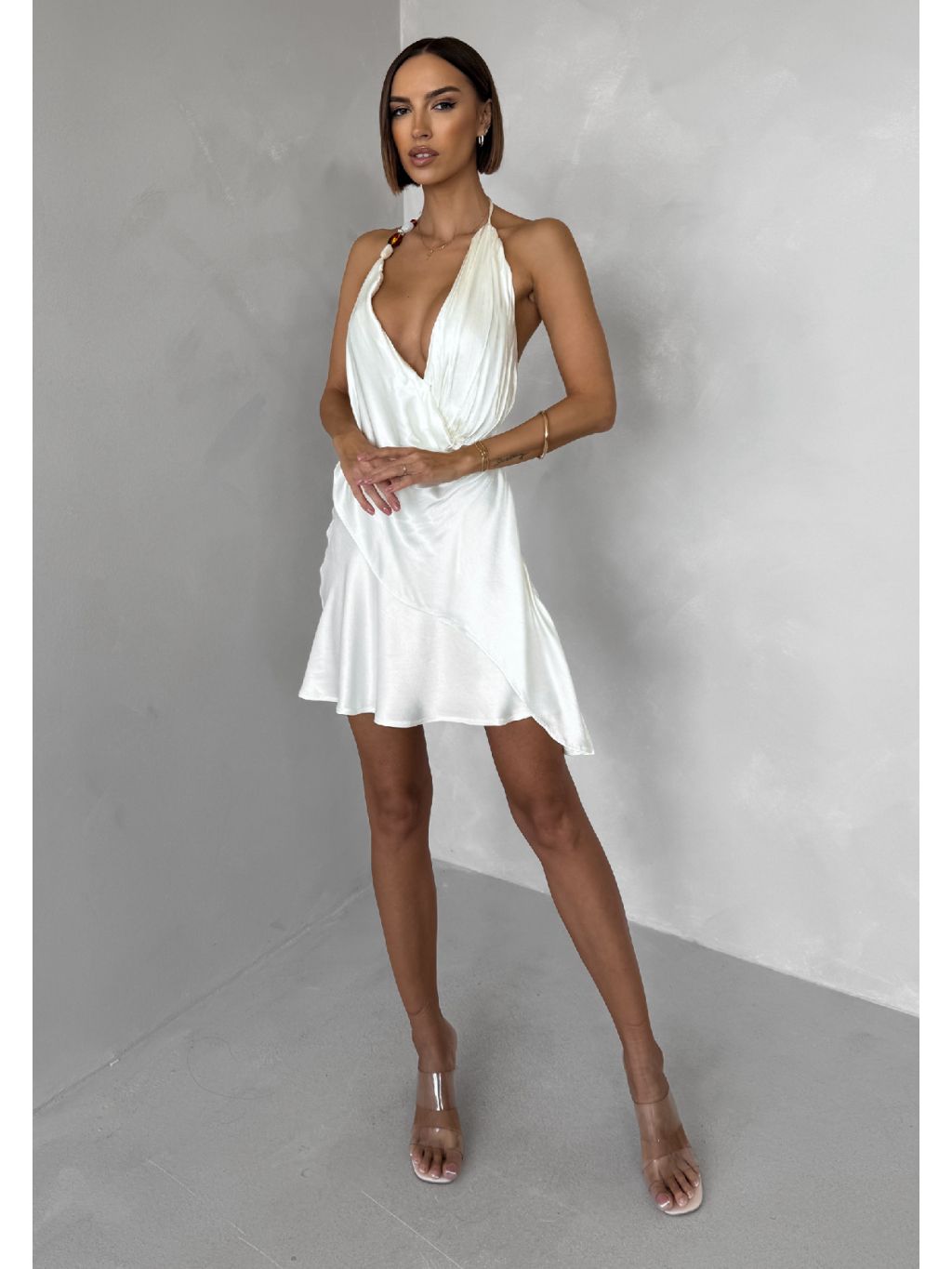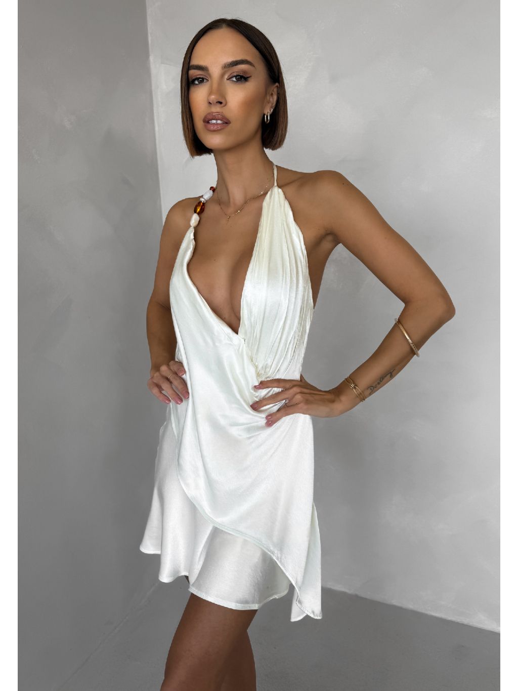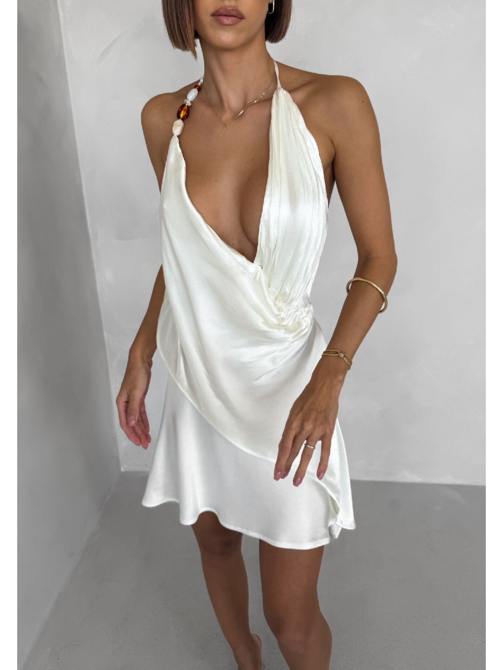 Krémové krátke koktailové saténové šaty AMESTIA