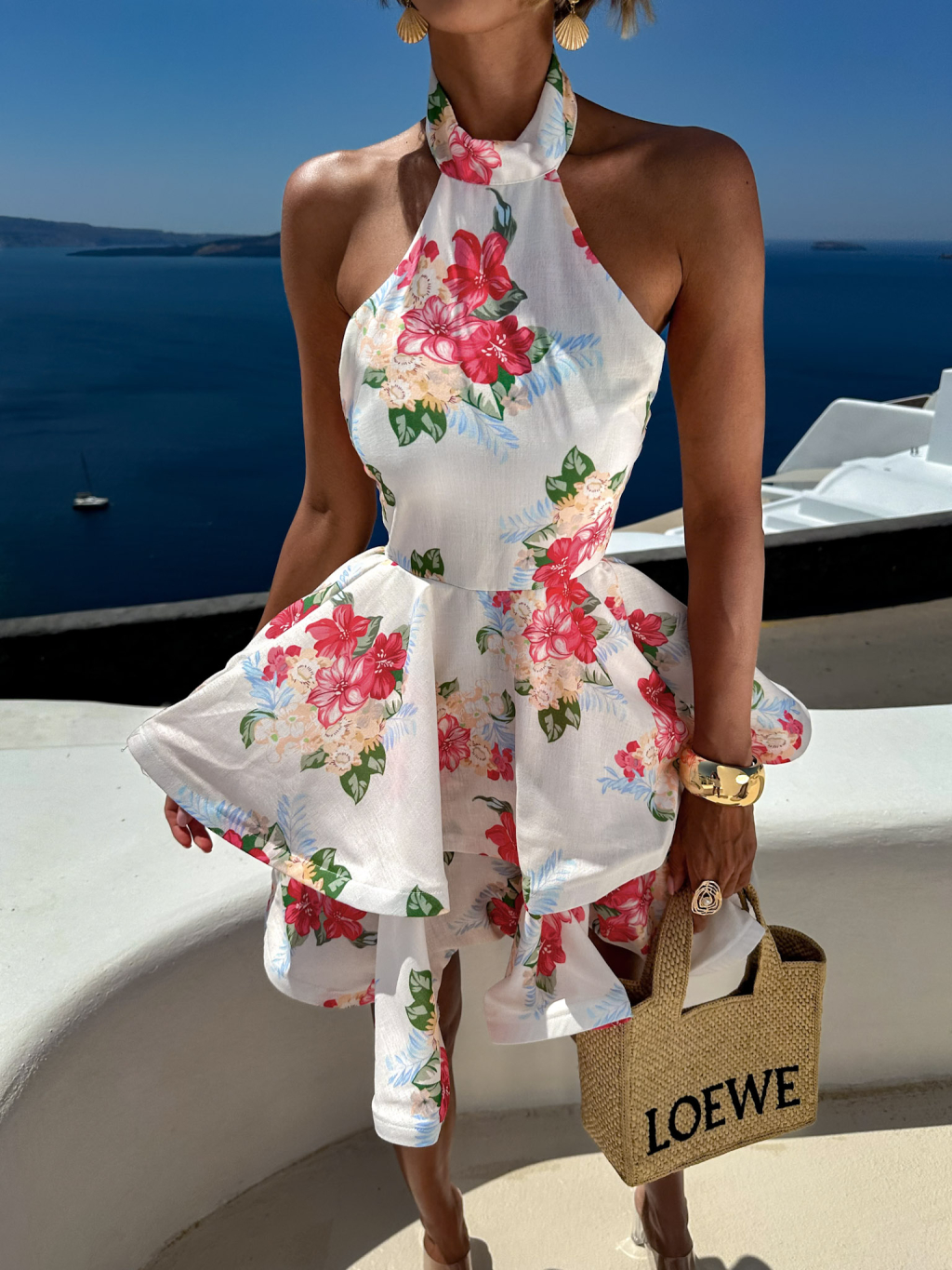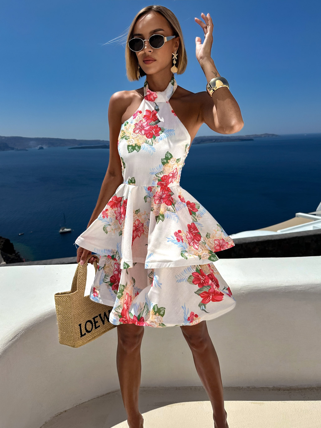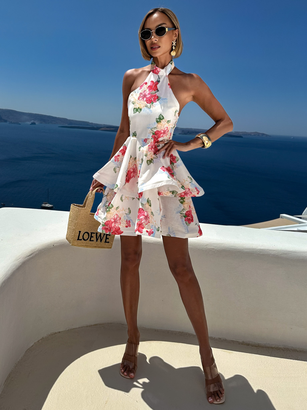 Krémové kvetinové krátke šaty FLORENY s volánmi