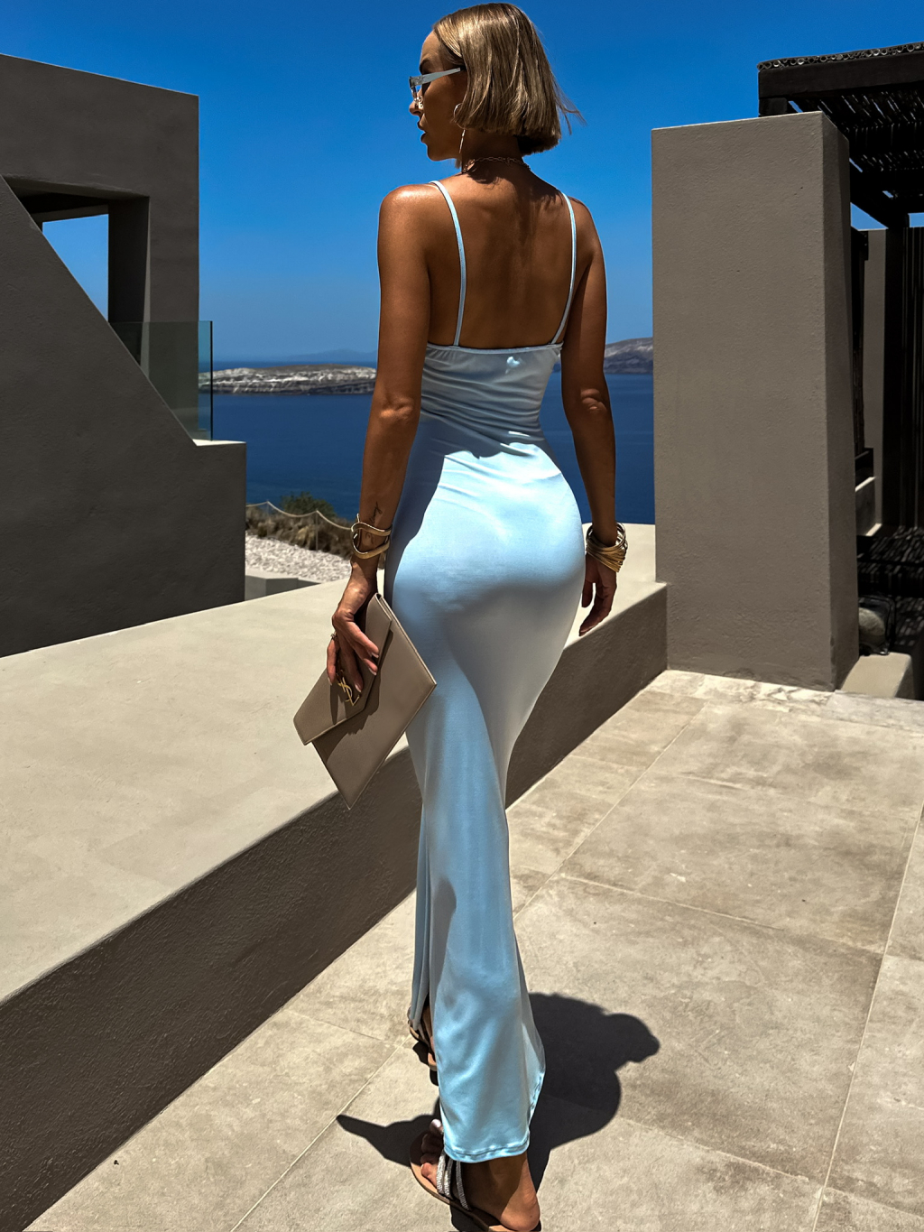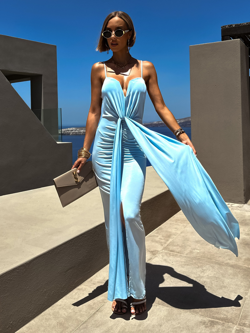 Modré dlhé elegantné šaty DIMIS s výstrihom