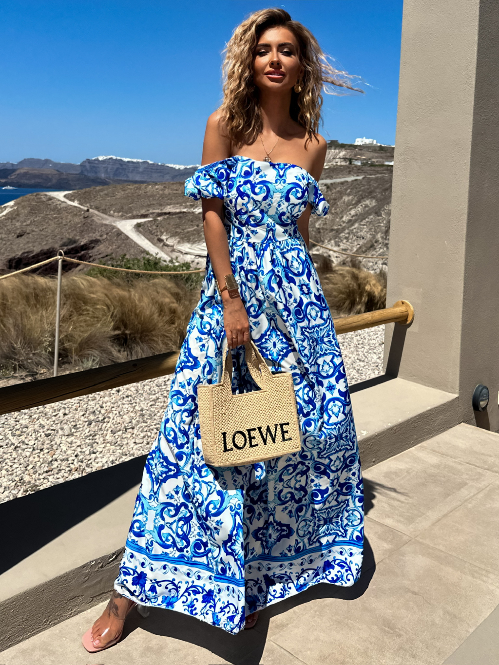 Modré dlhé šaty ILJIC s krátkym rukávom a vzormi