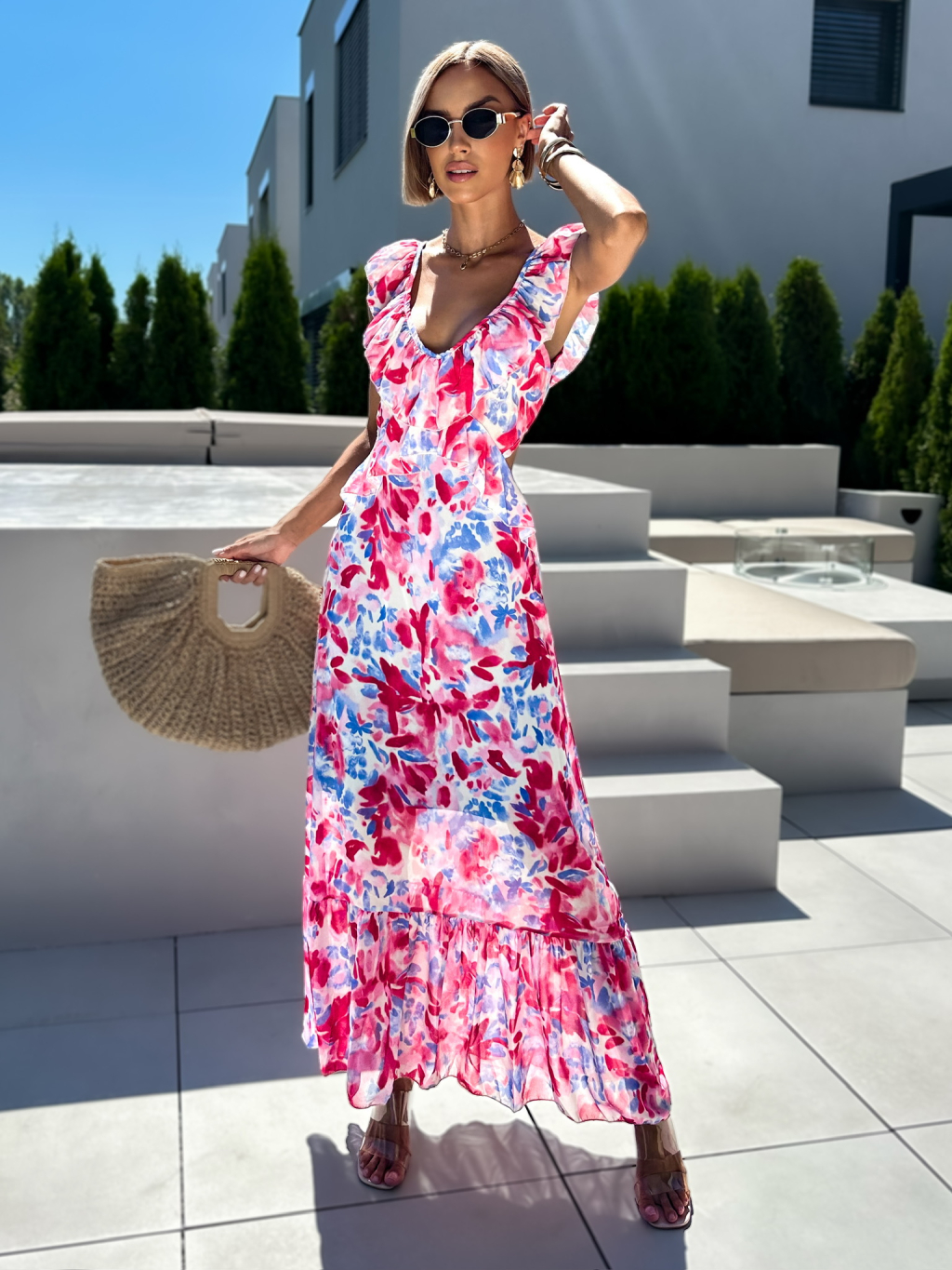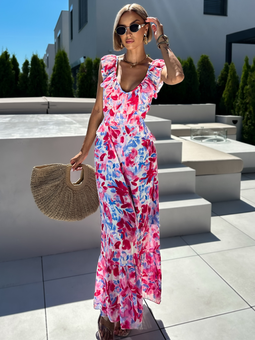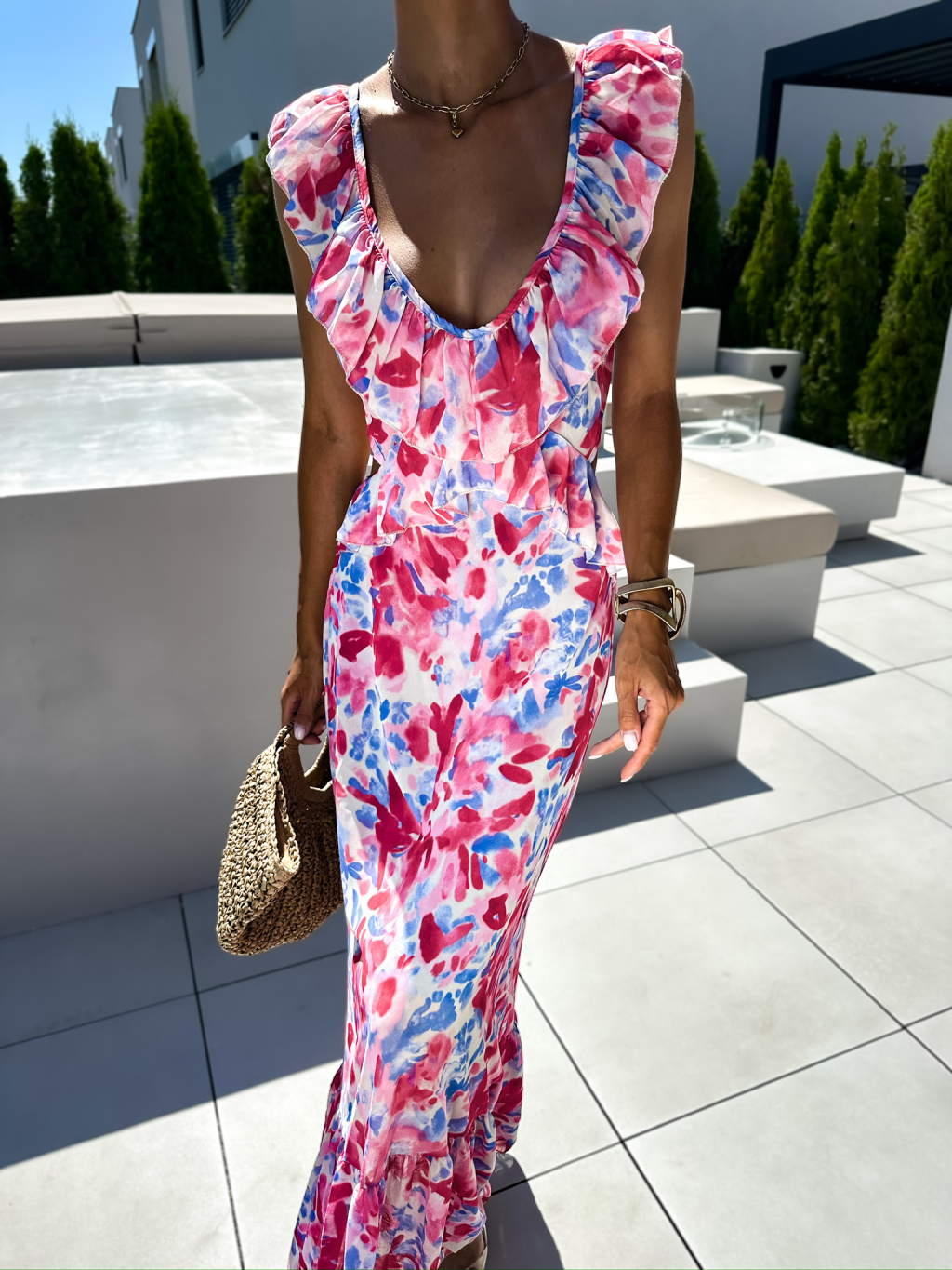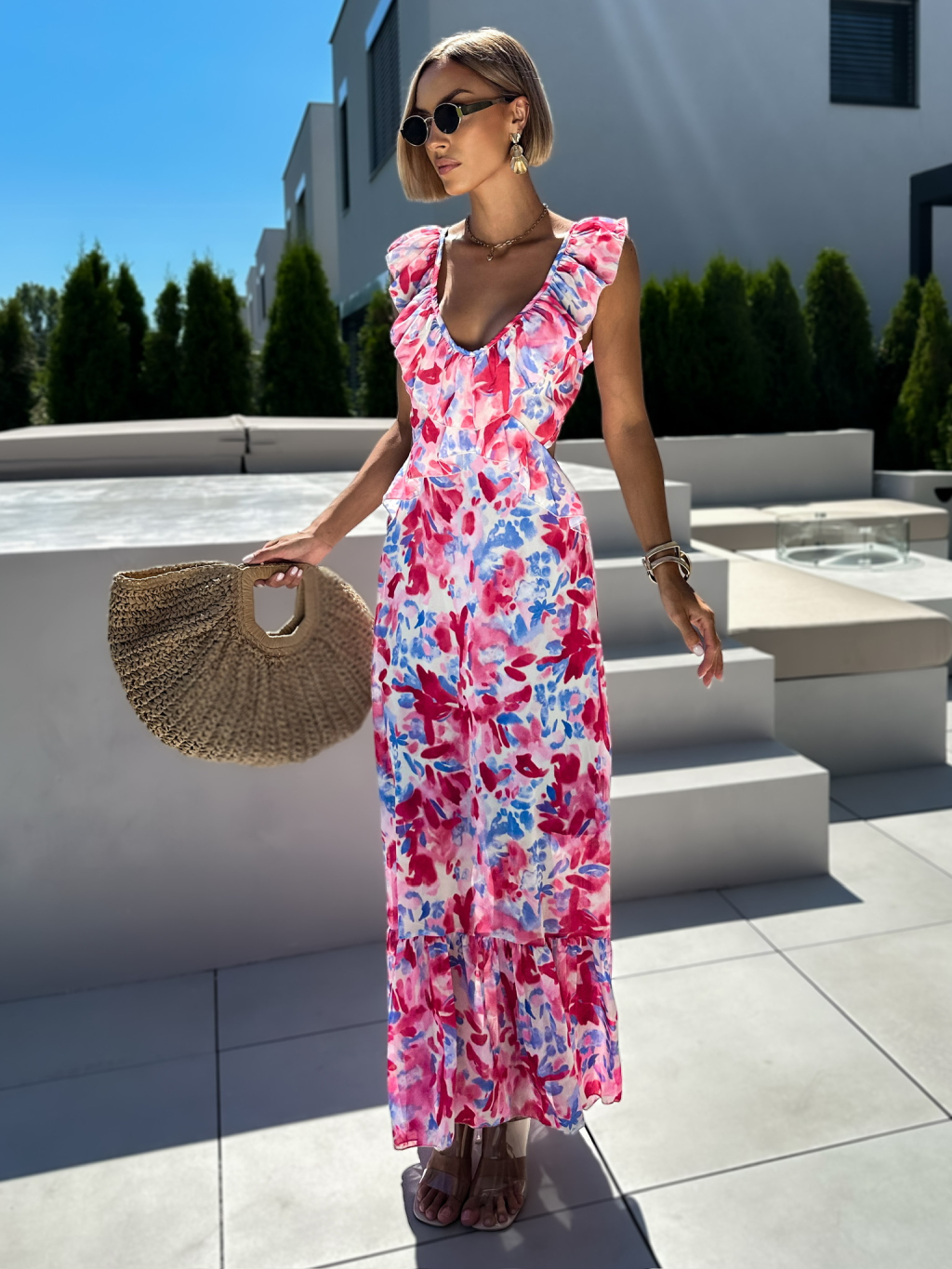 Ružové zoštíhľujúce dlhé šaty SIGRID s volánikmi