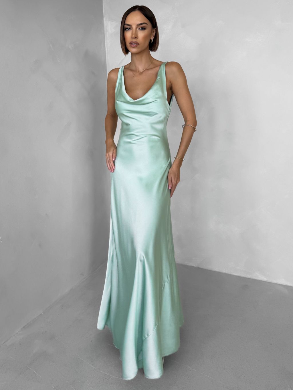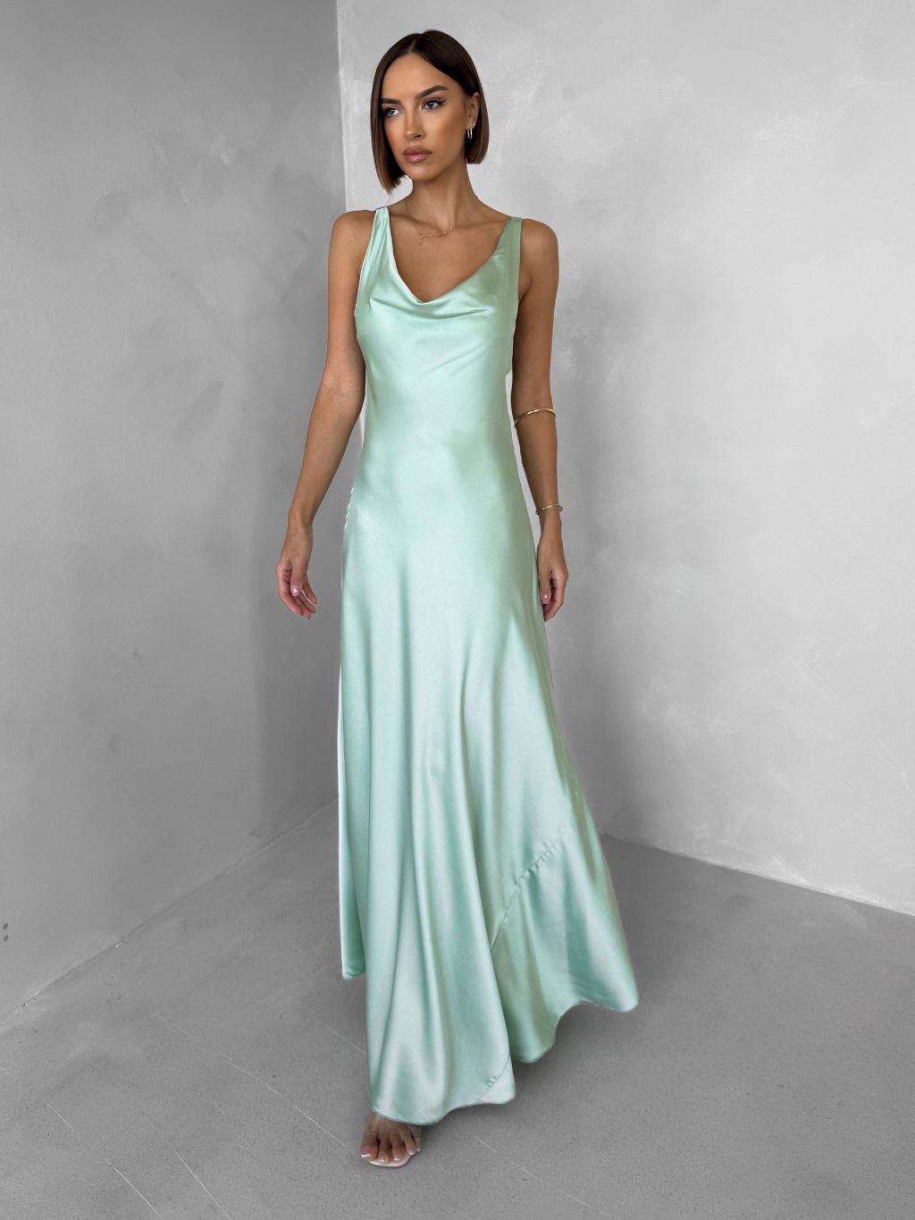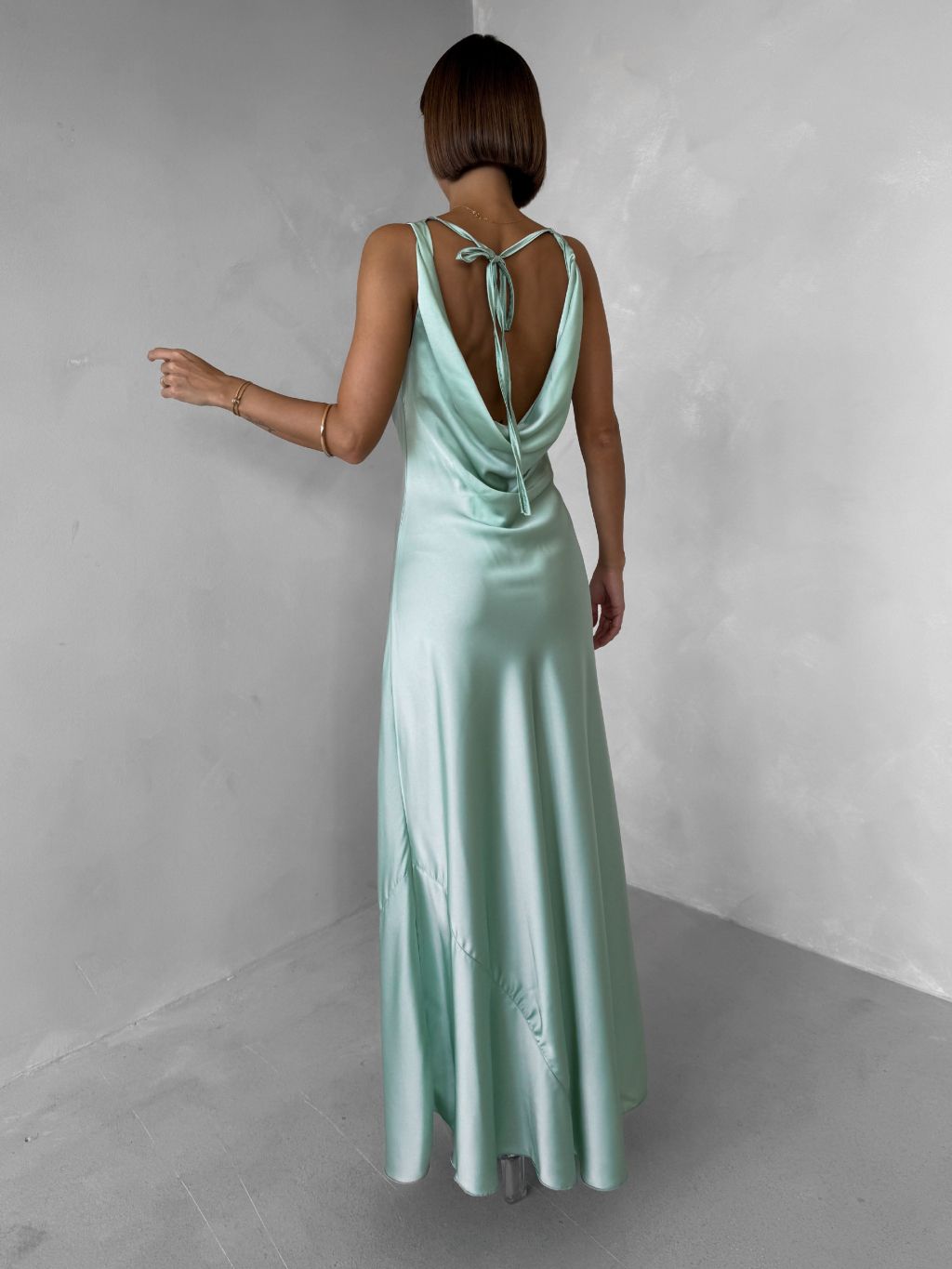 Svetlo zelené saténové dlhé šaty MIREVE s odhaleným chrbtom