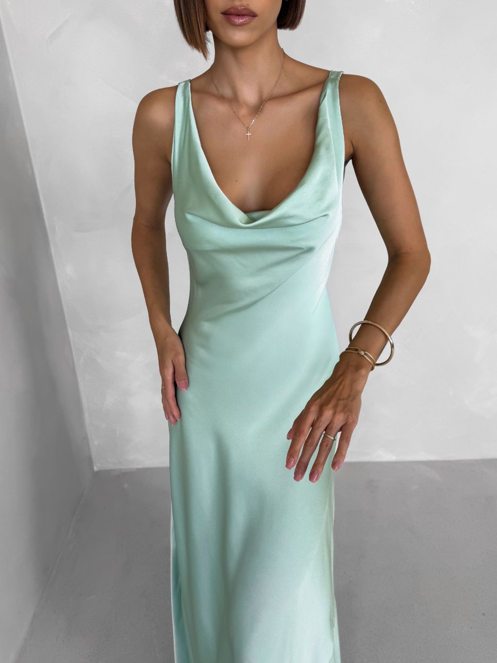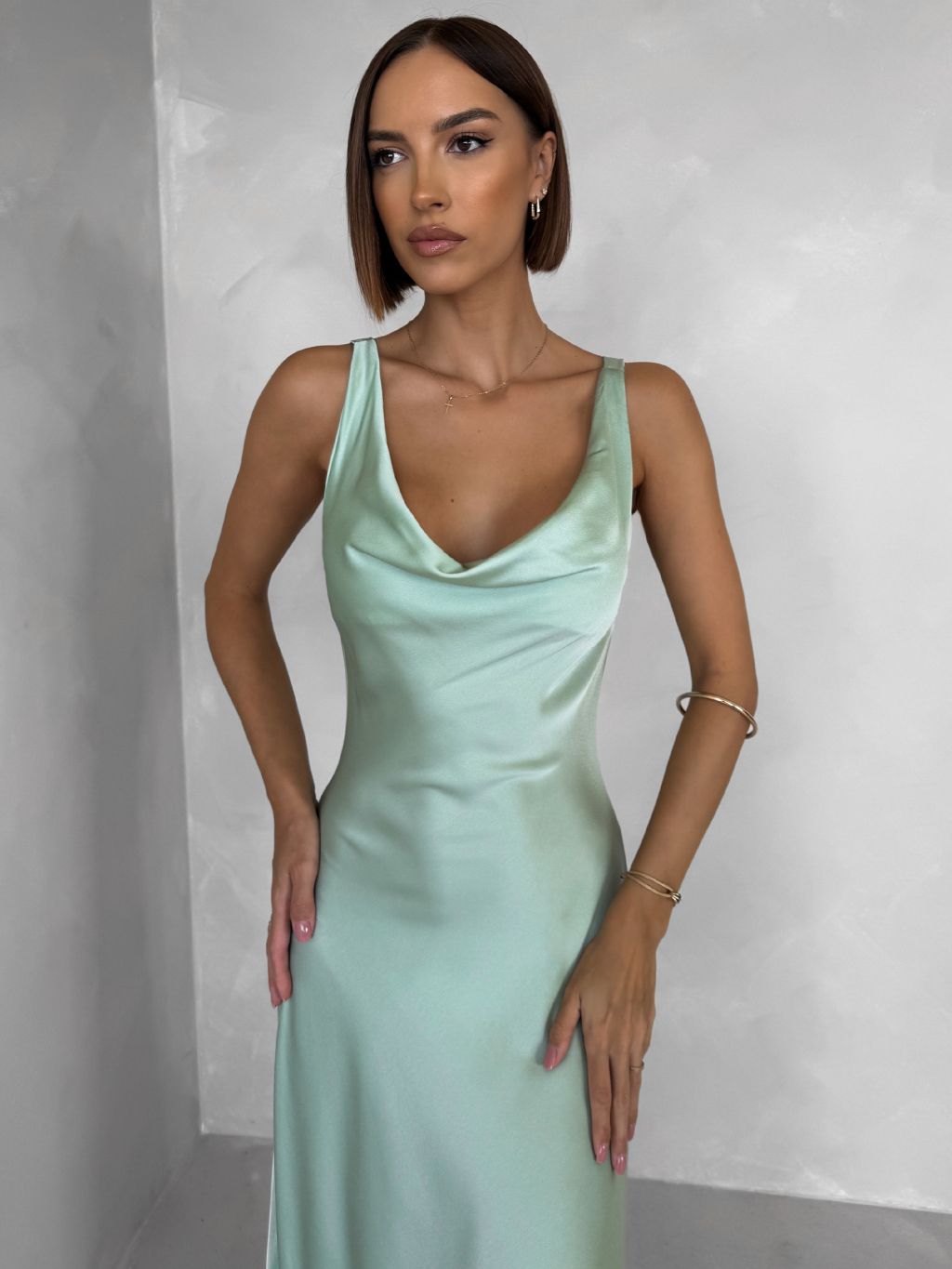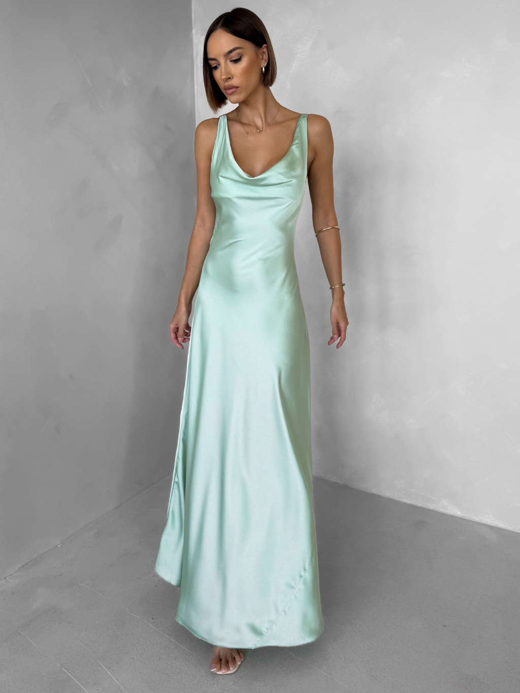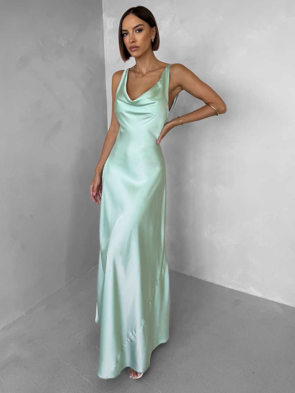 Svetlo zelené saténové dlhé šaty MIREVE s odhaleným chrbtom