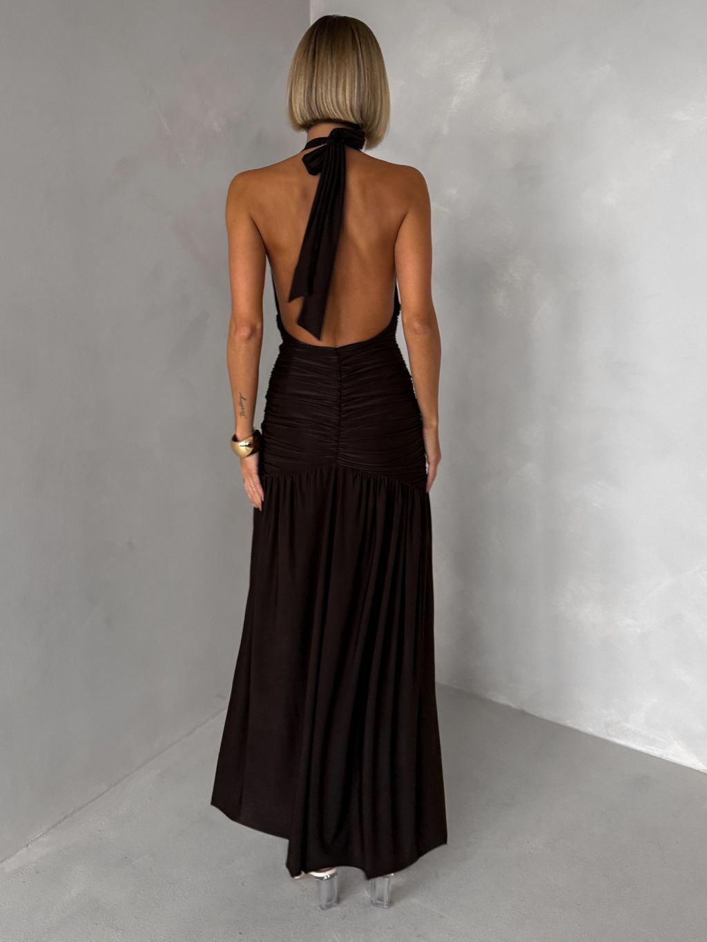 Tmavo hnedé riasené šaty KIMBERLEY s rázporkom