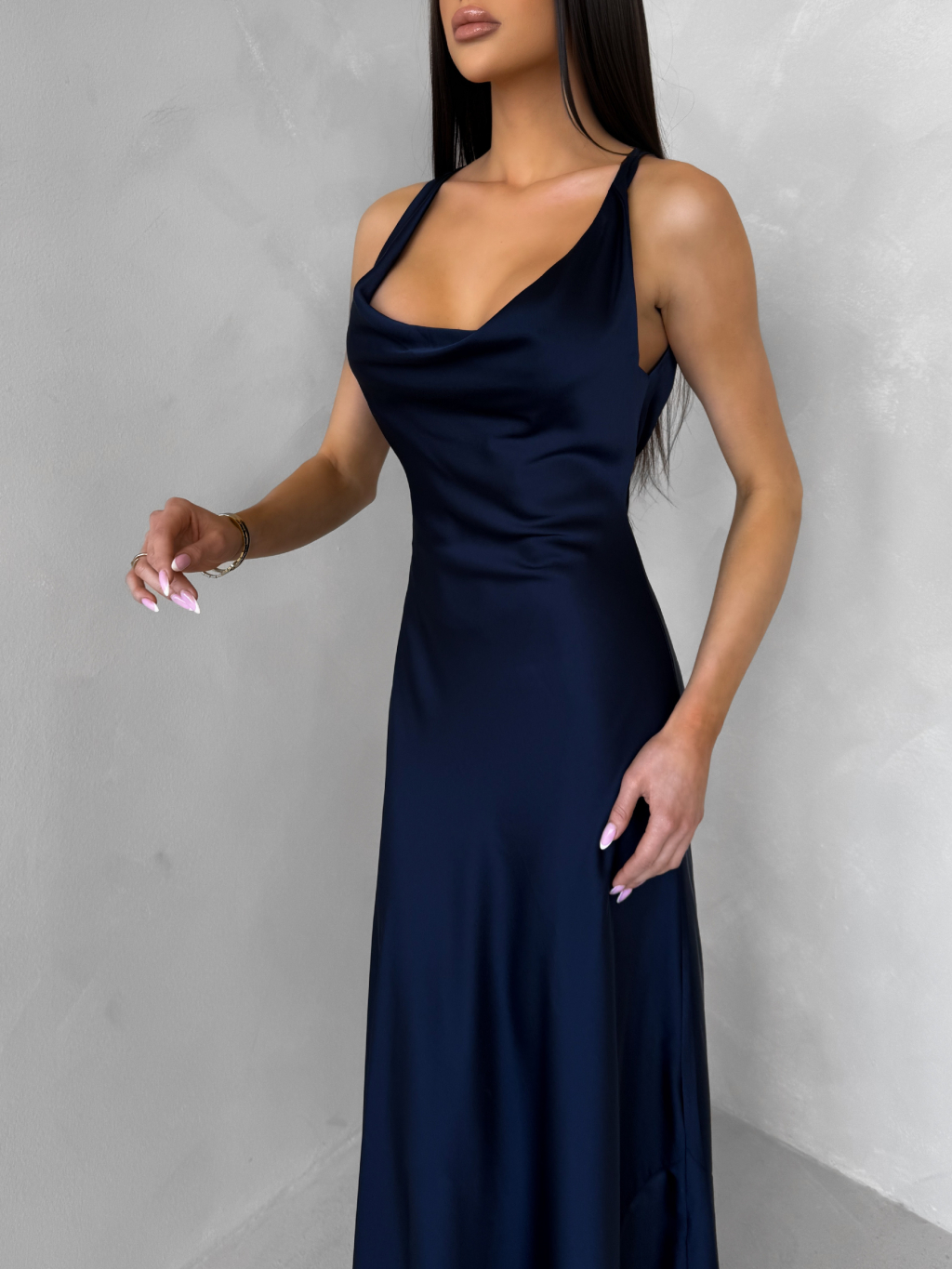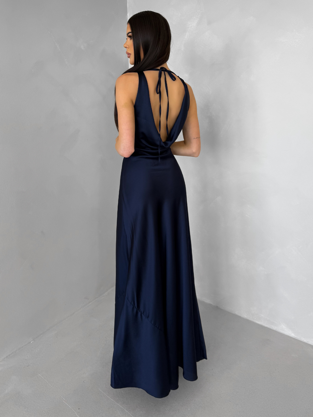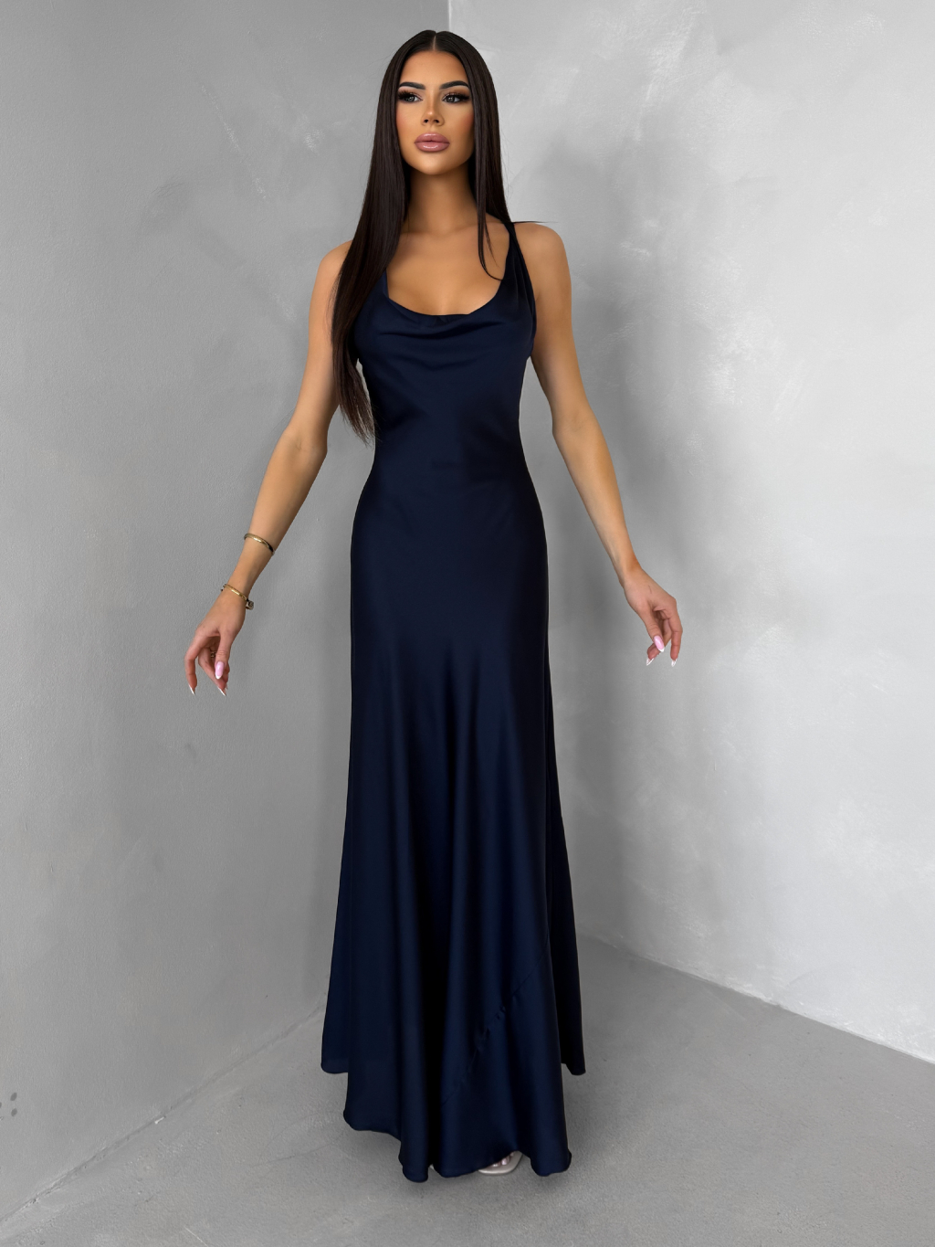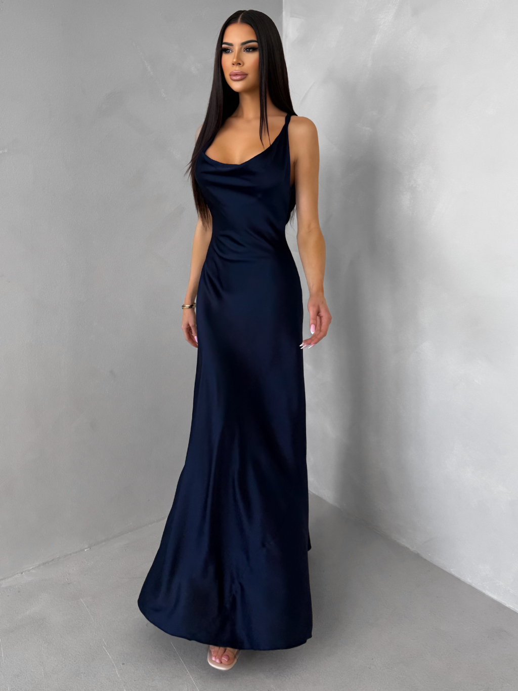 Tmavomodré saténové dlhé šaty MIREVE s odhaleným chrbtom