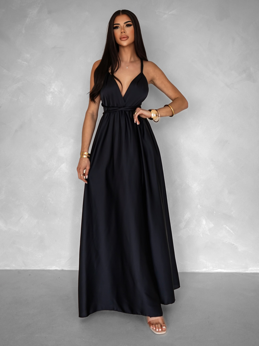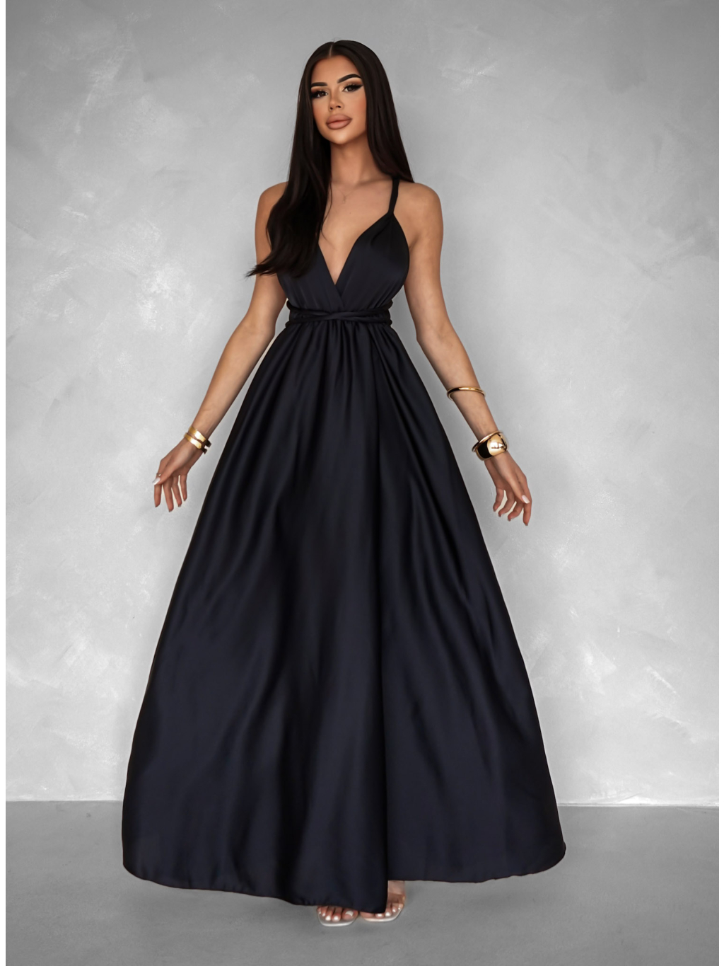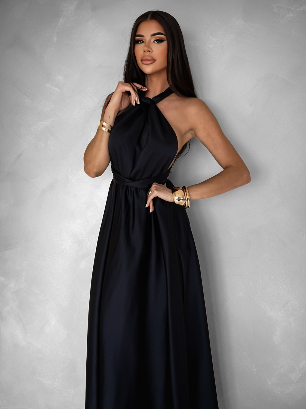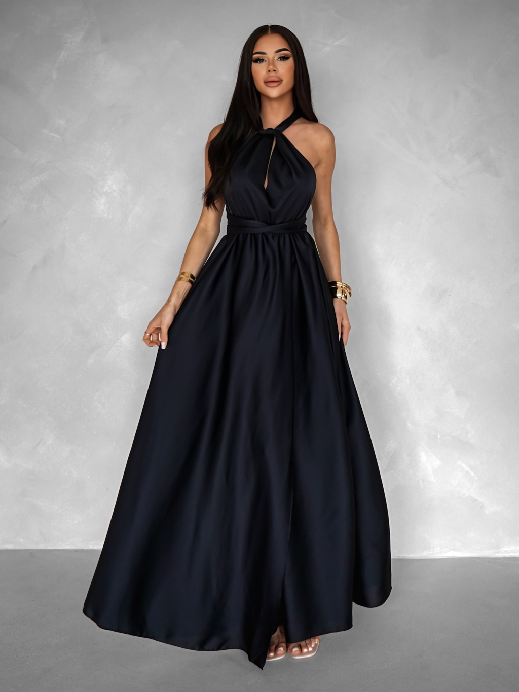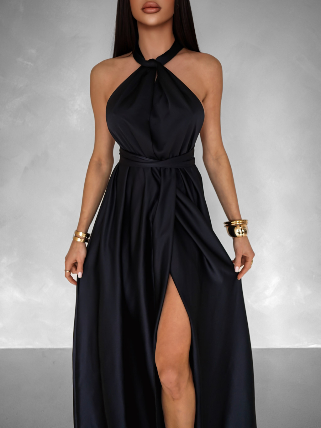 Tieto nádherné šaty sú dokonalou voľbou pre plesy aj ako družičkovské šaty. Lesklý materiál dodáva luxusný vzhľad, zatiaľ čo rozparok pridáva štipku sexi vzhľadu. Variabilné viazanie zaisťuje perfektné padnutie pre všetky typy postavy. Ideálna kombinácia elegancie a pohodlia, ktorá vás premení na hviezdu každej spoločenskej udalosti.
