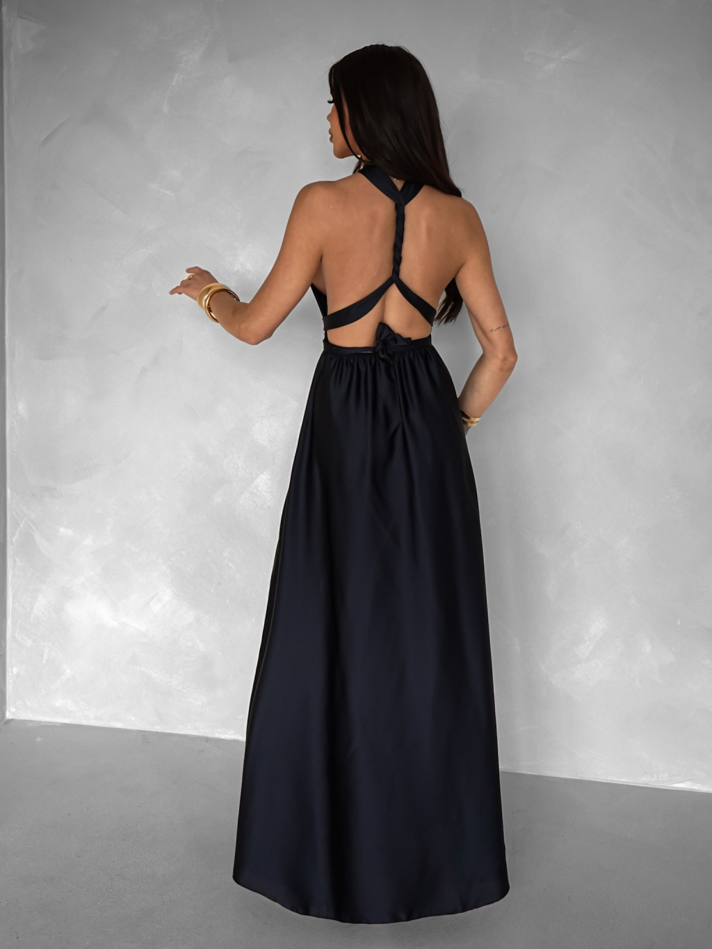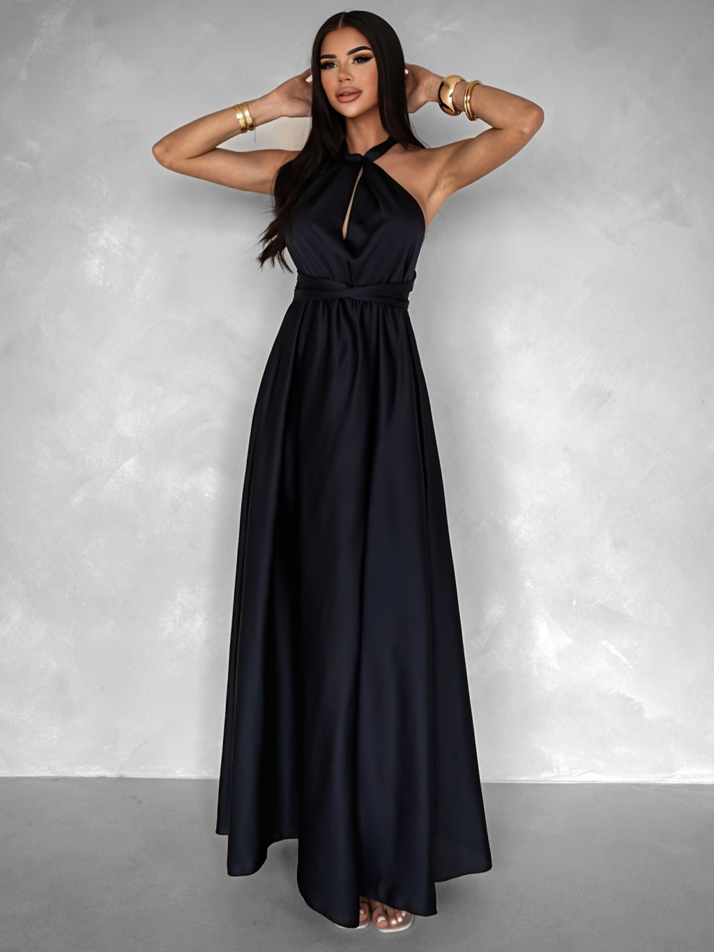 Tmavomodré variabilné saténové šaty VALERDI a rázporkom
