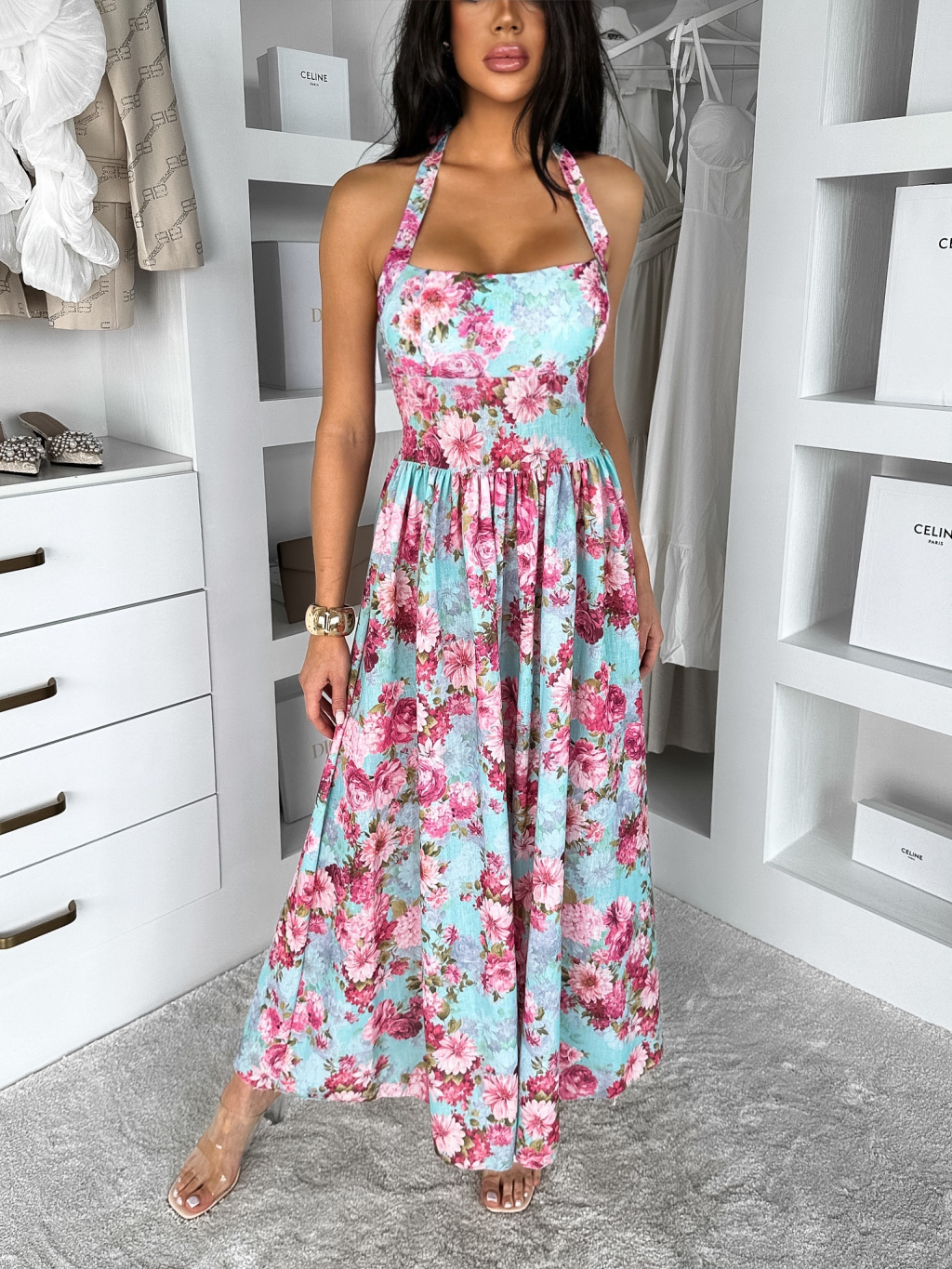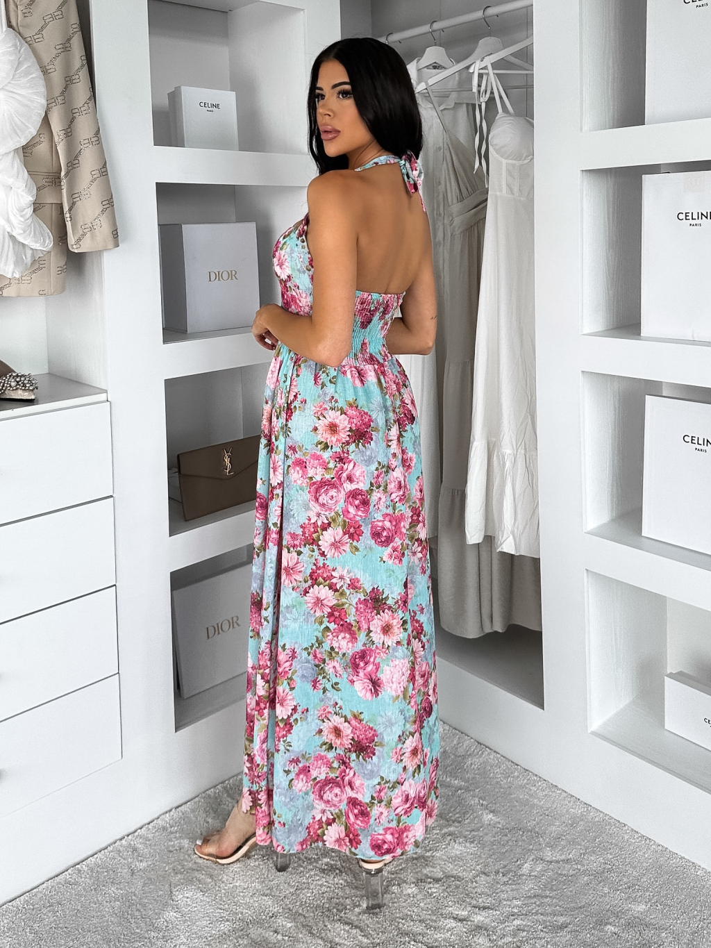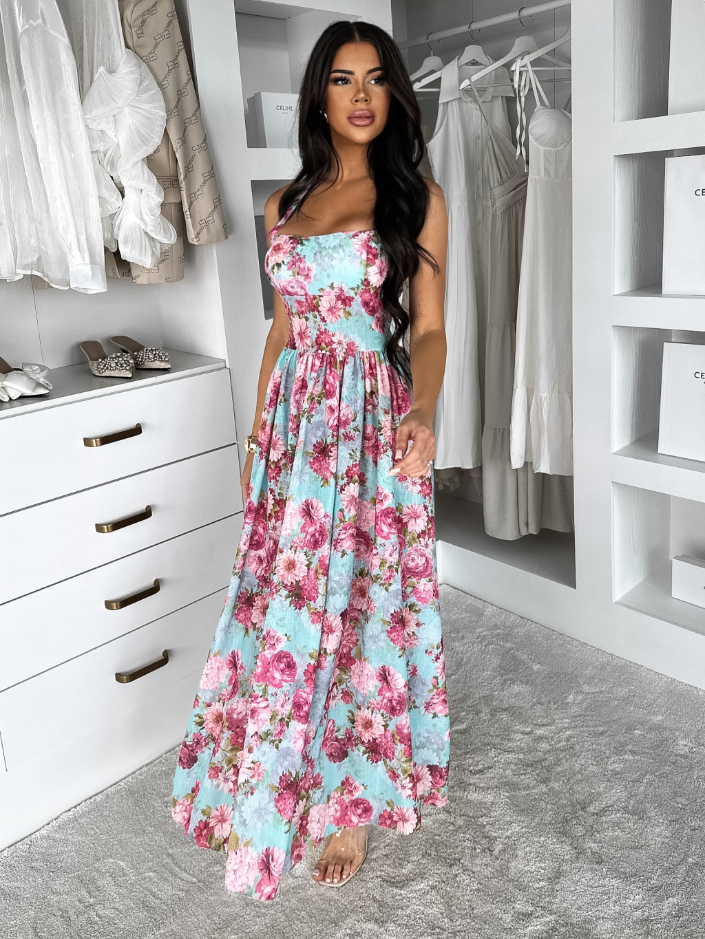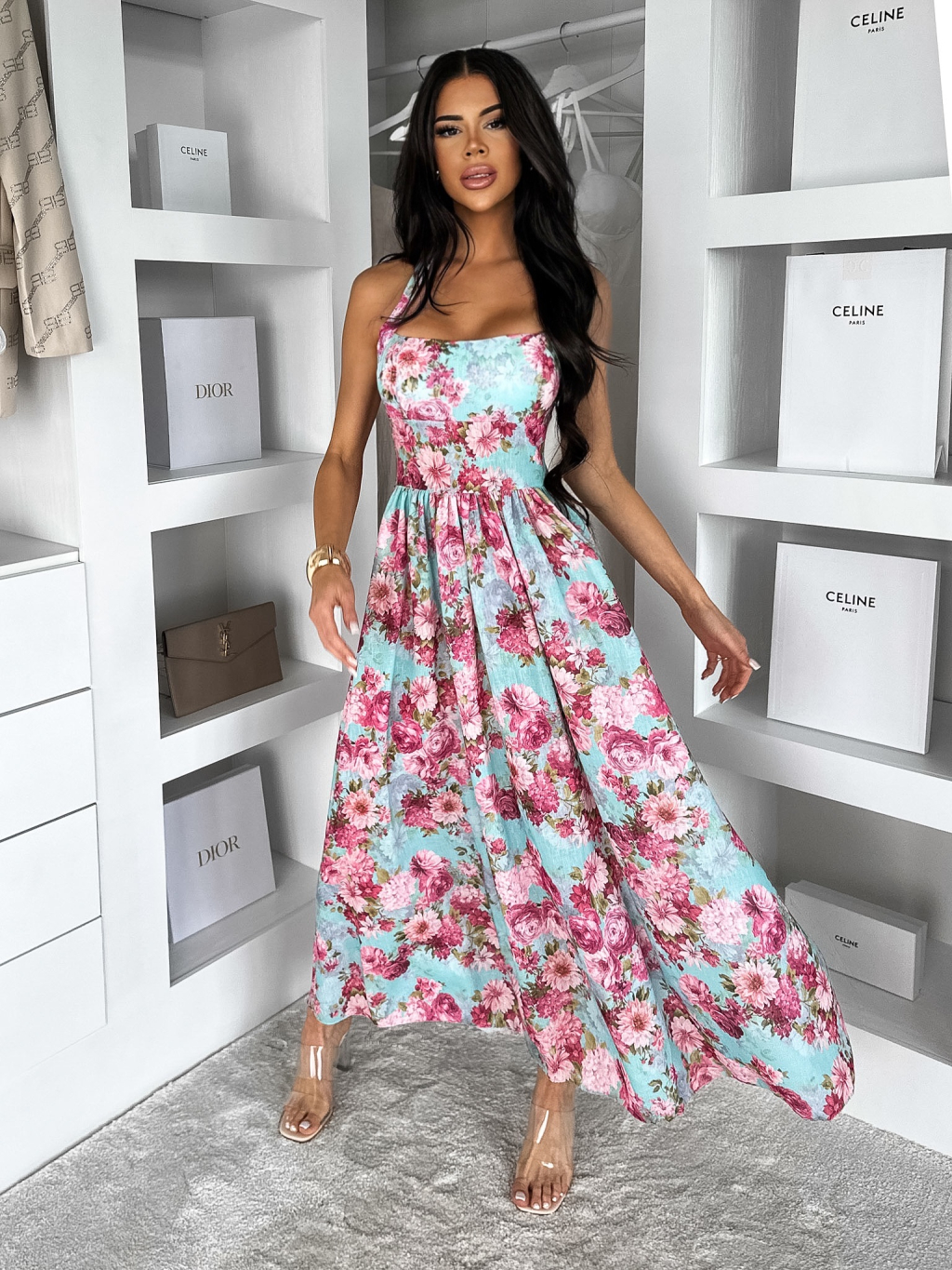 Tyrkysové letné dlhé kvetované šaty YSMERA
