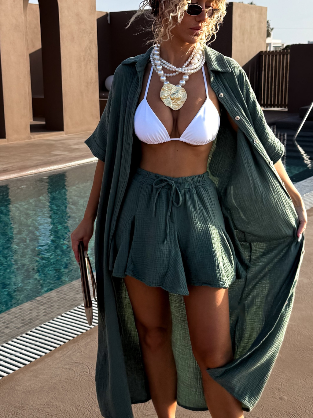 Khaki krátka mušelínová sukňa LARLEY s kraťaskami