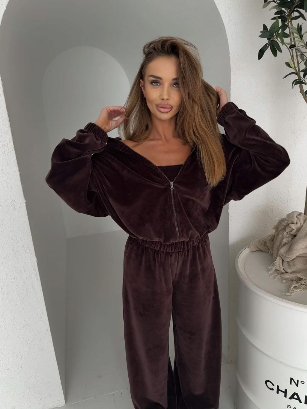 Tmavo hnedá semišová tepláková súprava BEAUN s topom
