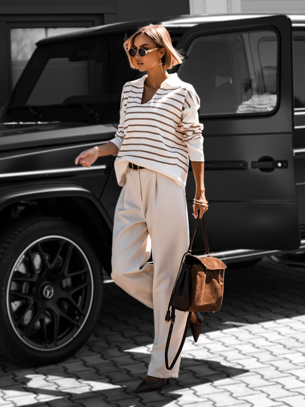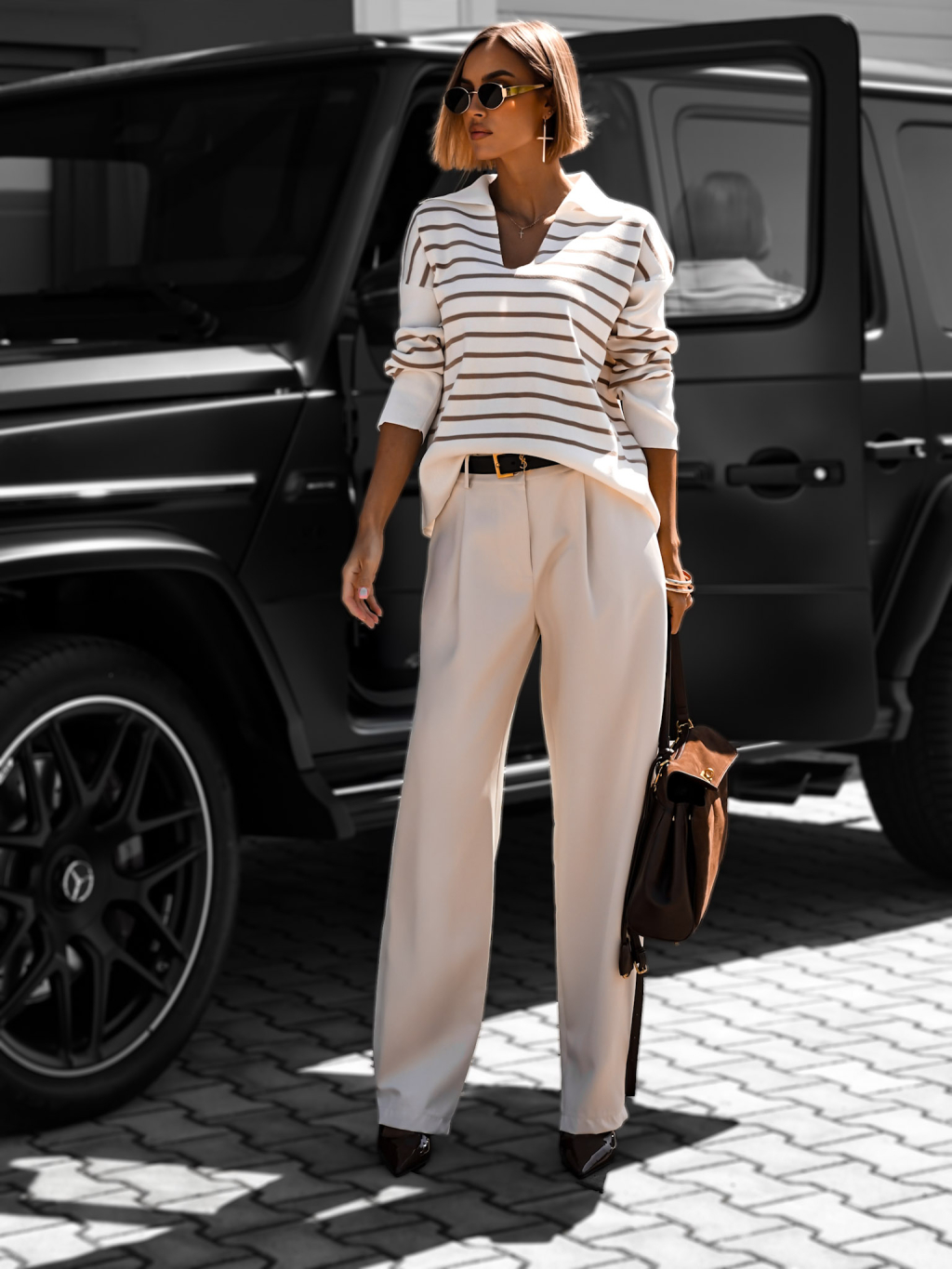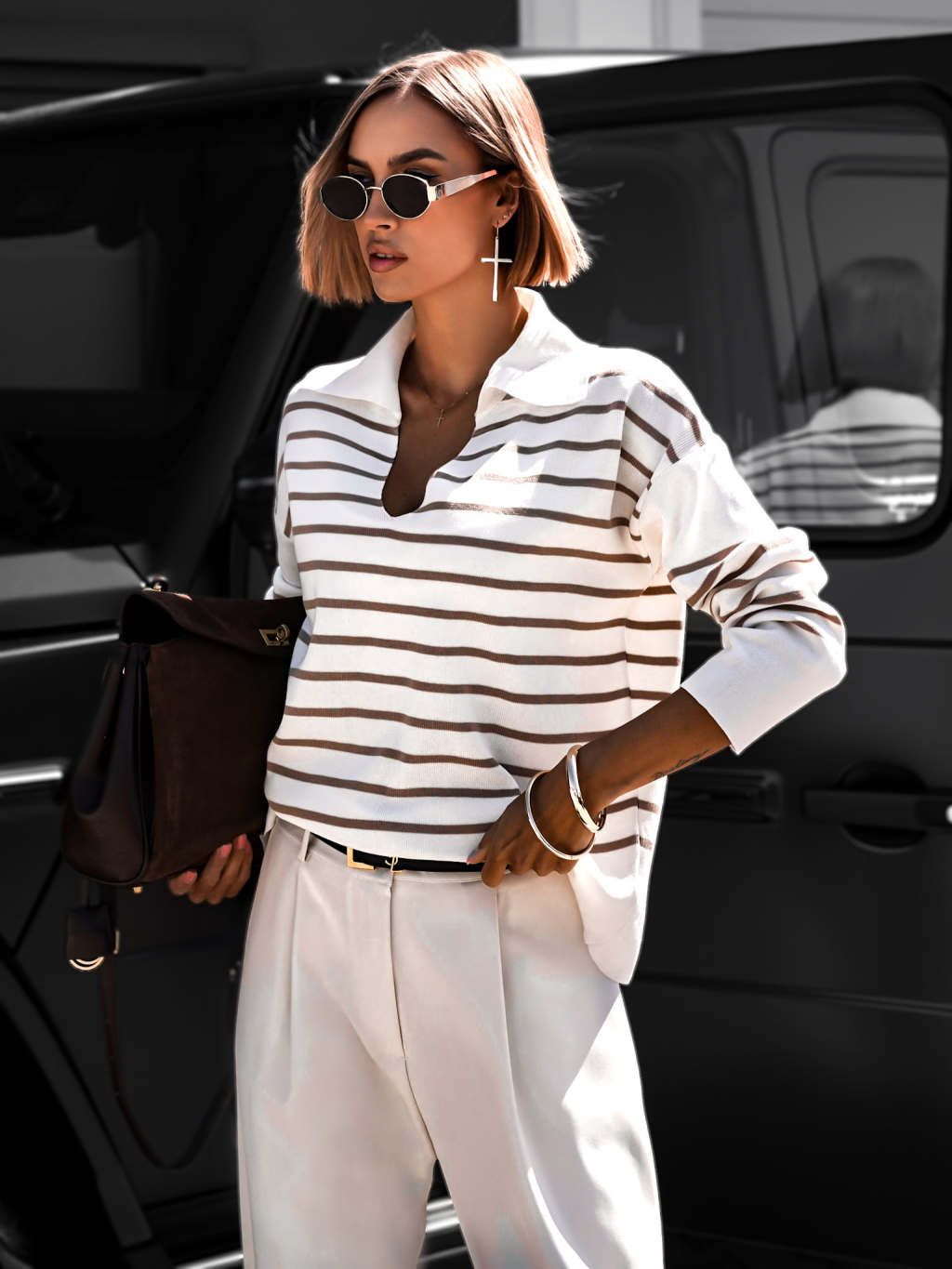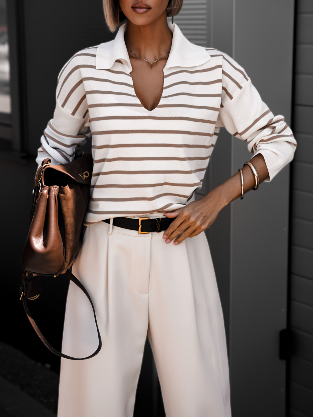 Bielohnedý oversize svetrík FREVIK s výstrihom