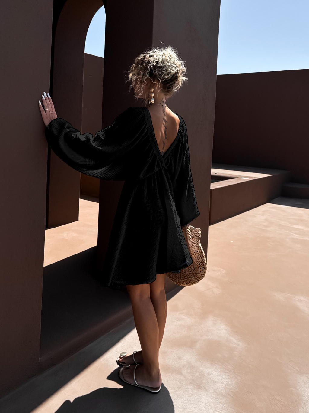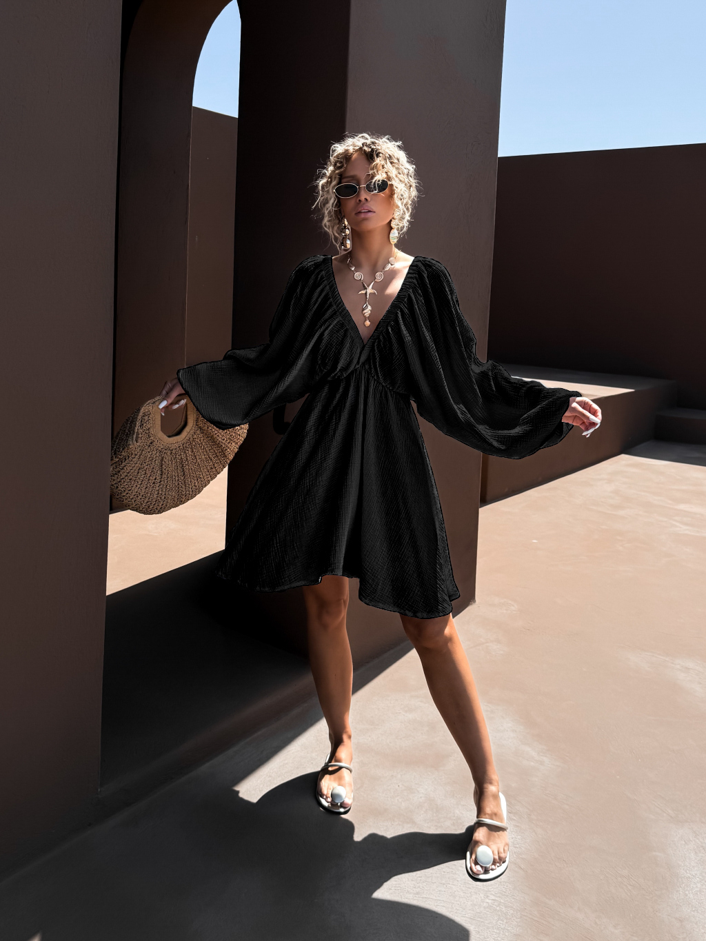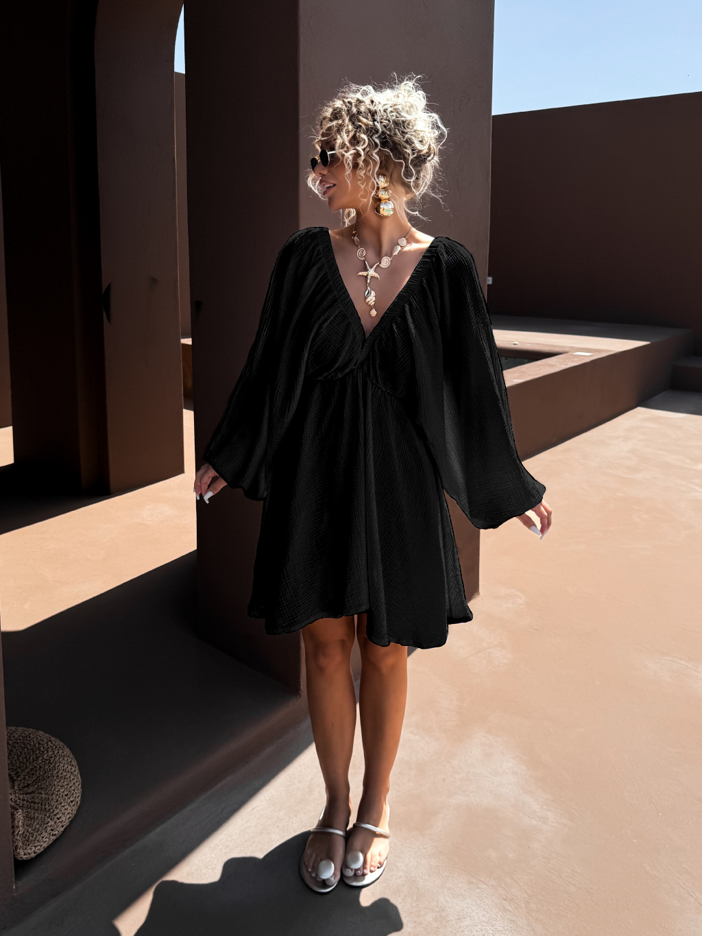 Čierne krátke mušelínové šaty ABACUT s výstrihom
