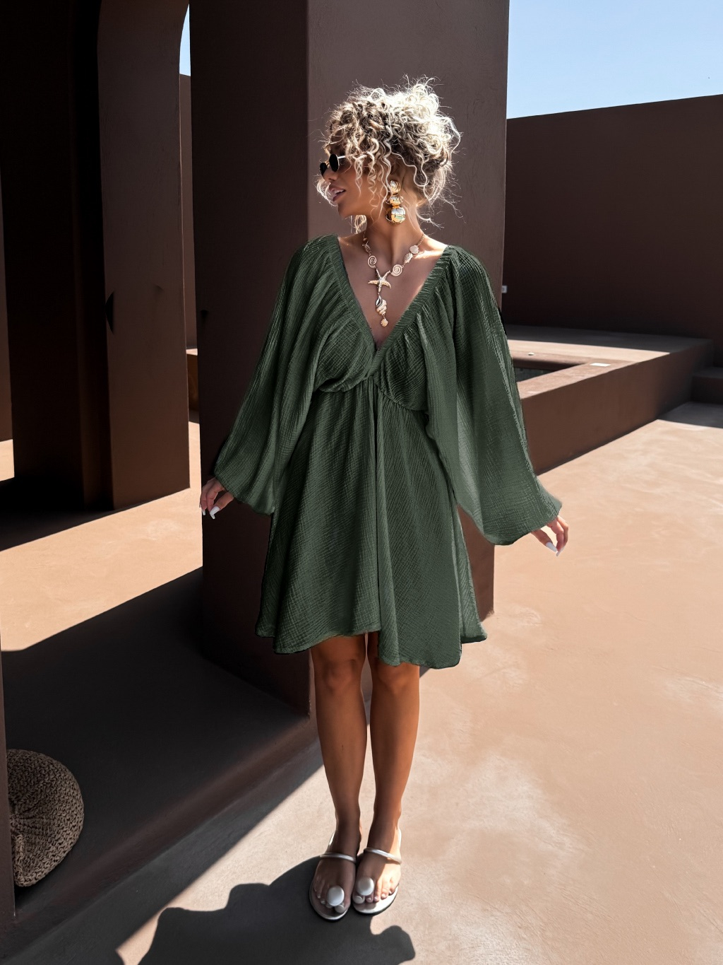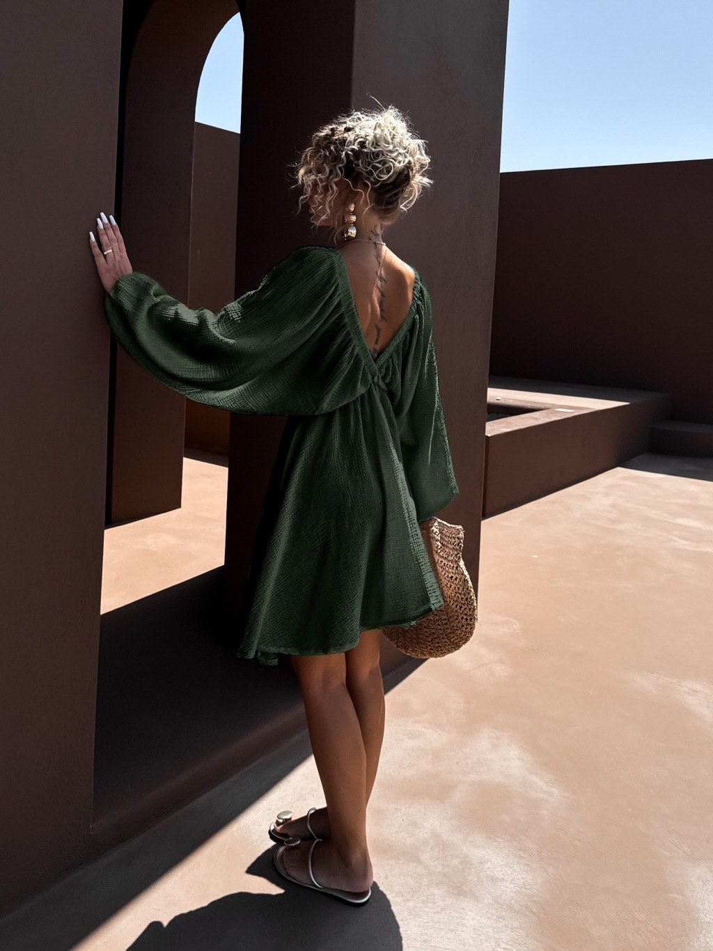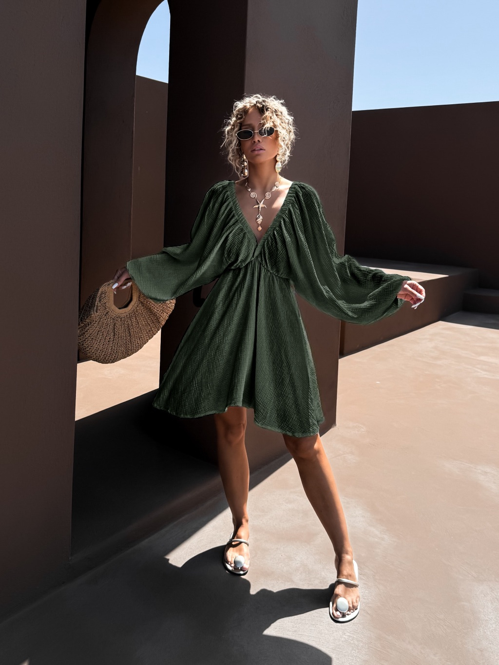 Kaki krátke mušelínové šaty ABACUT s výstrihom