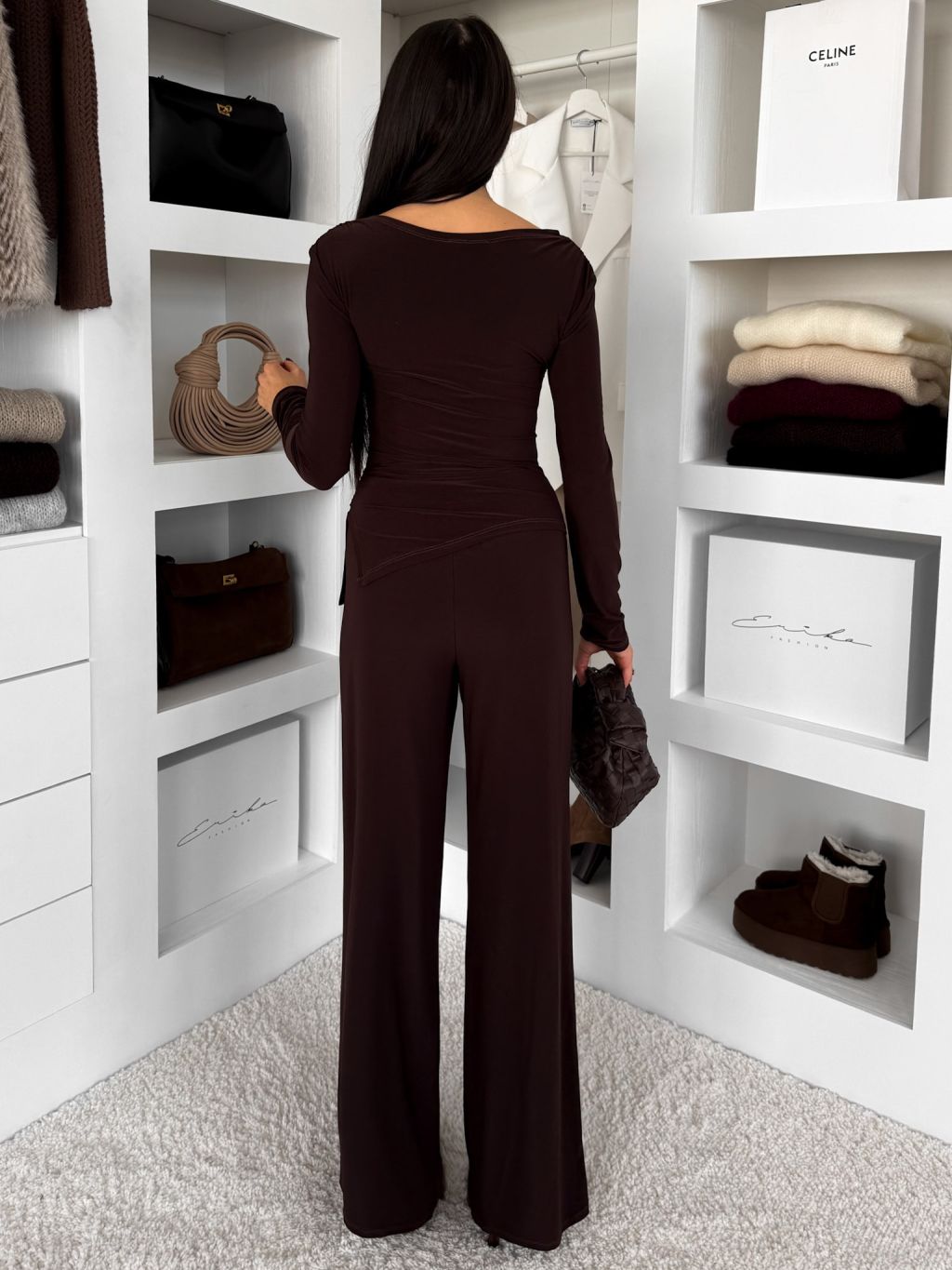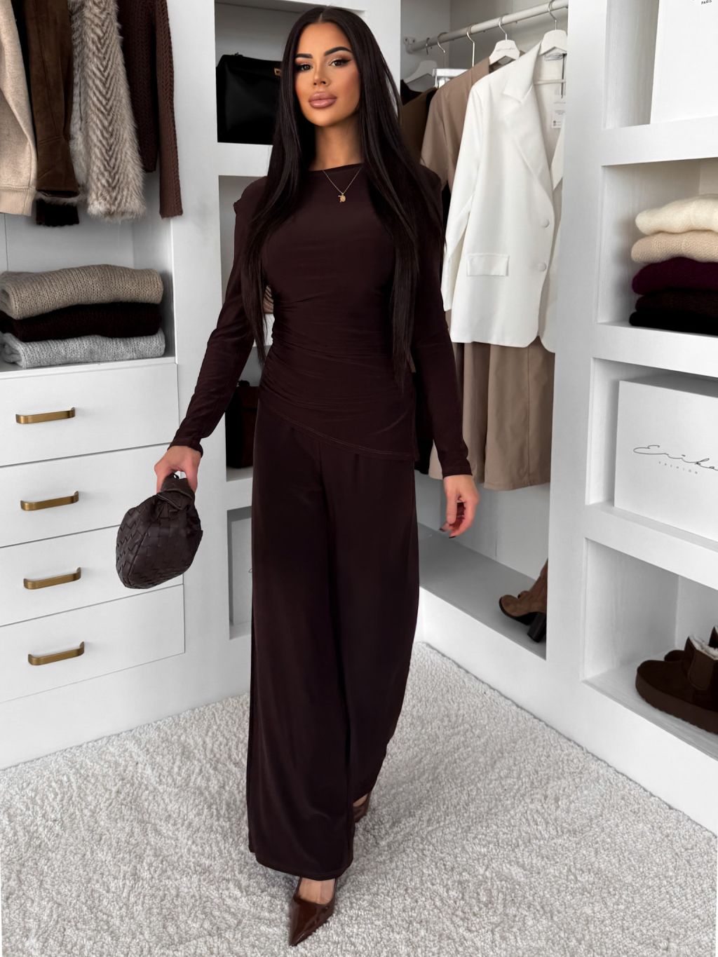 Hnedý elegantný elastický nohavicový komplet FELUREATY