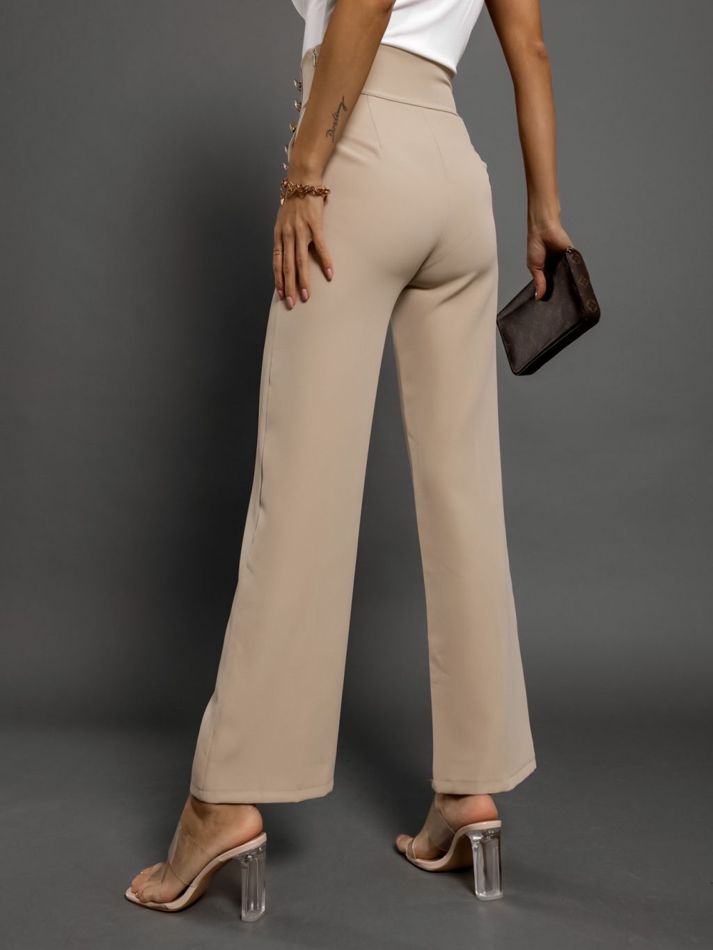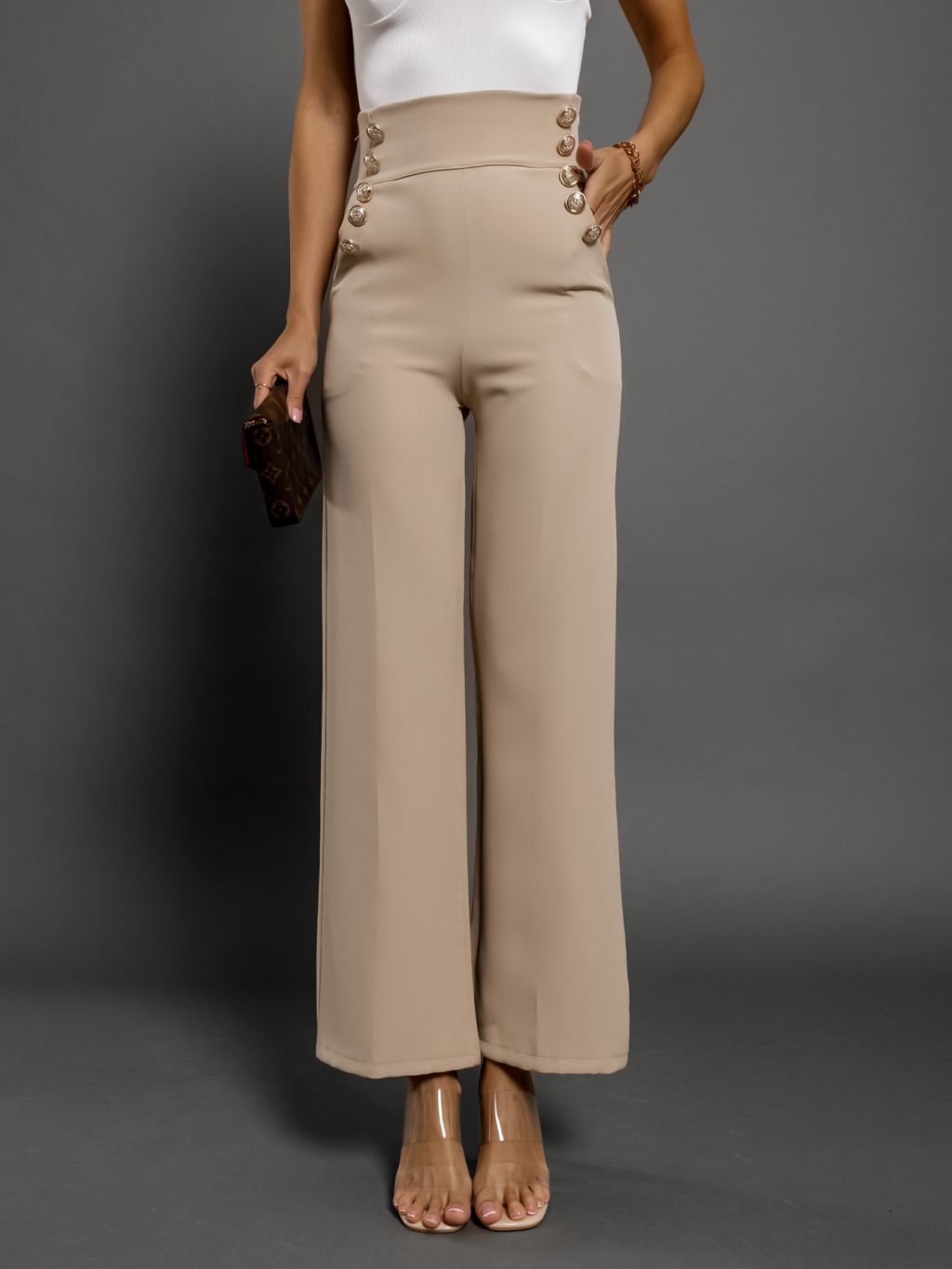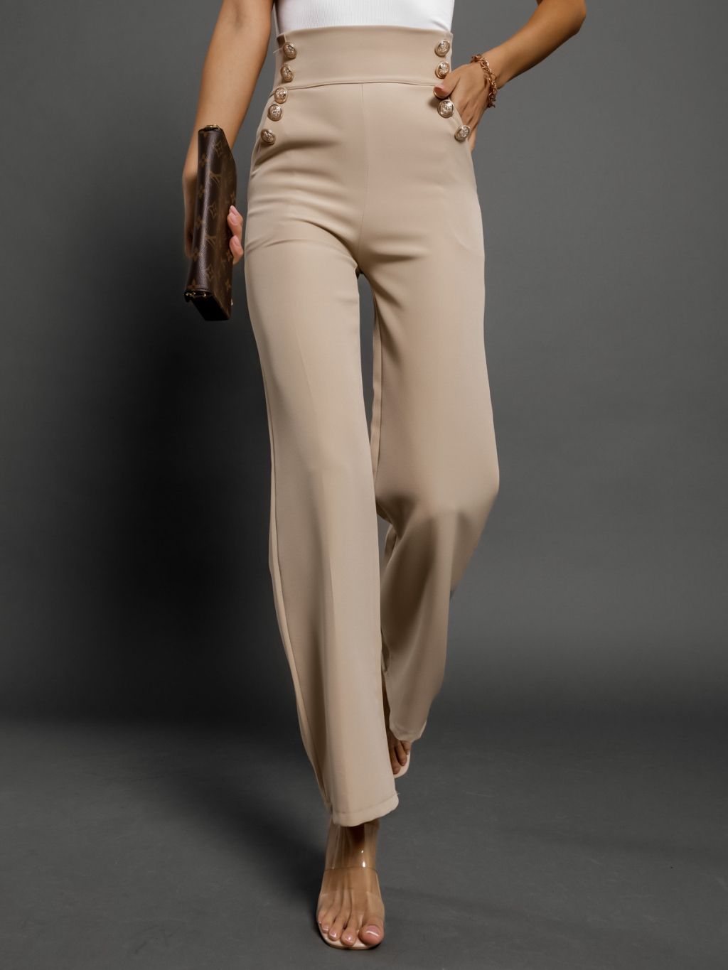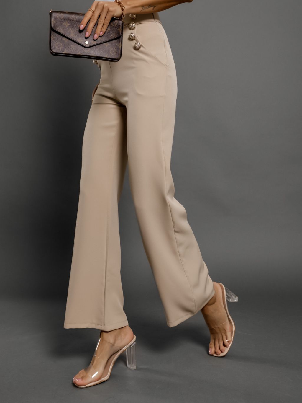 Béžové elegantné nohavice CANDYFLO so zlatými gombíkmi