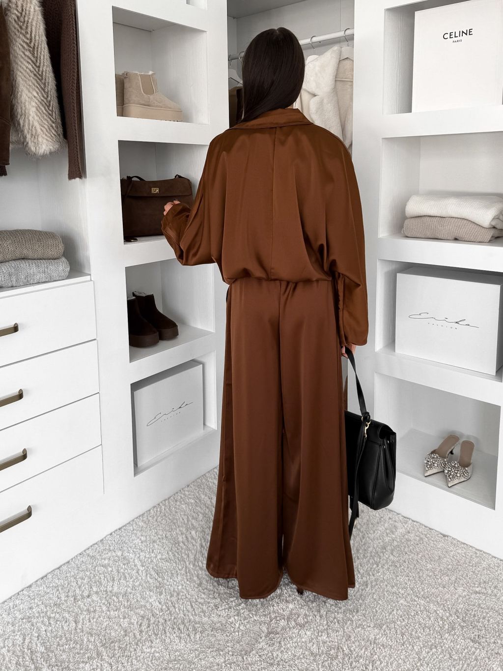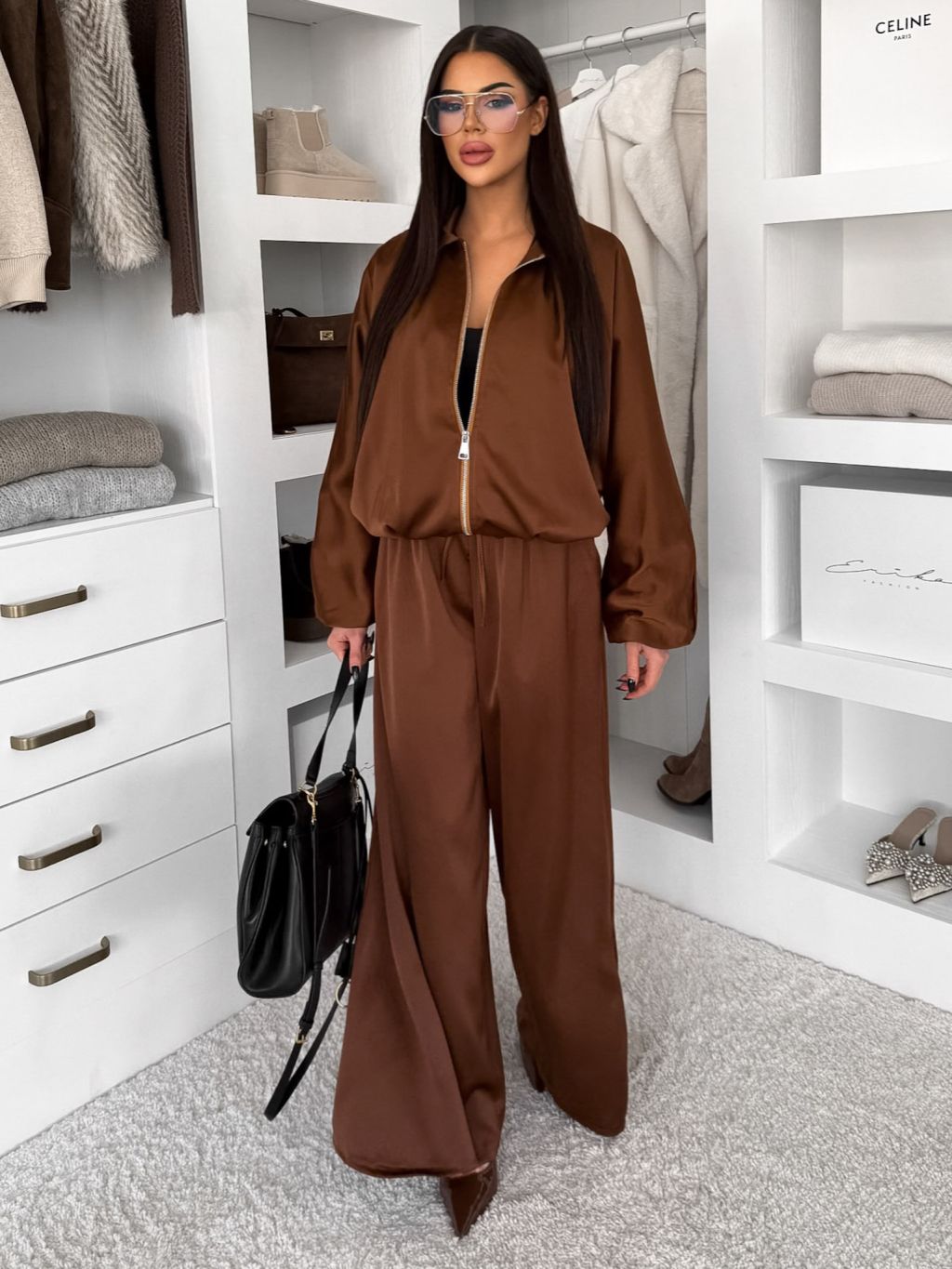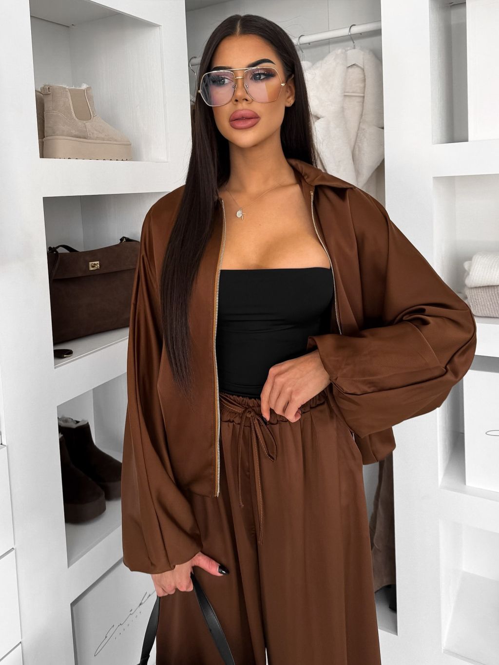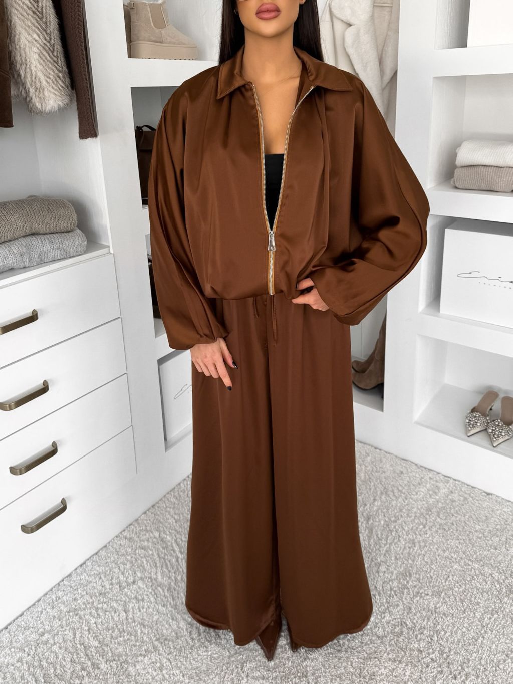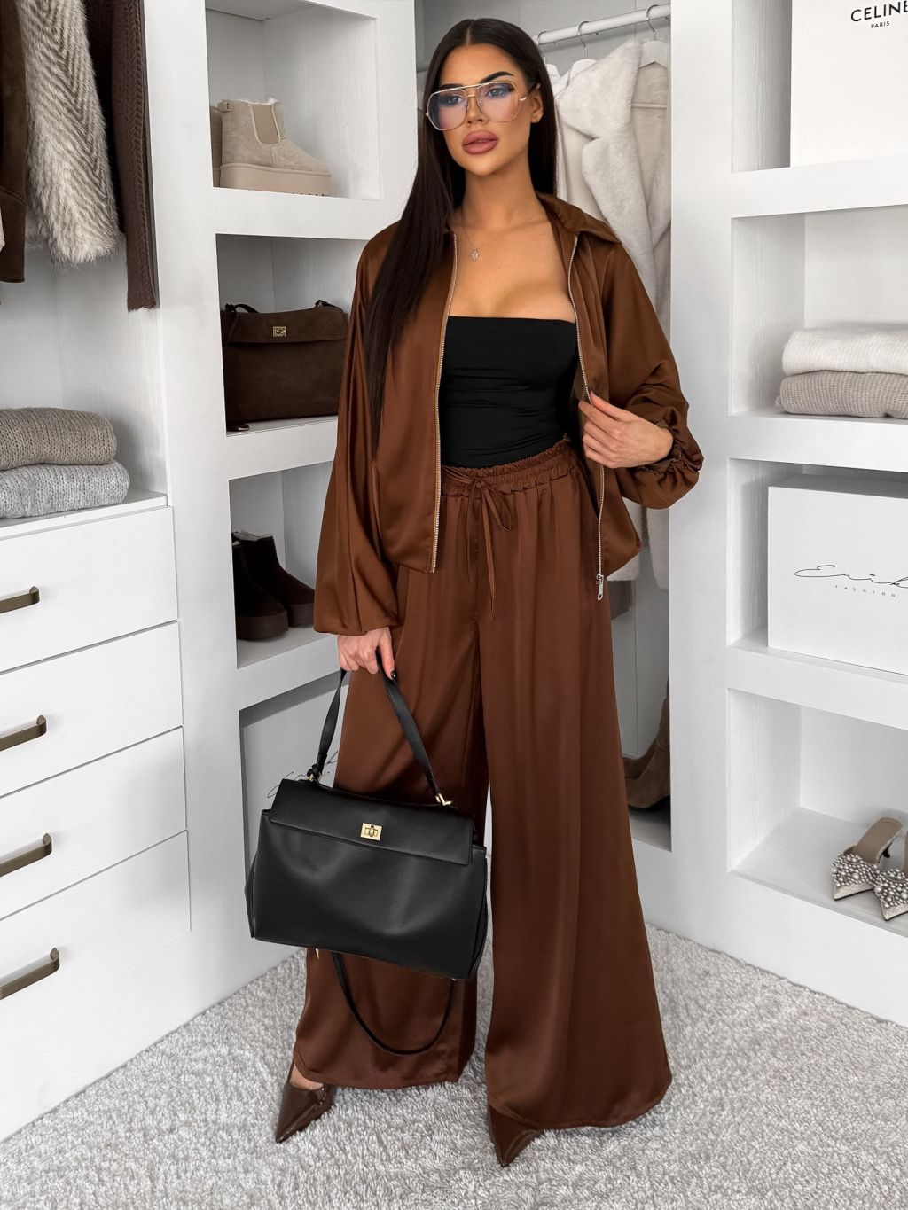 Hnedý saténový nohavicový komplet TRENIVA
