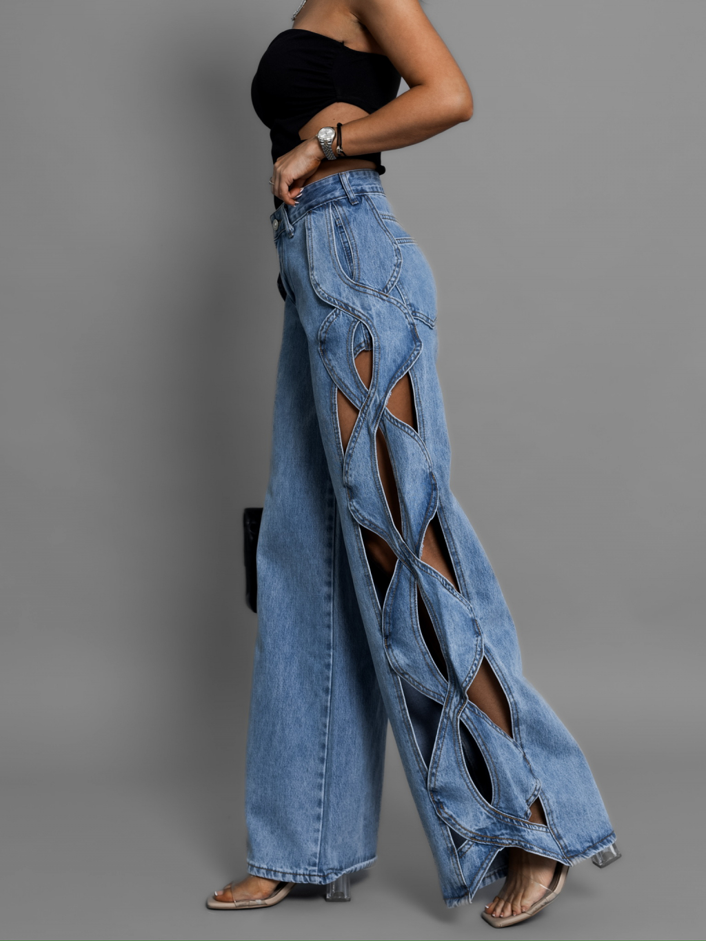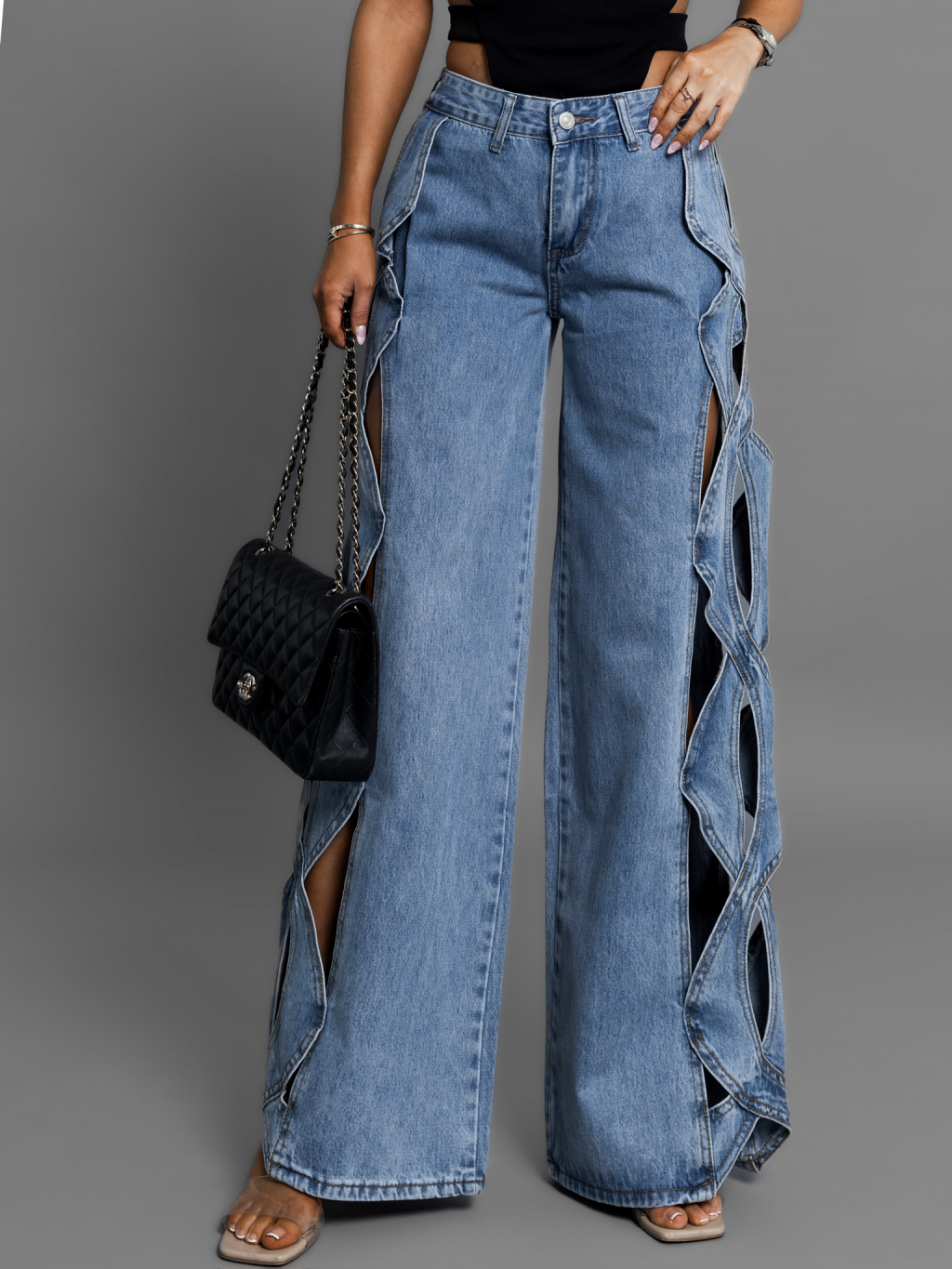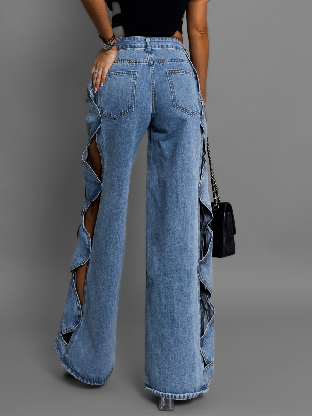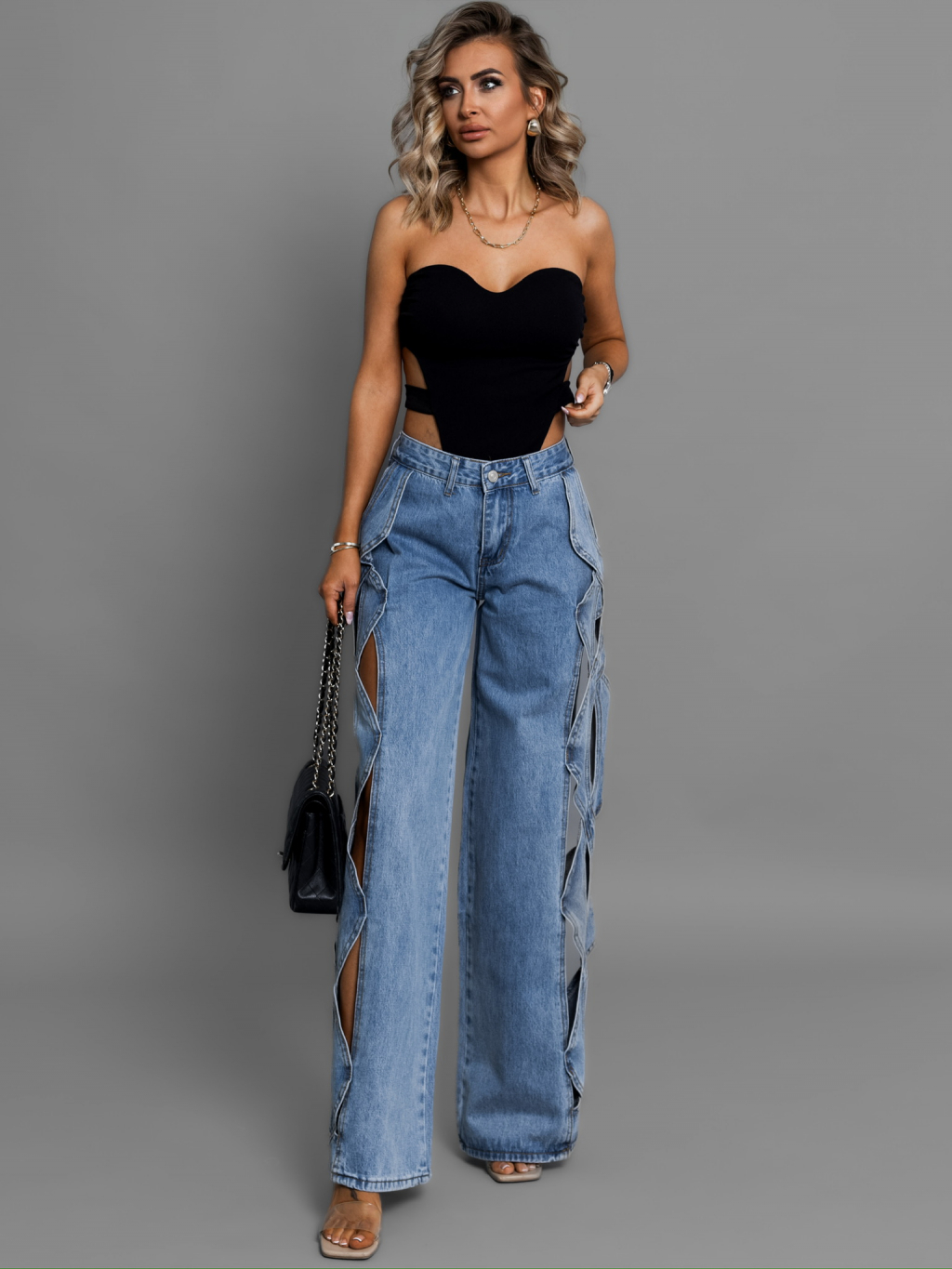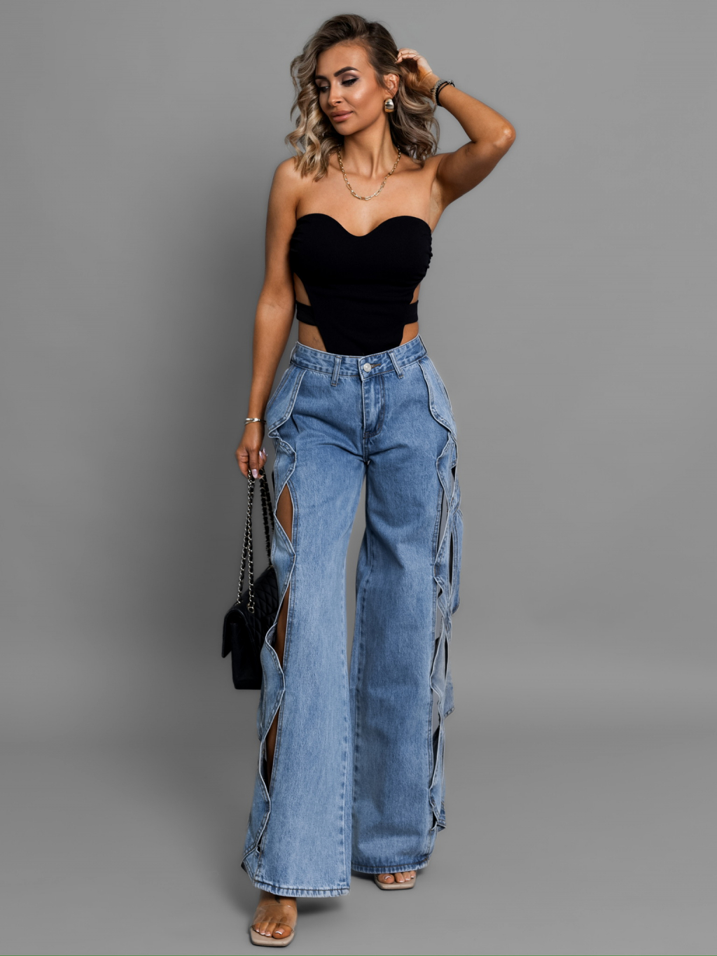 Modré široké wide leg džínsy MORINDA s prestrihmi