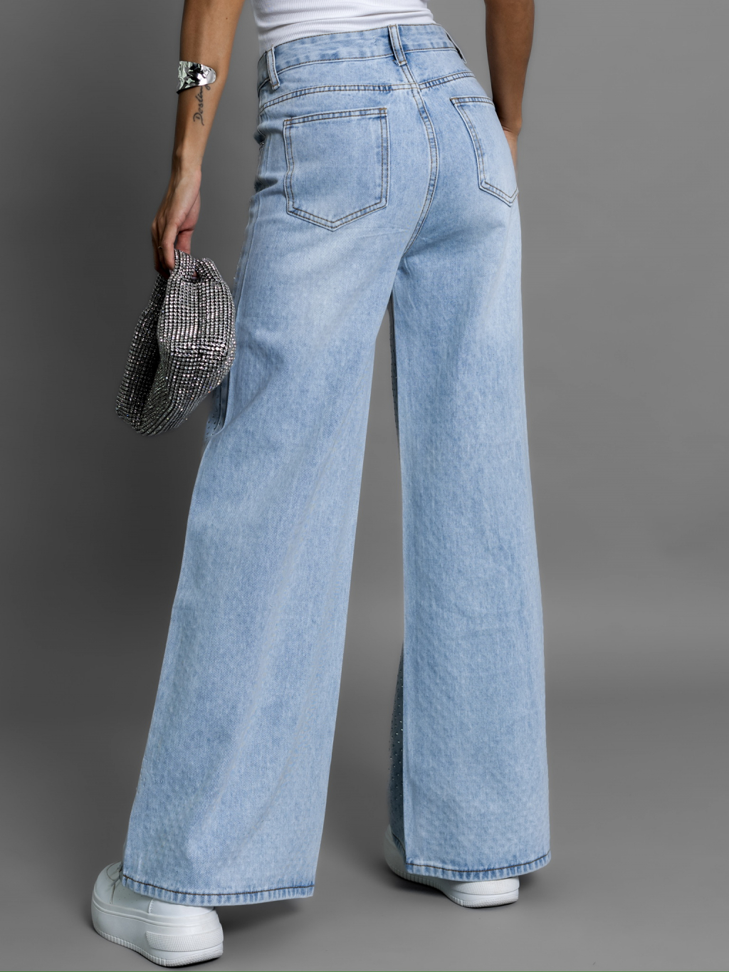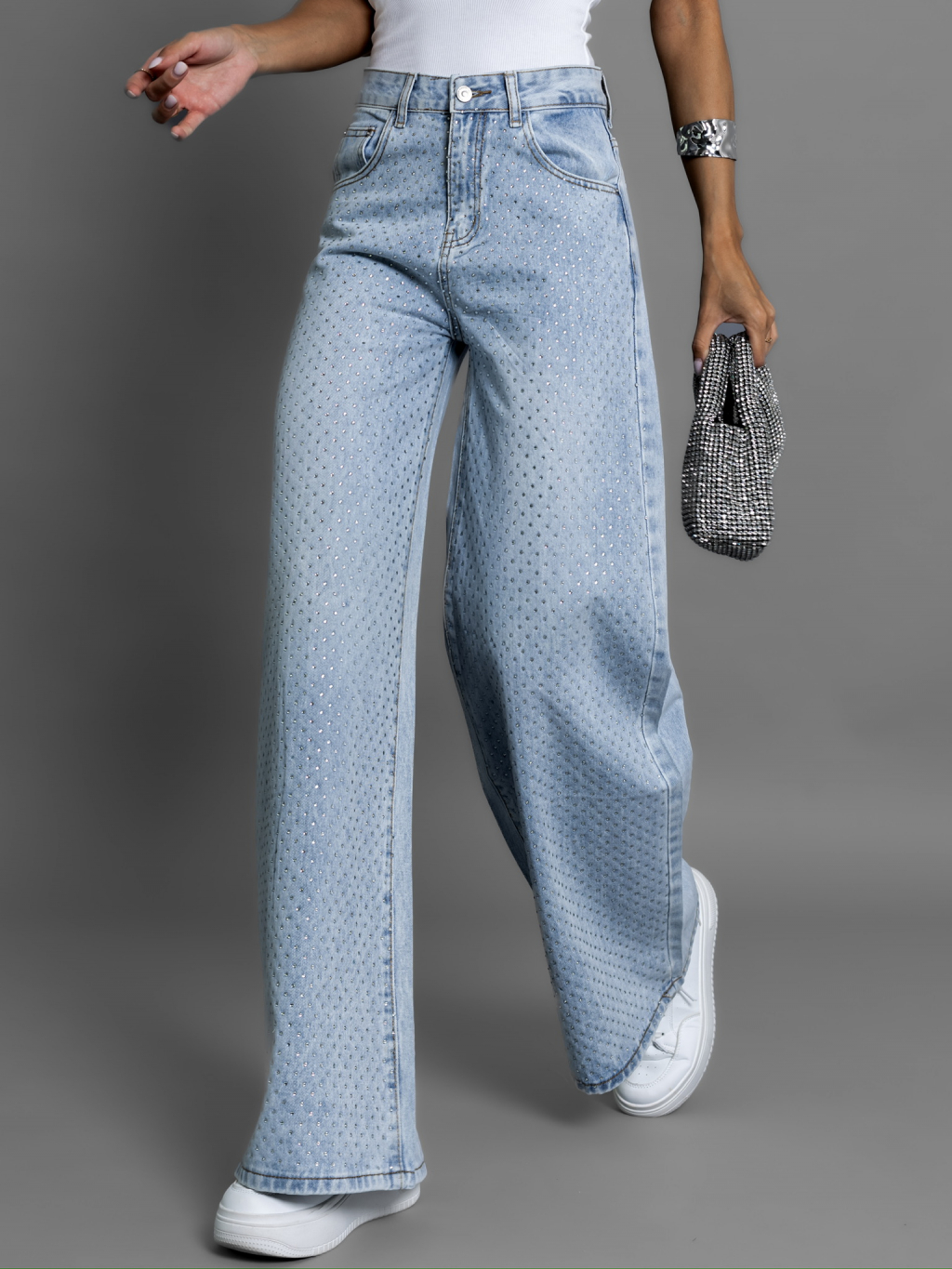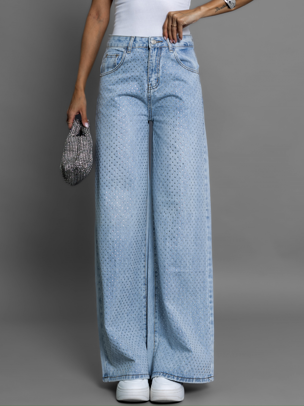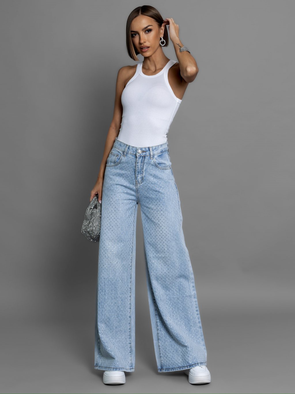 Modré široké wide leg džínsy TAMARIND s kamienkami