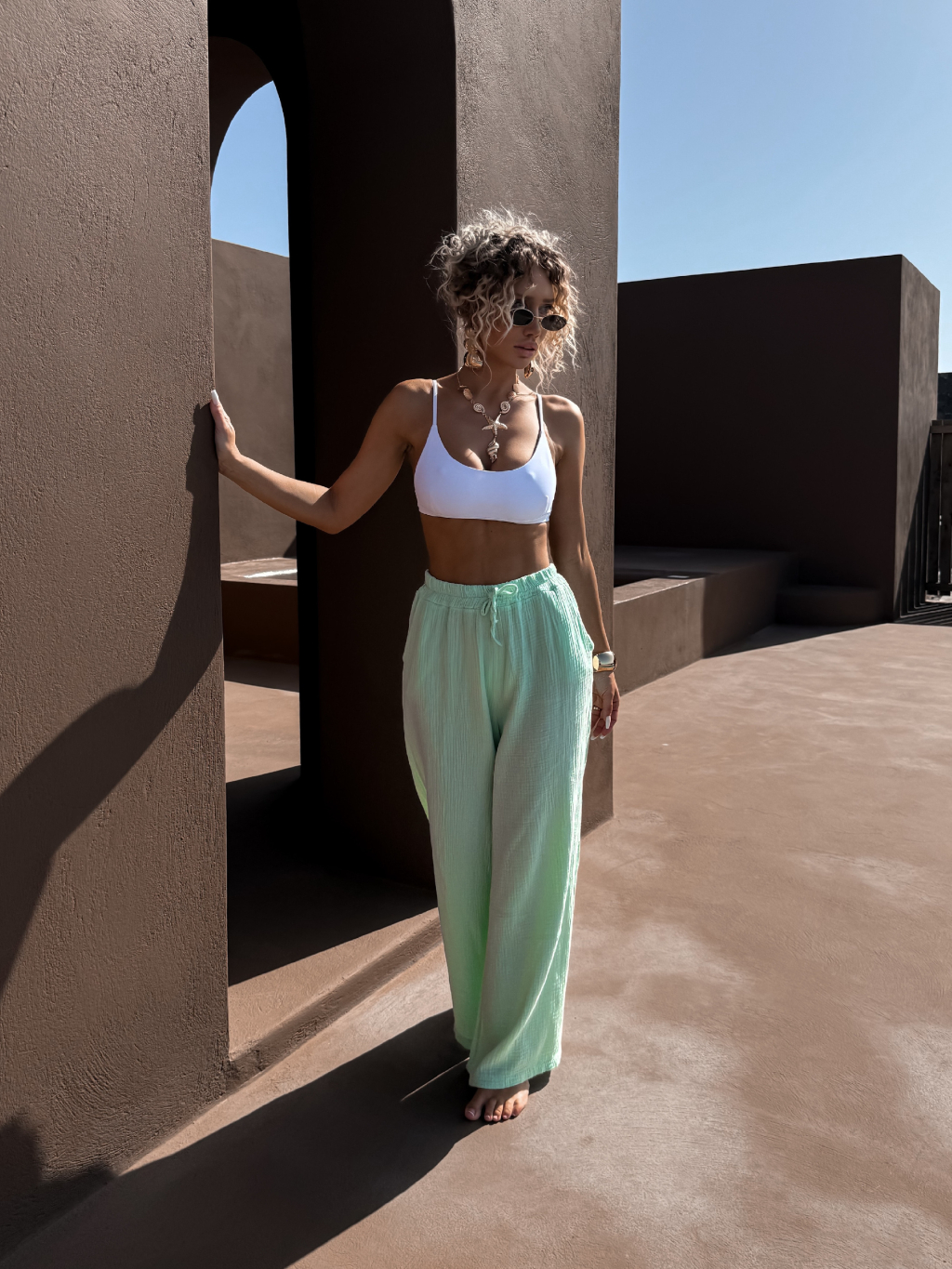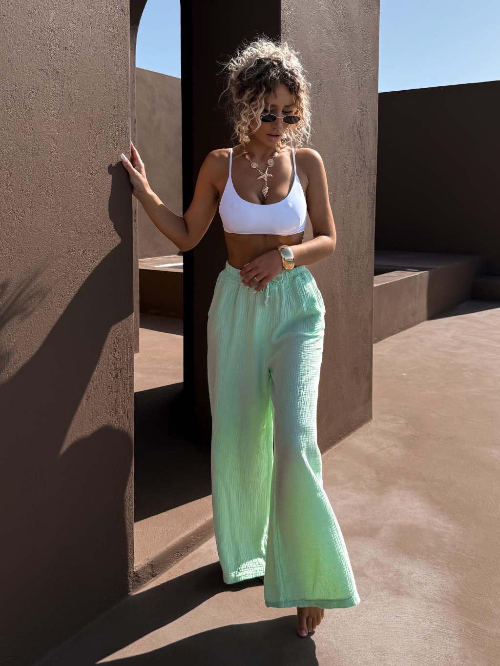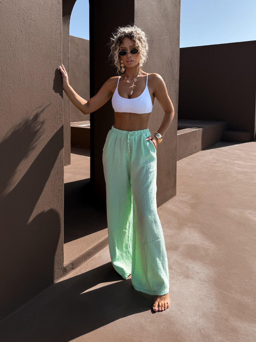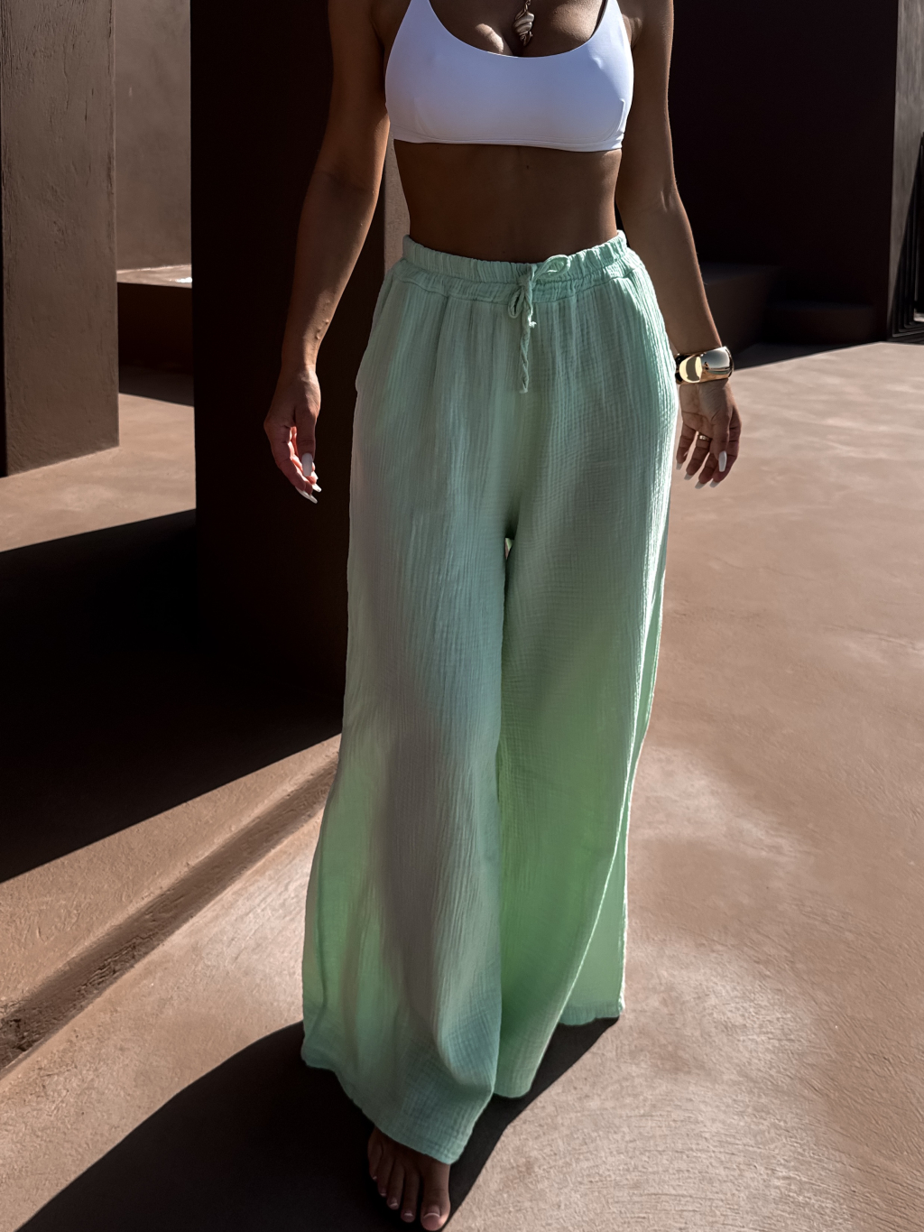 Svetlo zelená široké mušelínové nohavice KONOVE