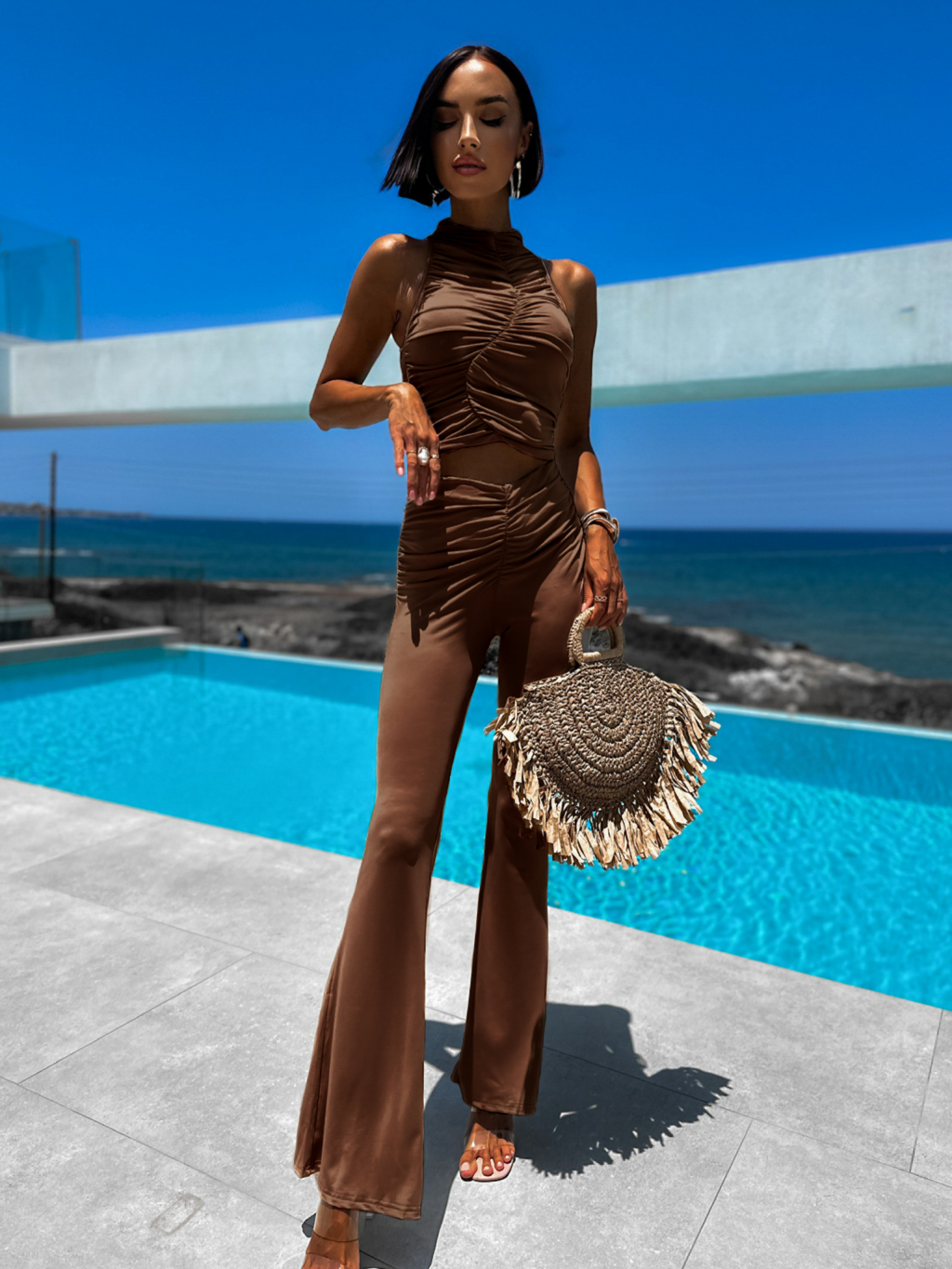 Tmavo hnedý elegantný dvojdielny komplet COLENS s vrásnením