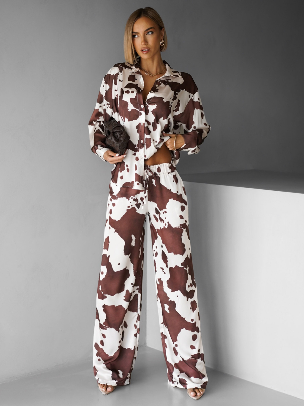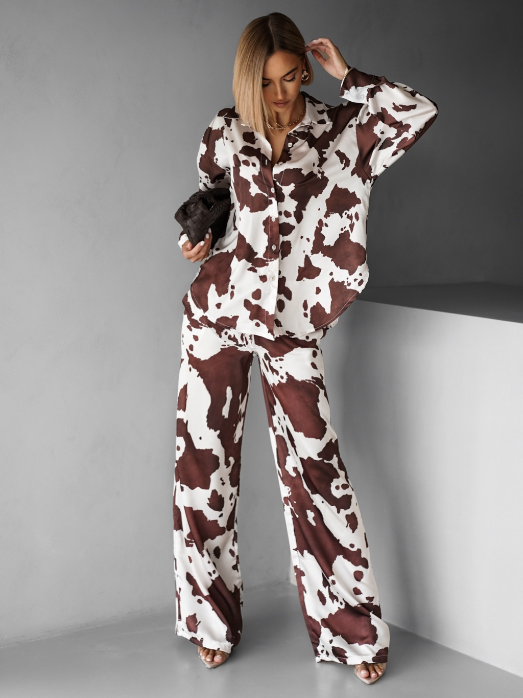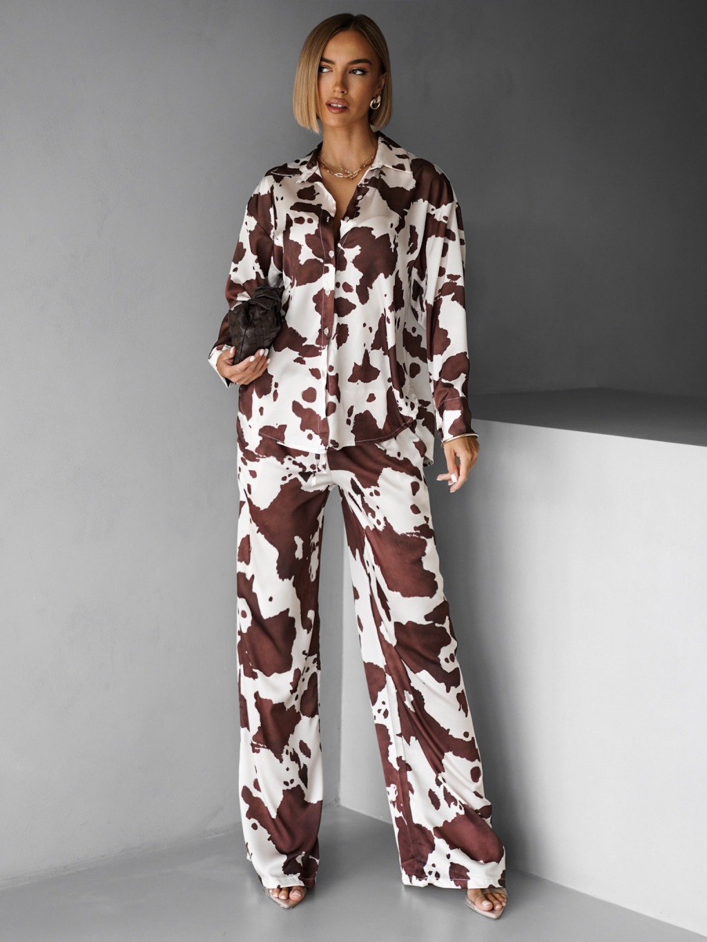 Hnedý nohavicový saténový komplet MOULETA s kravím vzorom