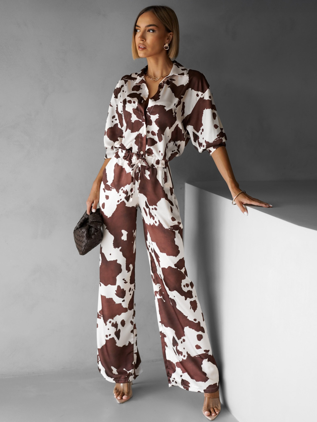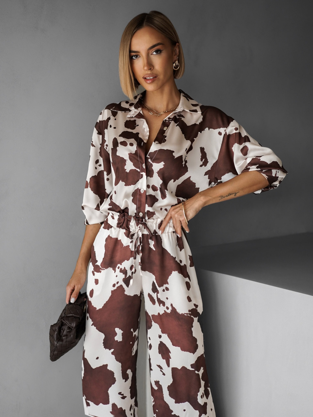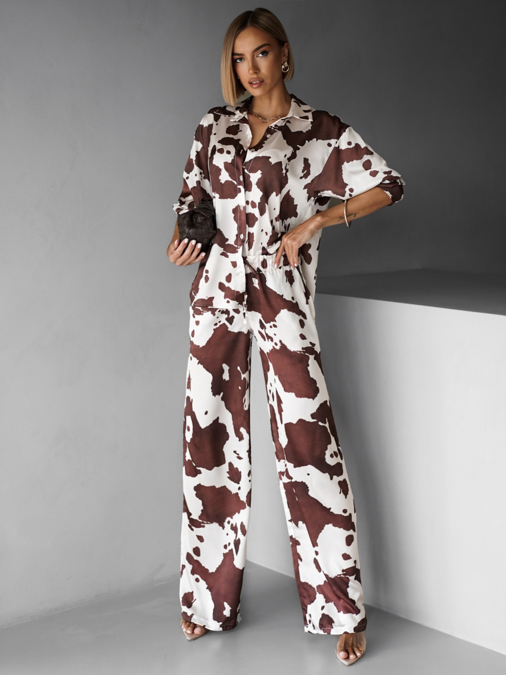 Hnedý nohavicový saténový komplet MOULETA s kravím vzorom