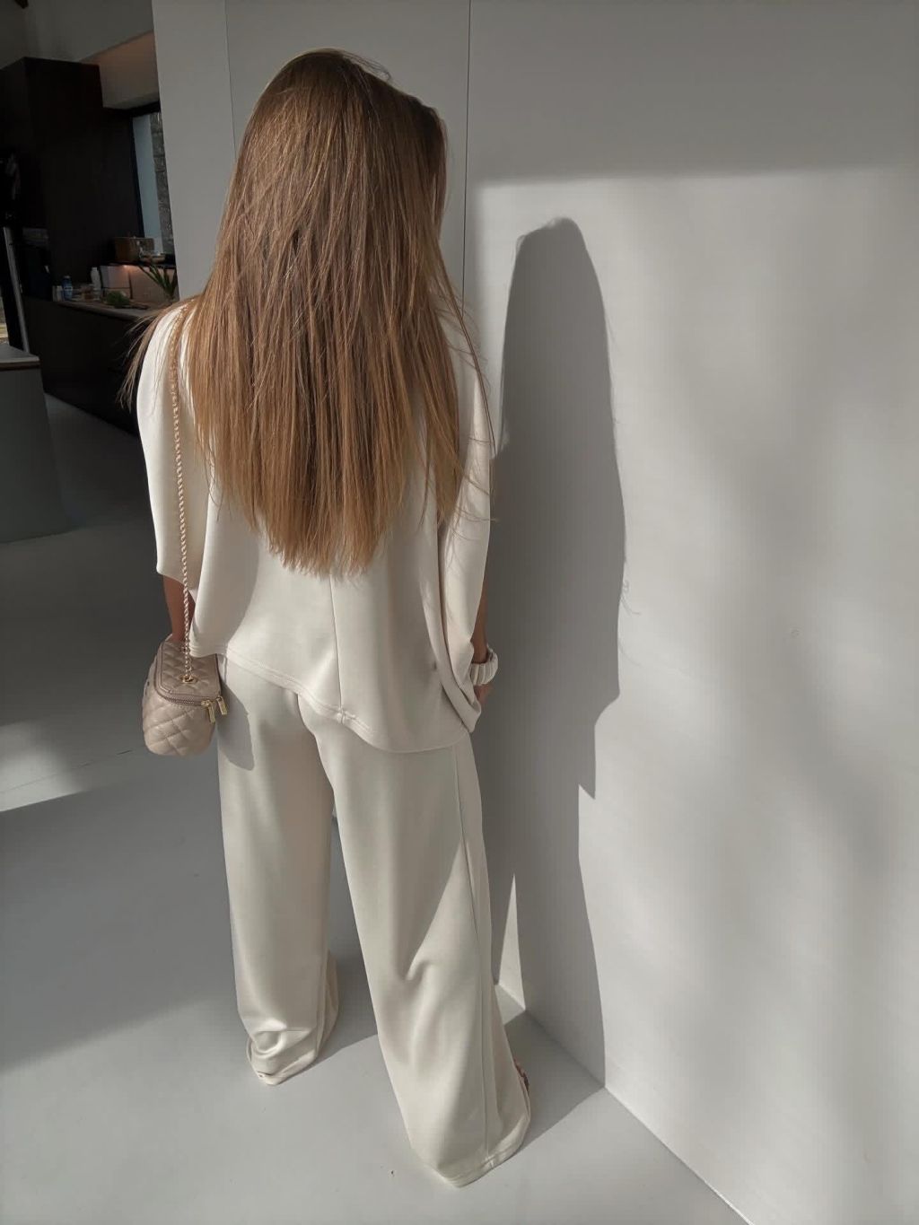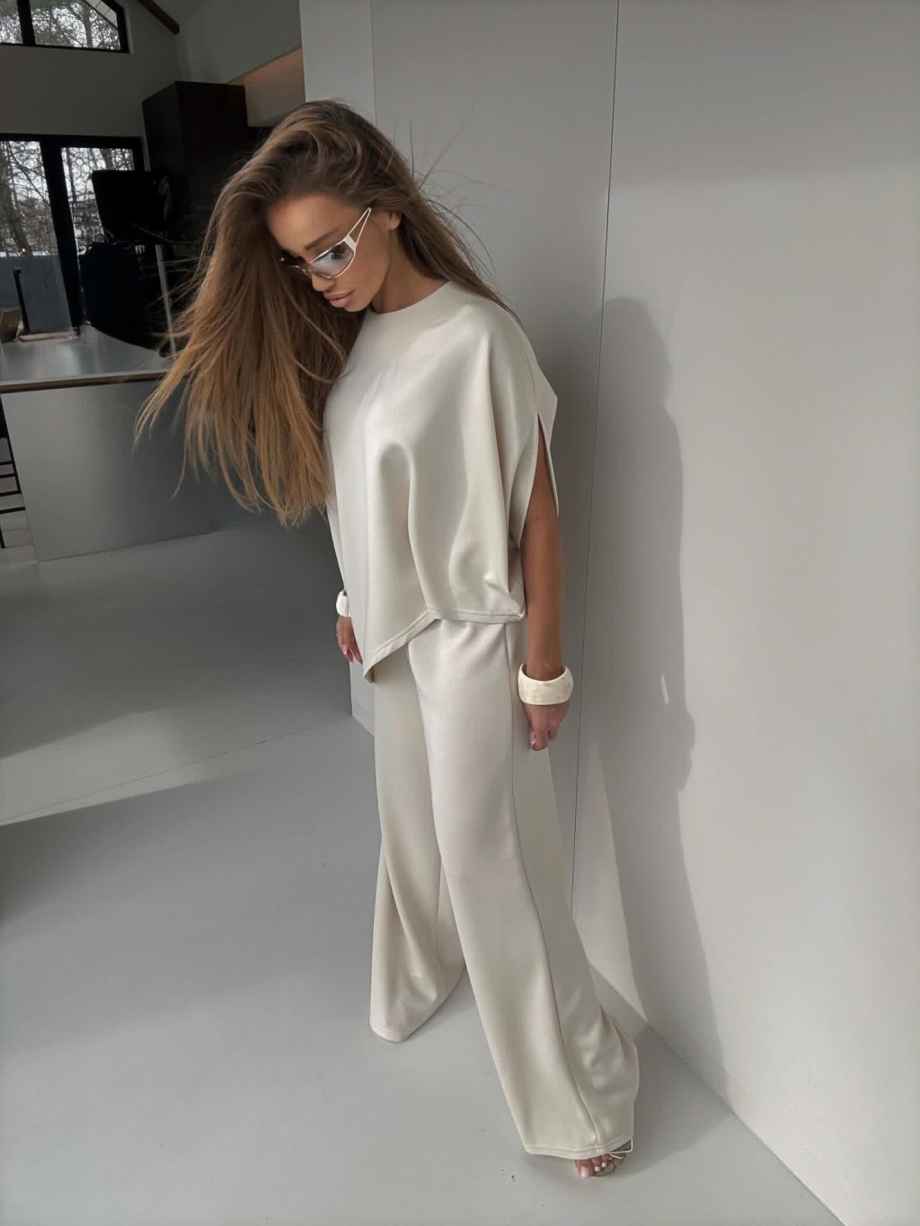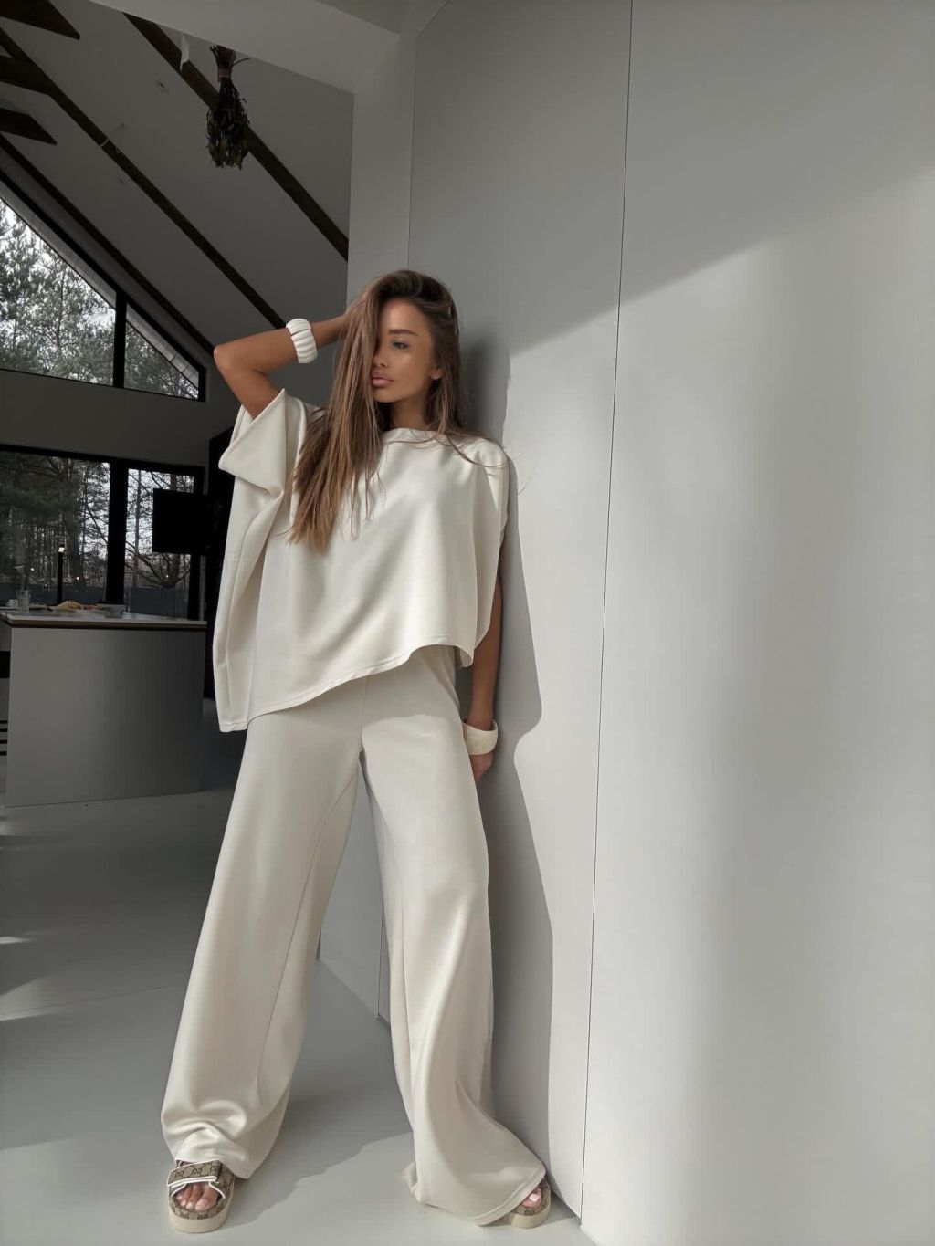 Krémový nohavicový elegantný dlhý komplet ECRIA