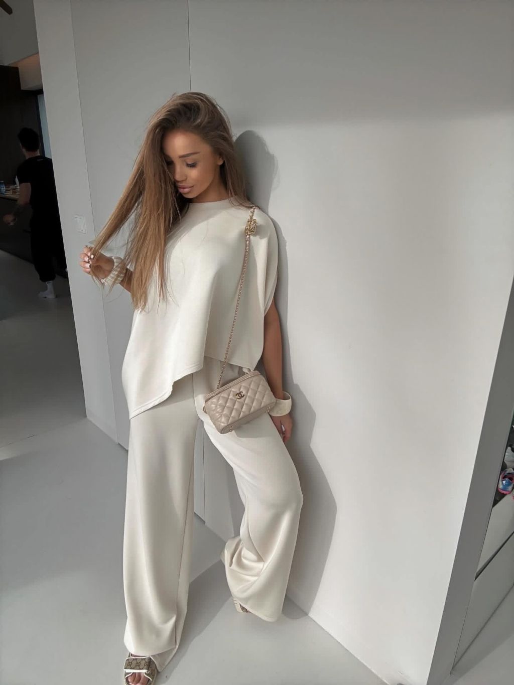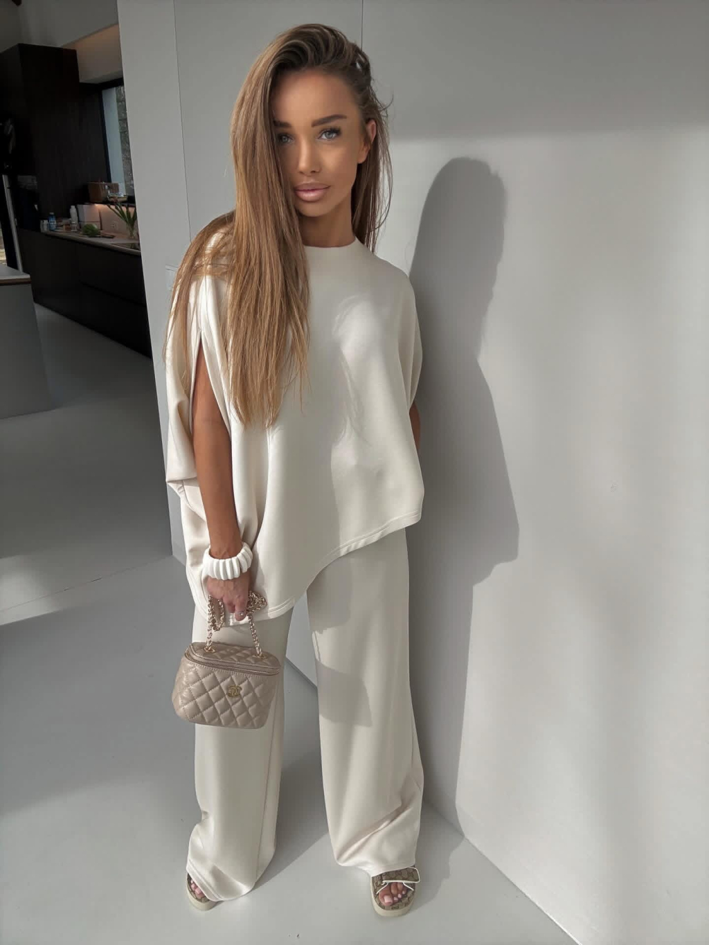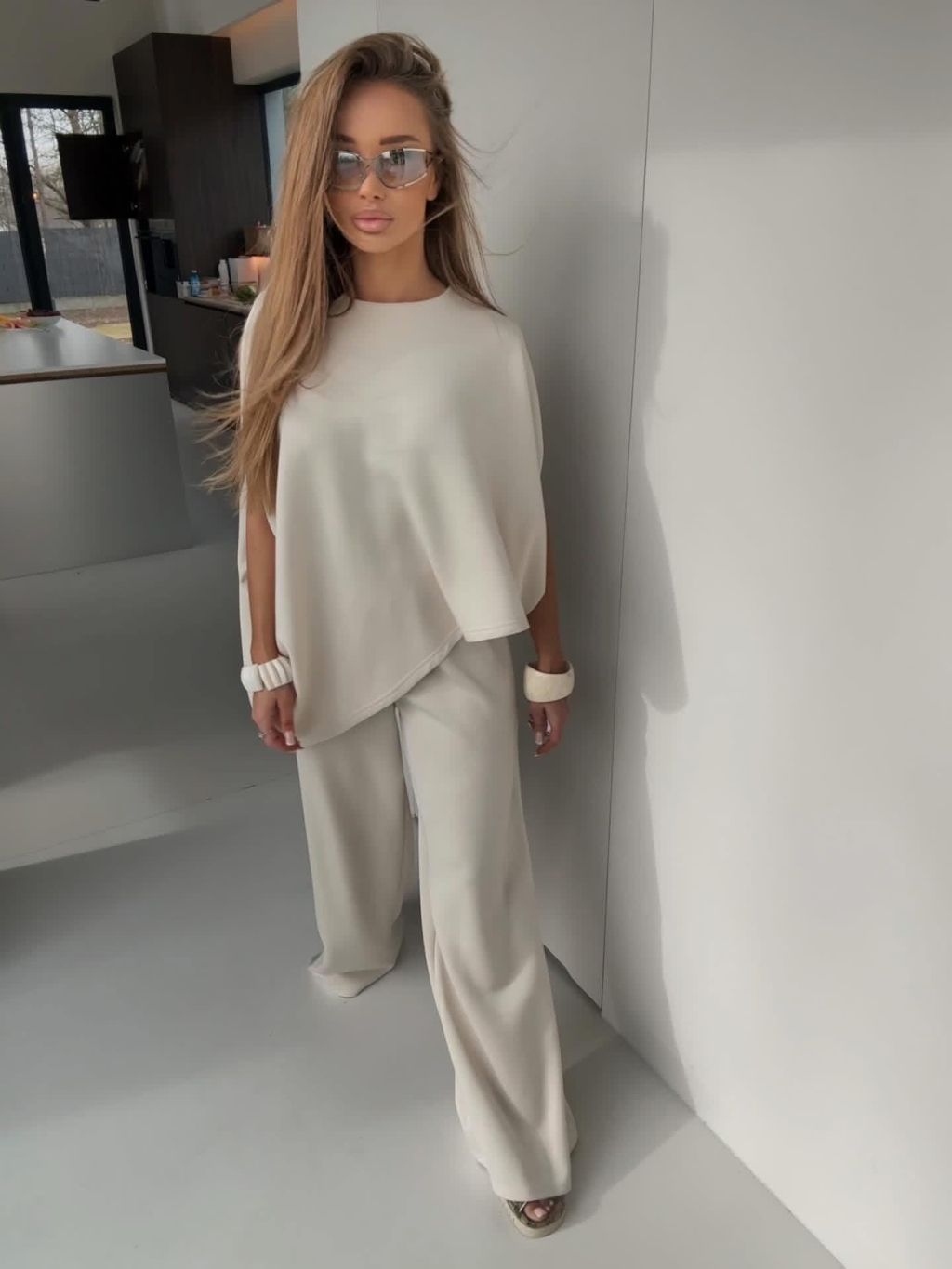 Krémový nohavicový elegantný dlhý komplet ECRIA
