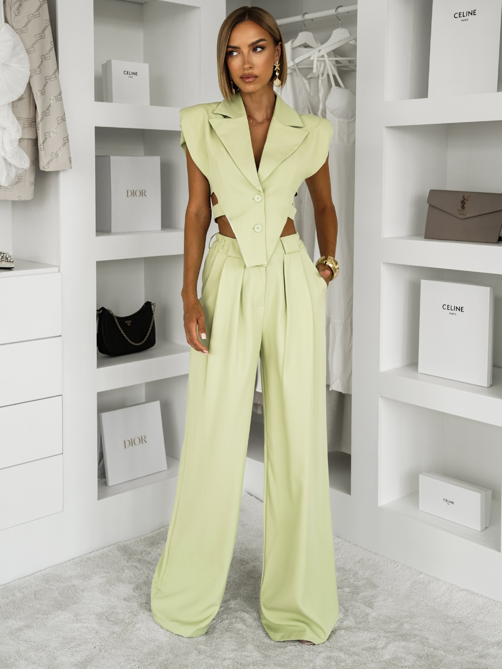 Svetlo zelený elegantný nohavicový kostým ARVENOX