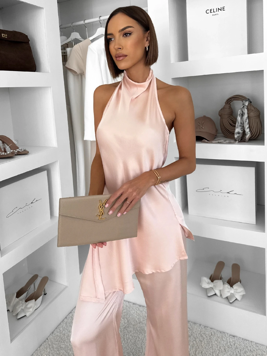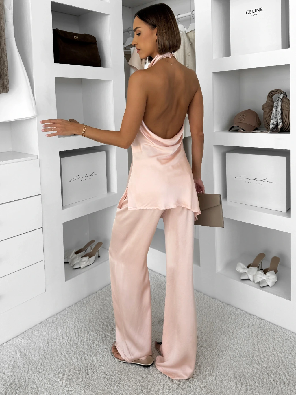Svetloružový saténový elegantný nohavicový komplet ZATOURA