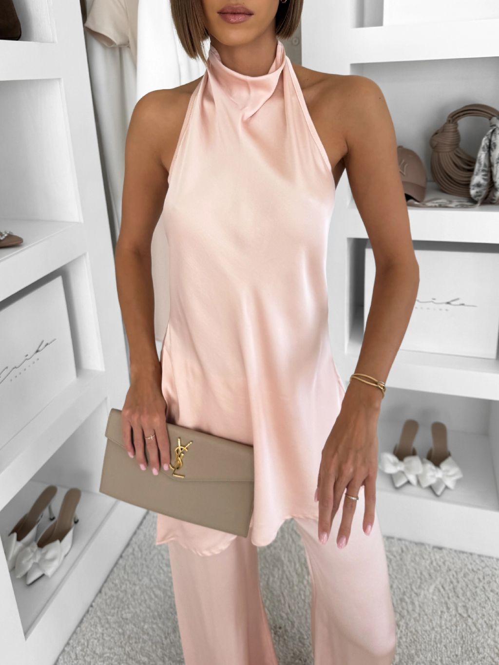 Svetloružový saténový elegantný nohavicový komplet ZATOURA