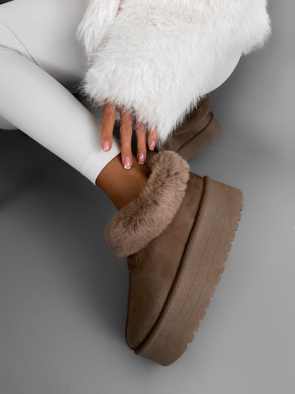 Hnedé válenky SONIA s vysokou podrážkou a bielym kožúškom