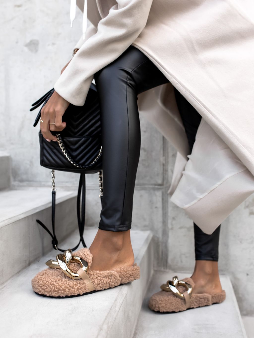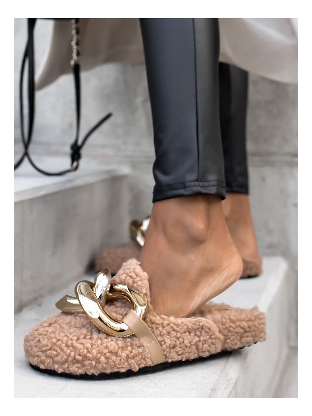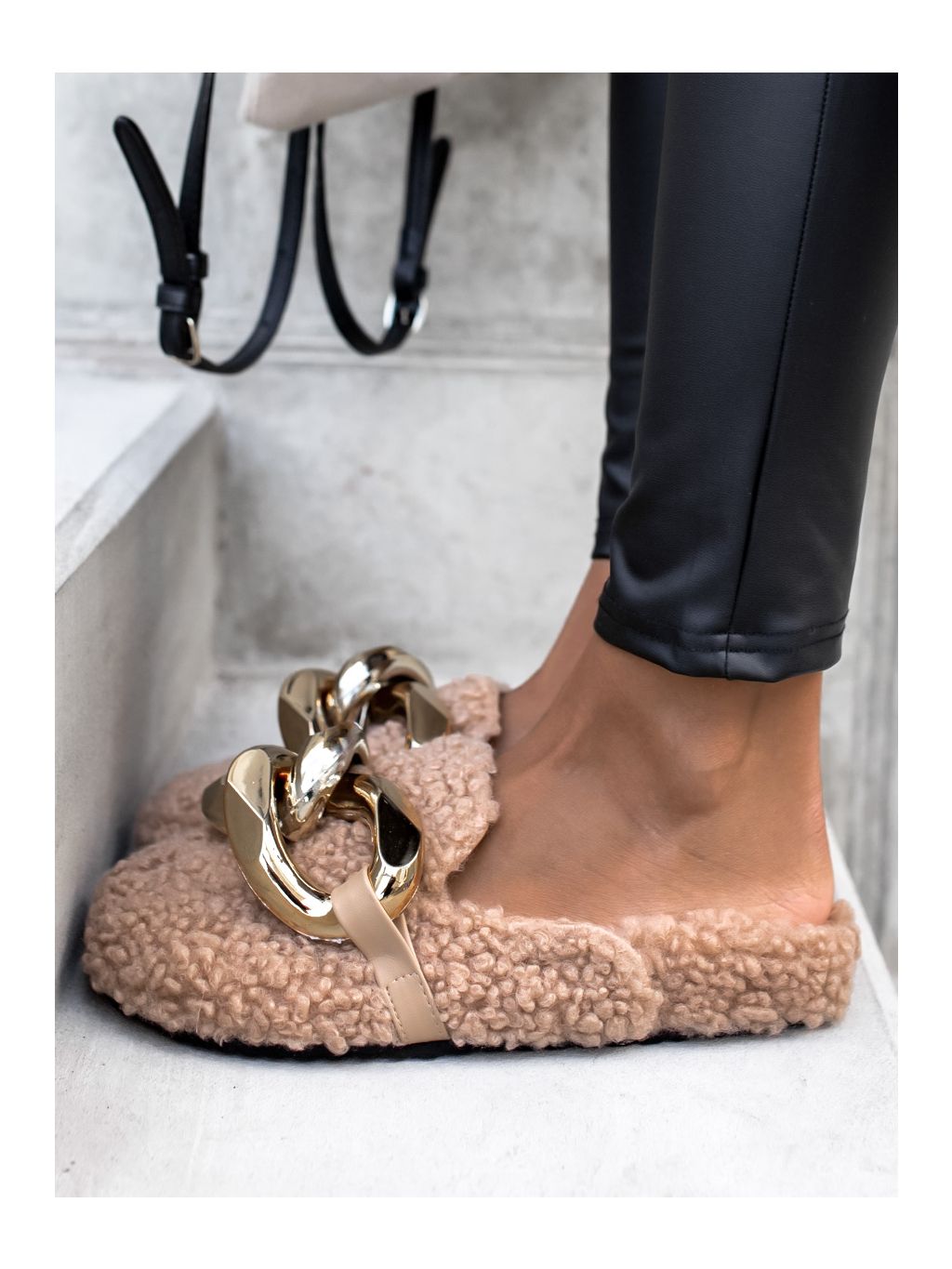 Hnedé chlpaté šľapky HUGGIE so zlatým zdobením