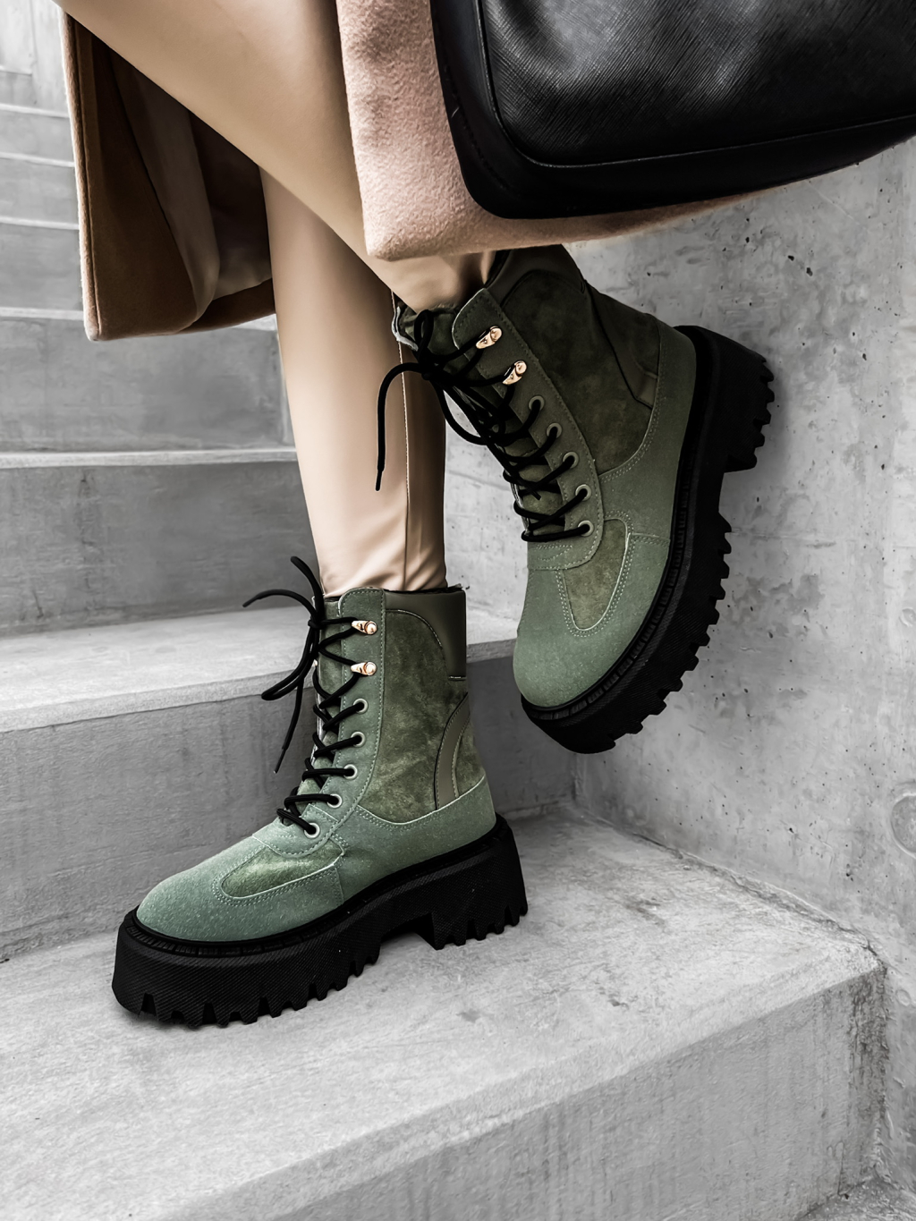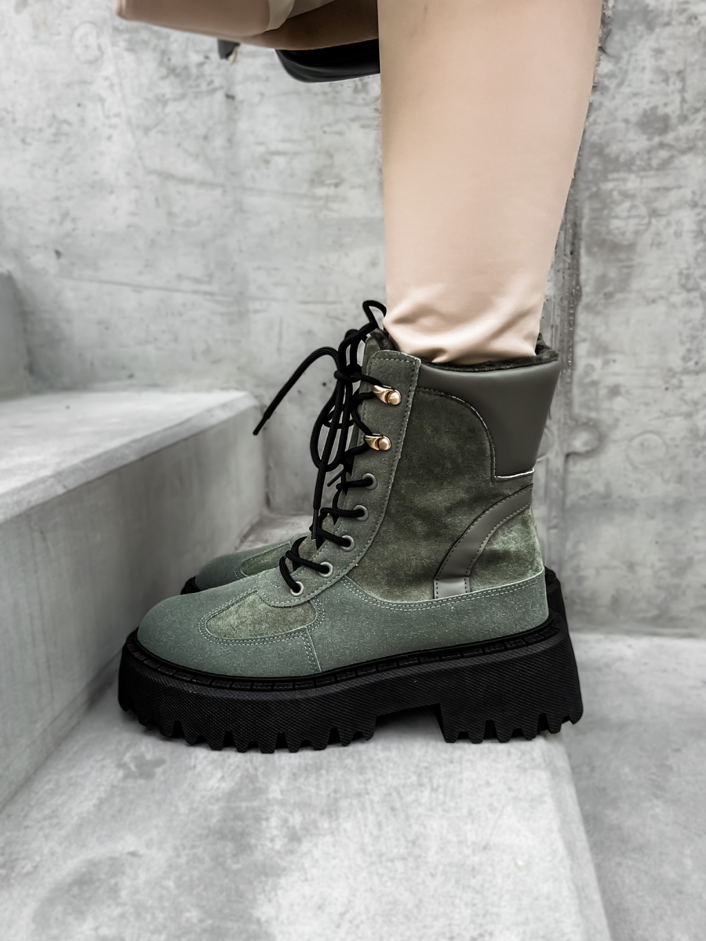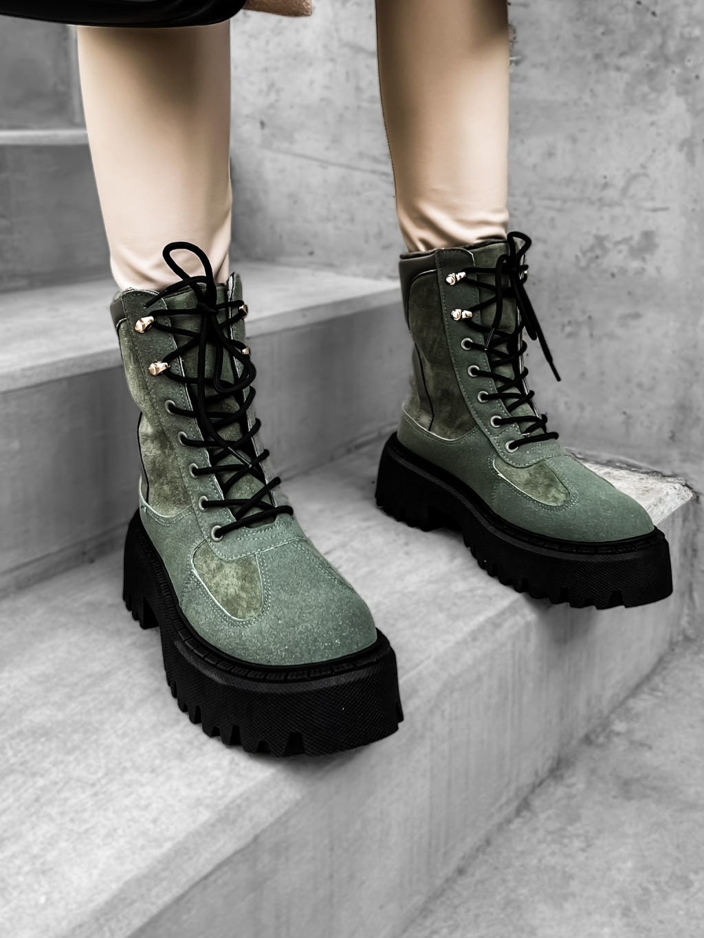 Khaki semišové členkové topánky GROVEY s vysokou podrážkou