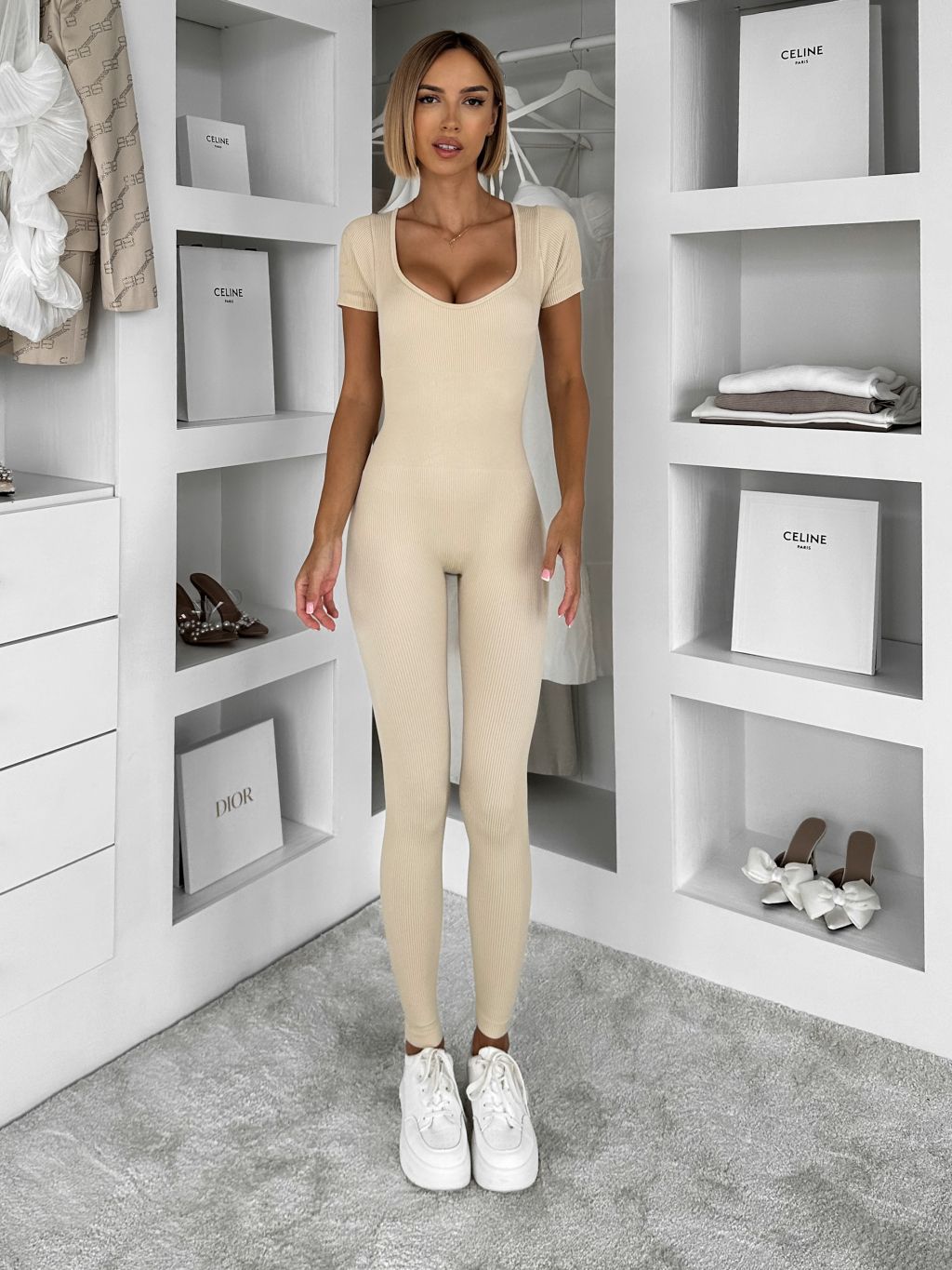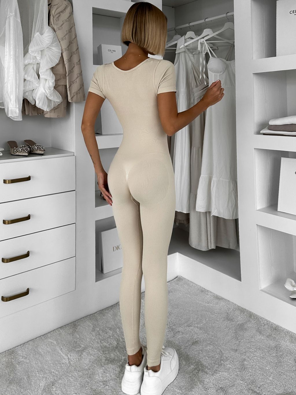 Béžový tvarujúci overal GRAYZE s krátkym rukávom