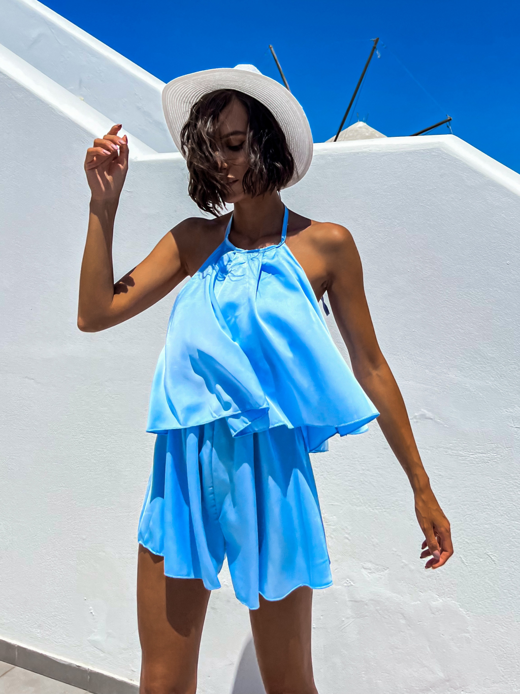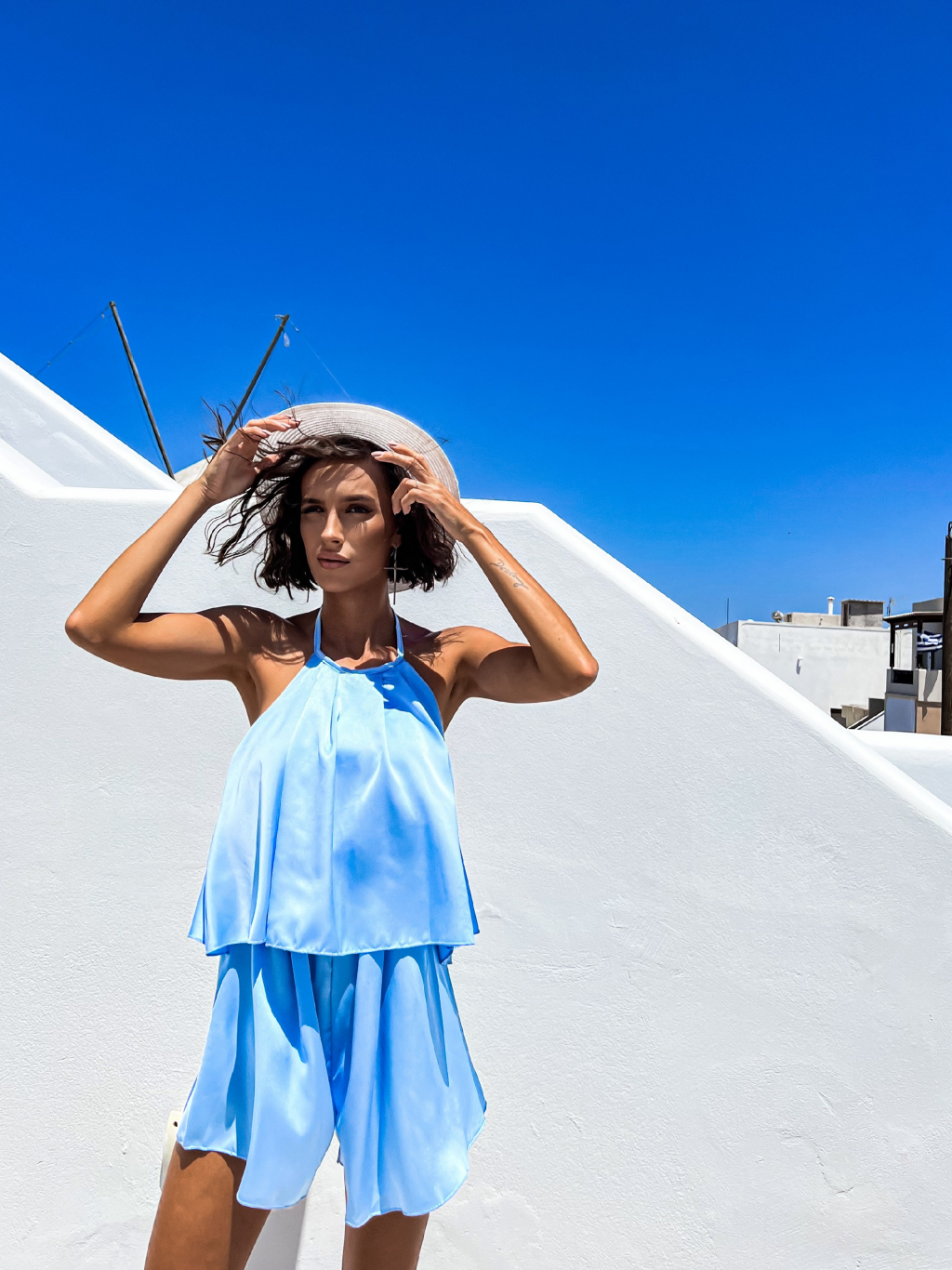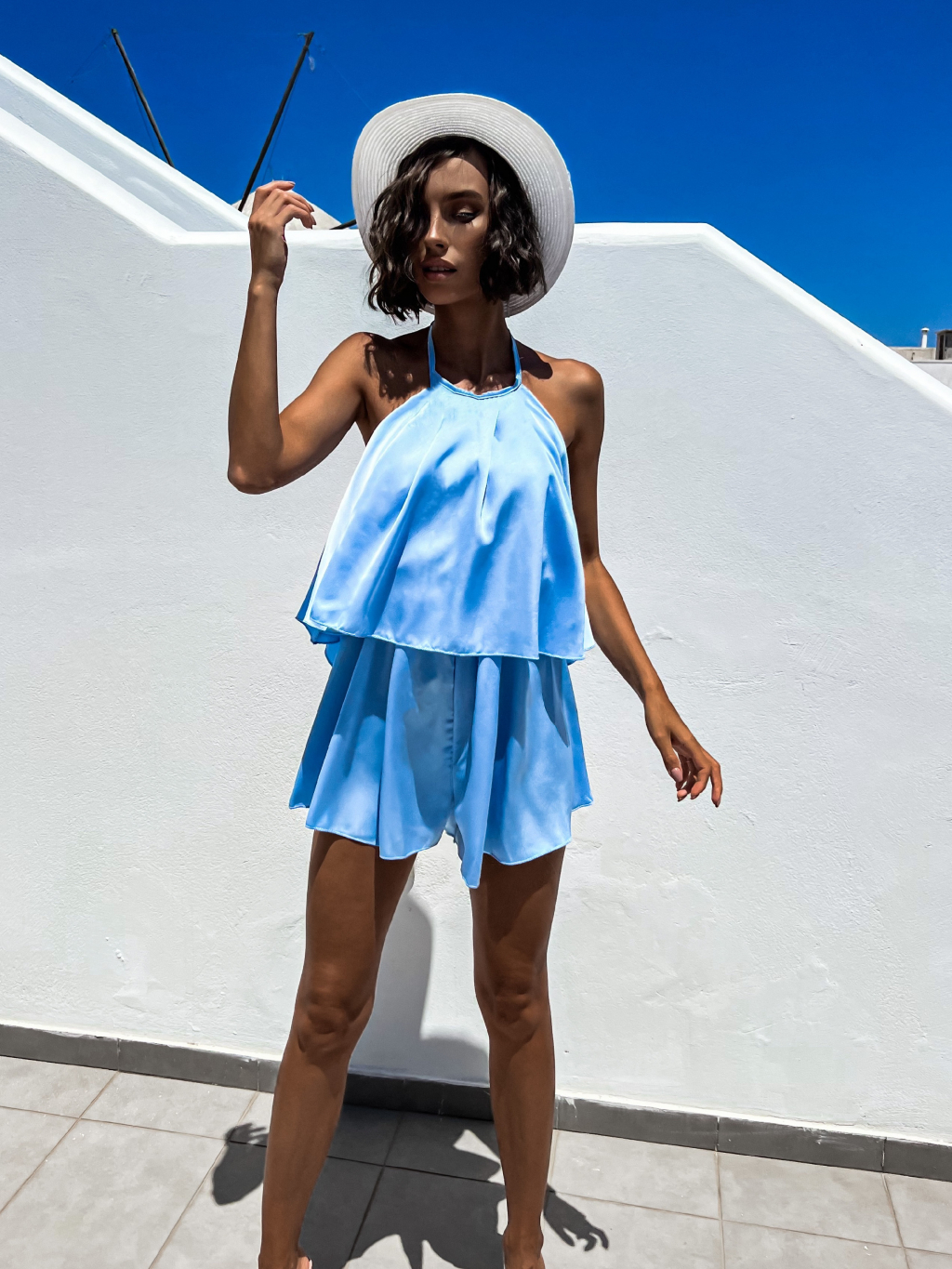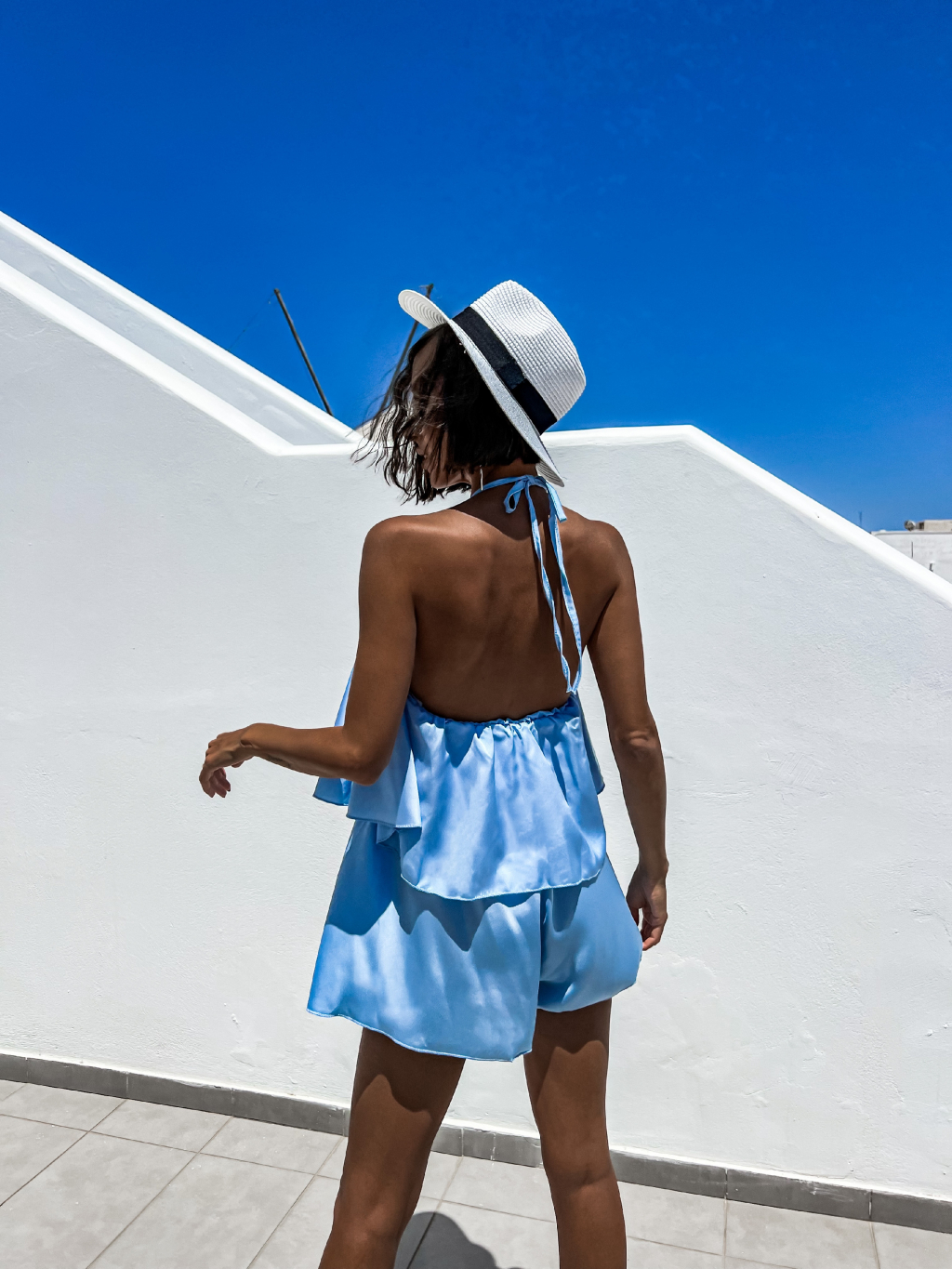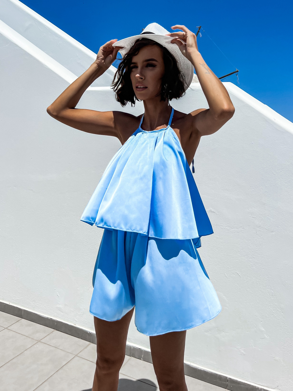 Svetlo modrý volánikový overal RHODYE so zaväzovaním za krk
