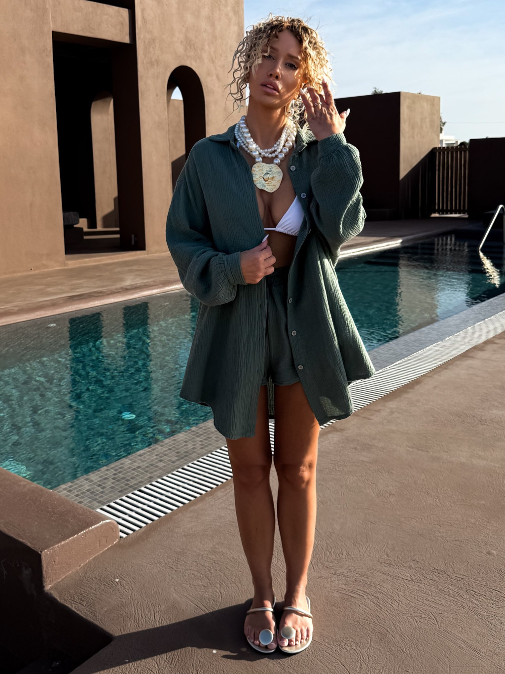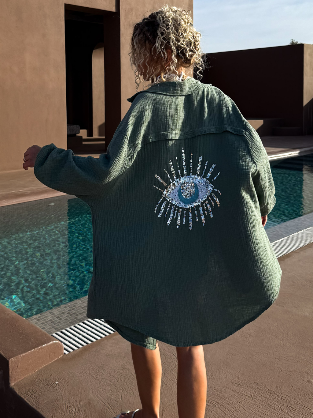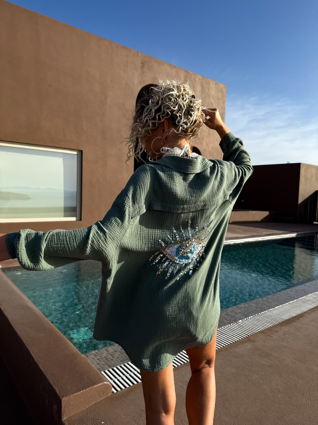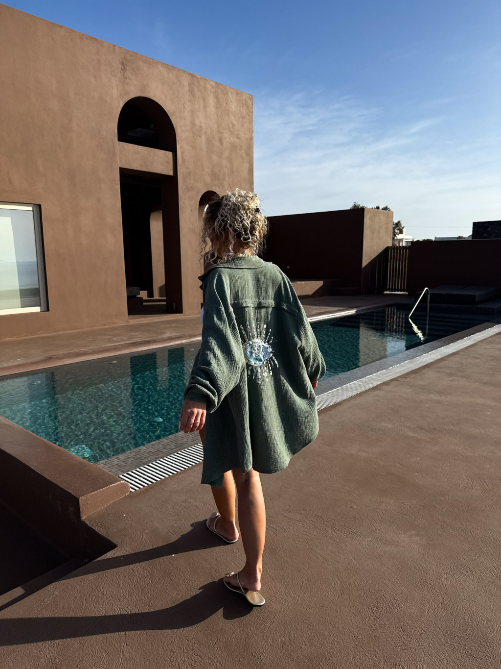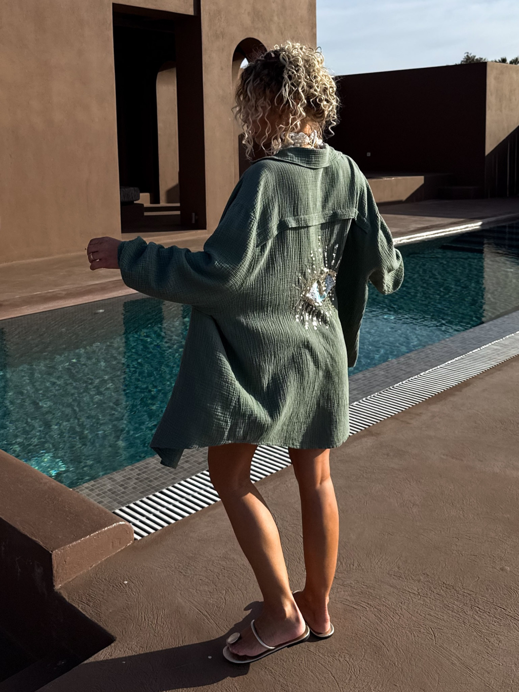 Khaki mušelínová oversize košeľa BOGUSY s flitrami