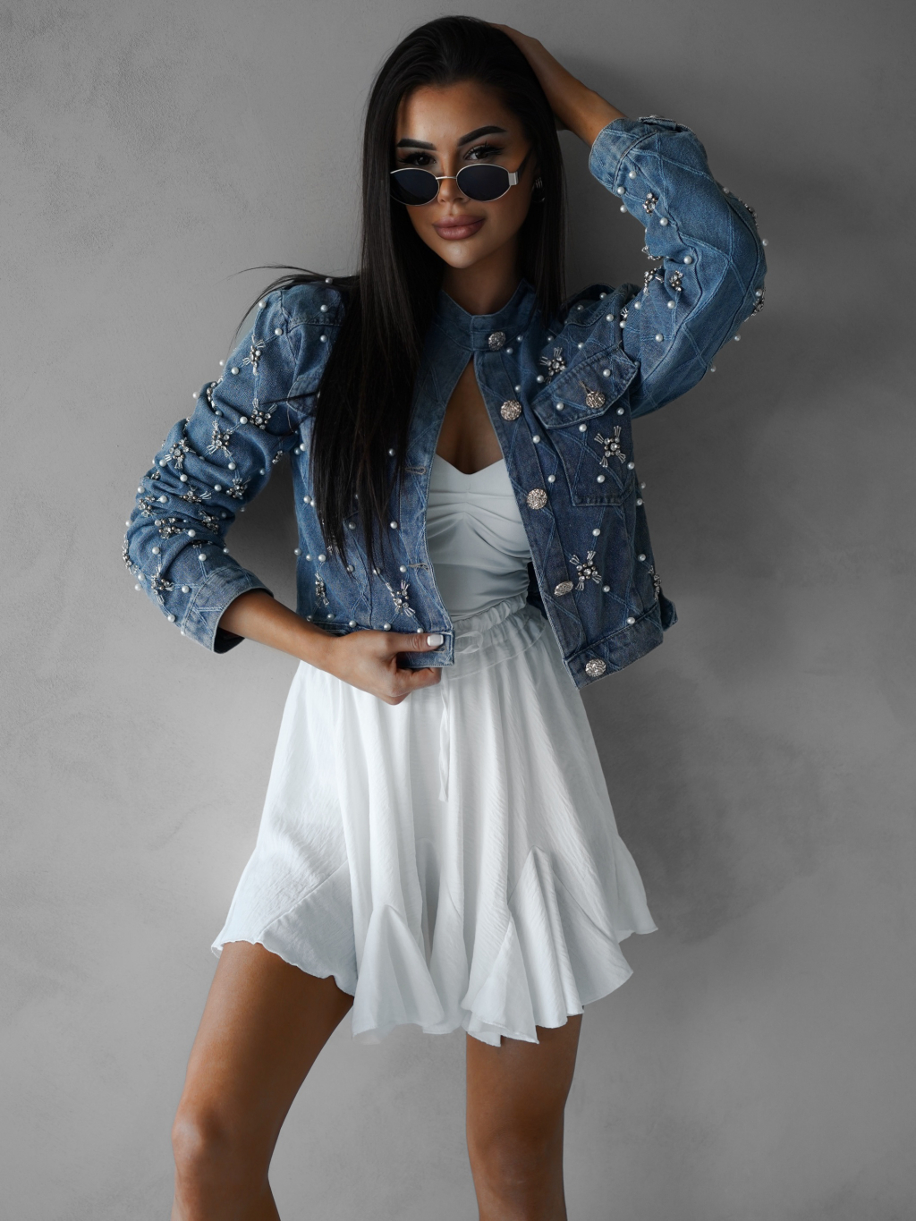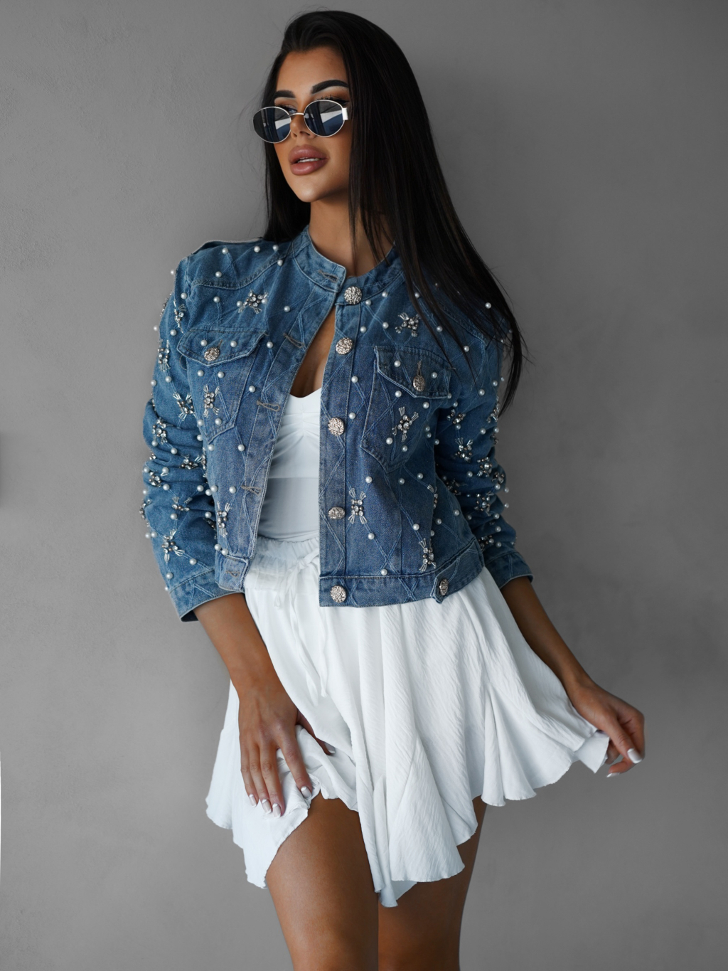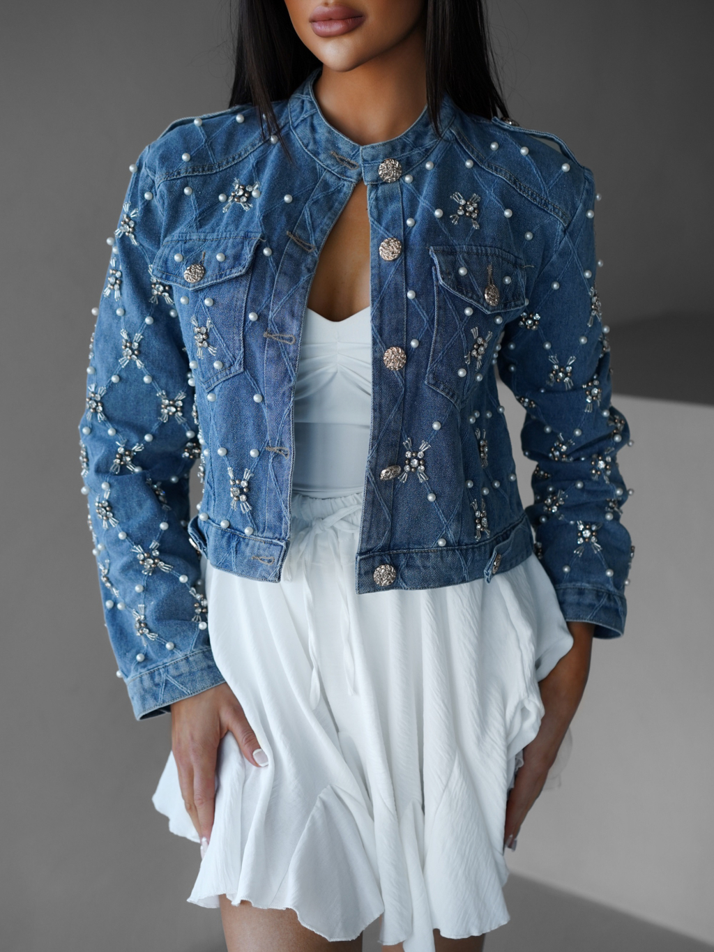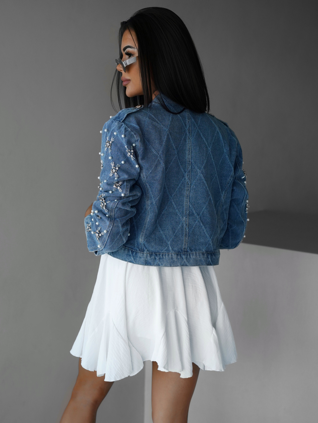 Modrá džínsová bunda ANDELIN s perličkami