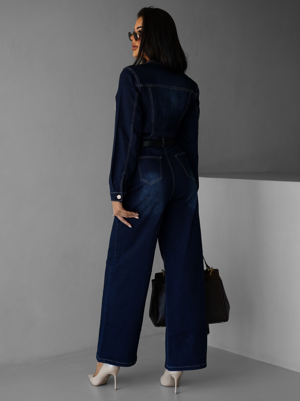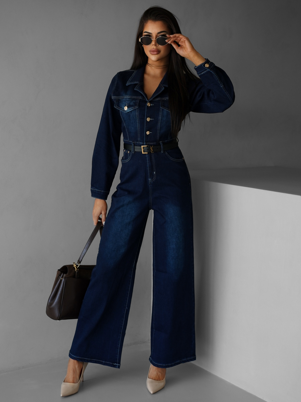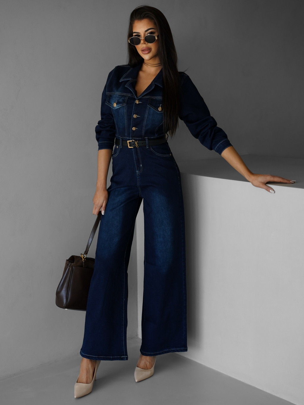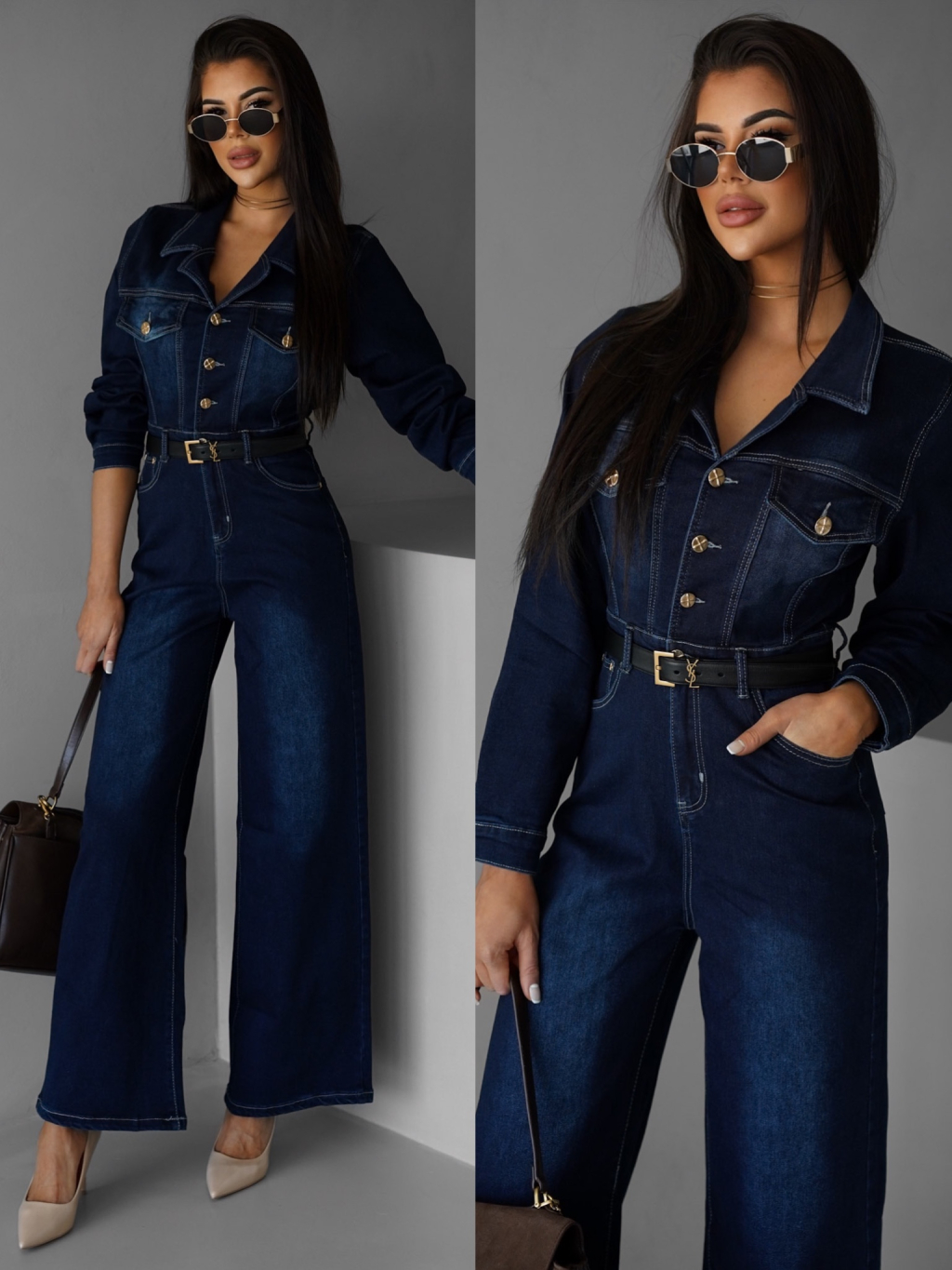 Tmavo modrý džínsový dlhý overal SOUAN s dlhým rukávom
