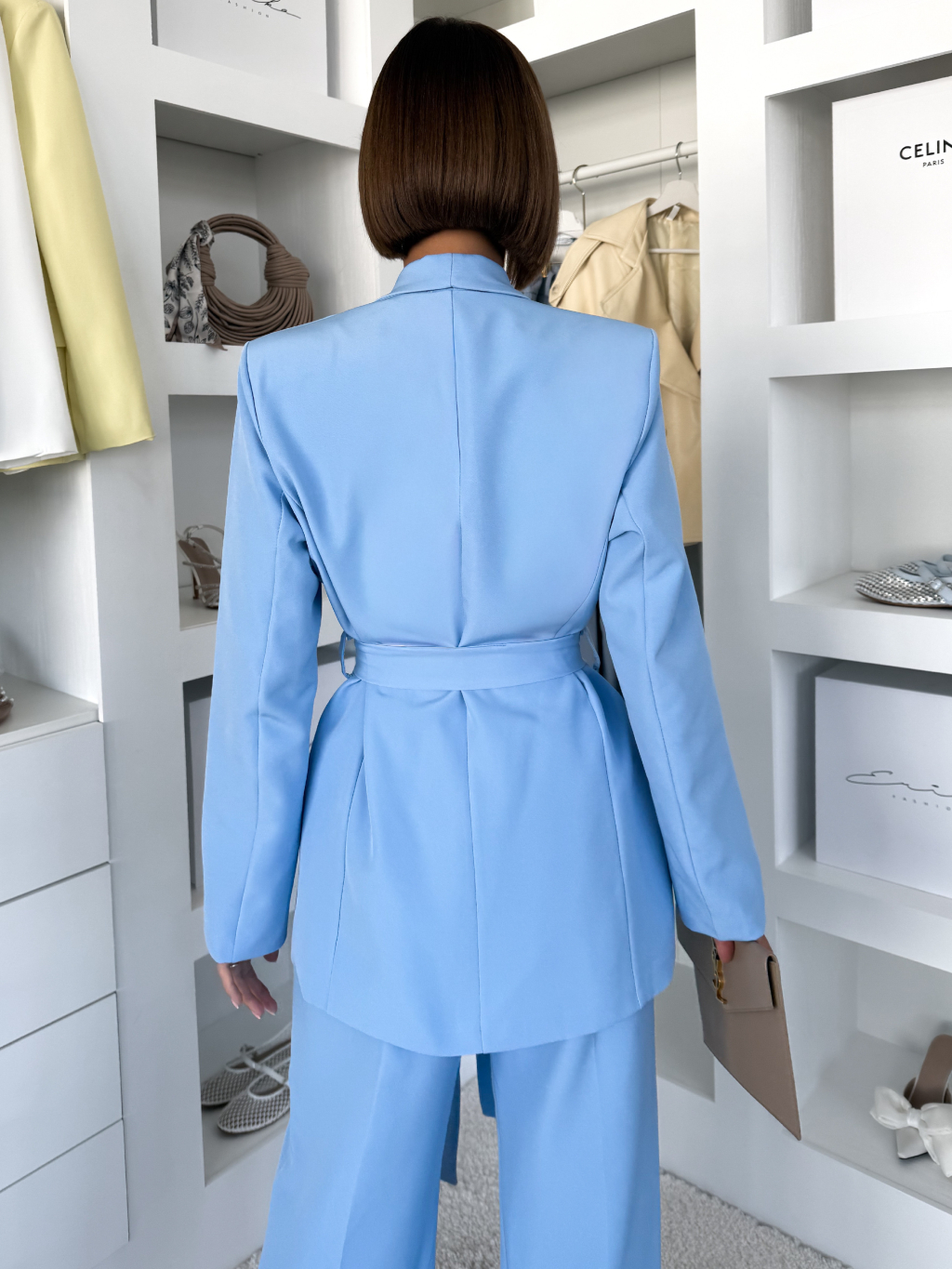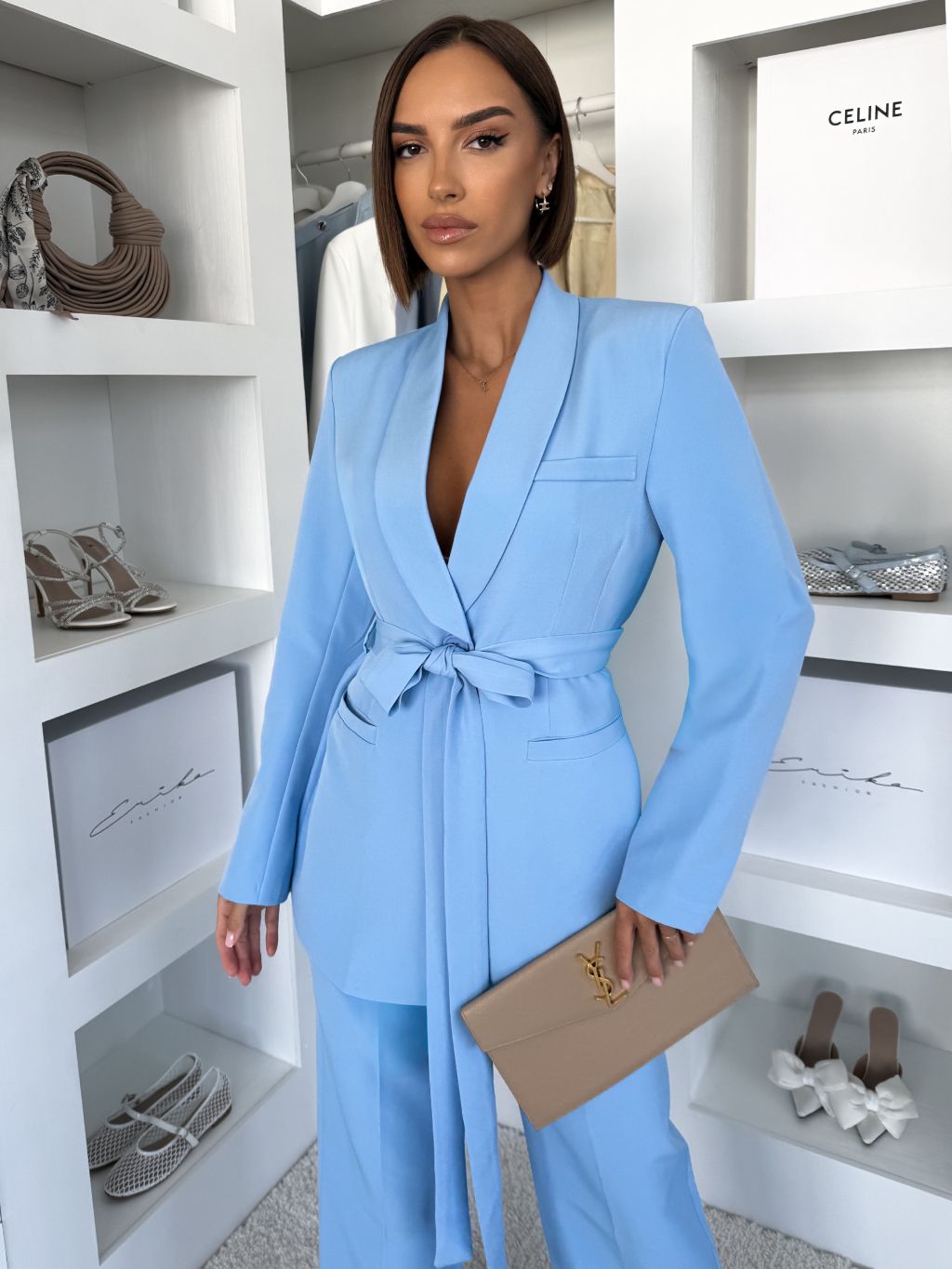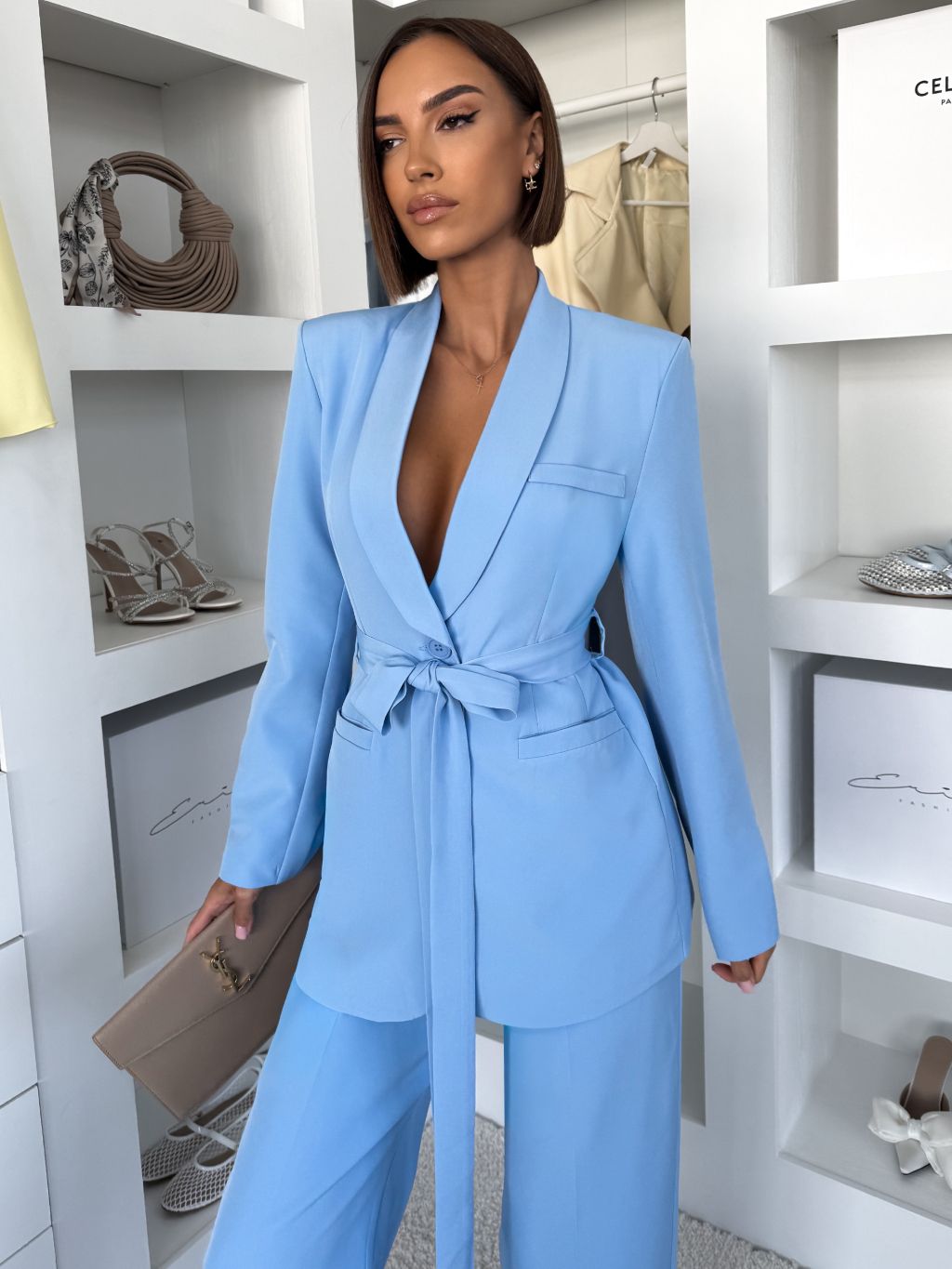 Modré elegantné sako THELYA so zaväzovaním
